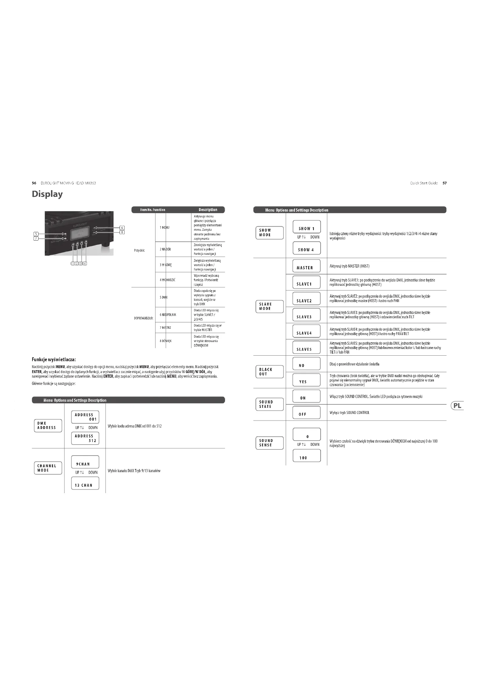Öka tiden för lampanvändning från 0 F I R M W A R E V E R S I O N V 1 . 2 Versionsnummer är V1.2 R E S E T Automatisk återställning, displaymodell Display 54 55Quick Start GuideEUROLIGHT MOVING HEAD MH363Funkcje wyświetlacza: Naciśnij przycisk MENU, aby uzyskać dostęp do opcji menu, naciskaj przycisk MENU, aby przełączać elementy menu. Naciśnij przycisk ENTER, aby uzyskać dostęp do żądanych funkcji, a wyświetlacz zacznie migać, a następnie użyj przycisków W GÓRĘ/W DÓŁ, aby nawigować i wybierać żądane ustawienie. Naciśnij ENTER, aby zapisać i potwierdzić lub naciśnij MENU, aby wrócić bez zapisywania. Główne funkcje są następujące: Menu Options and Settings Description D M X A D D R E S S UP ↑↓ DOWN Wybór kodu adresu DMX od 001 do 512 C H A N N E L M O D E UP ↑↓ DOWN Wybór kanału DMX Tryb 9/13 kanałów A D D R E S S