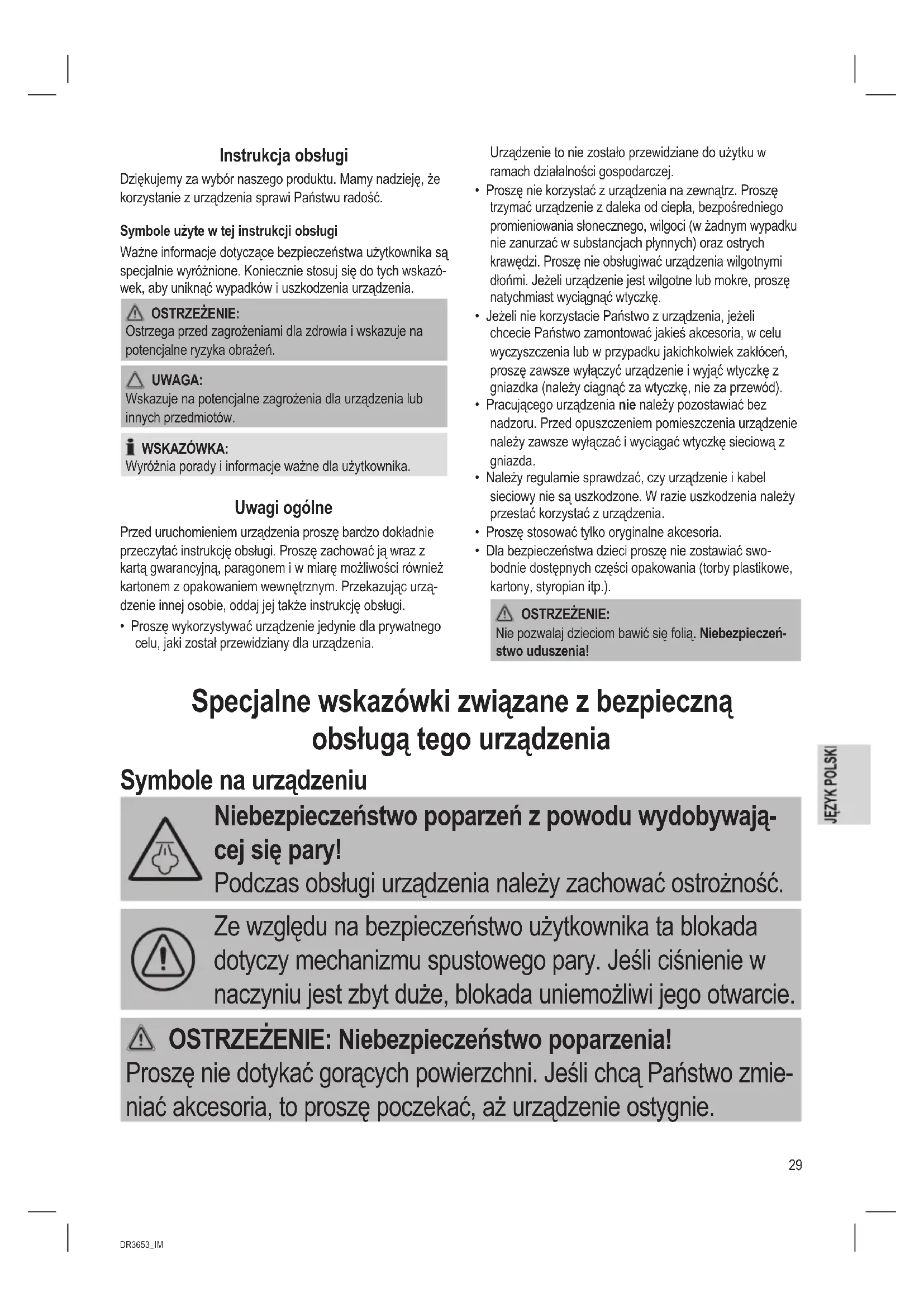 - Dla bezpieczeństwa dzieci proszę nie zostawiać swo- bodnie dostępnych części opakowania (torby plastikowe, kartony, styropian itp.). OSTRZEŻENIE: Nie pozwalaj dzieciom bawić się folią. Niebezpieczeń- stwo uduszenia! Specjalne wskazówki związane z bezpieczną obsługą tego urządzenia Symbole na urządzeniu Niebezpieczeństwo poparzeń z powodu wydobywają- cej się pary! Podczas obsługi urządzenia należy zachować ostrożność. Ze względu na bezpieczeństwo użytkownika ta blokada dotyczy mechanizmu spustowego pary. Jeśli ciśnienie w naczyniu jest zbyt duże, blokada uniemożliwi jego otwarcie. OSTRZEŻENIE: Niebezpieczeństwo poparzenia! Proszę nie dotykać gorących powierzchni. Jeśli chcą Państwo zmie- niać akcesoria, to proszę poczekać, aż urządzenie ostygnie.30 DR3653_IM 10.02.16