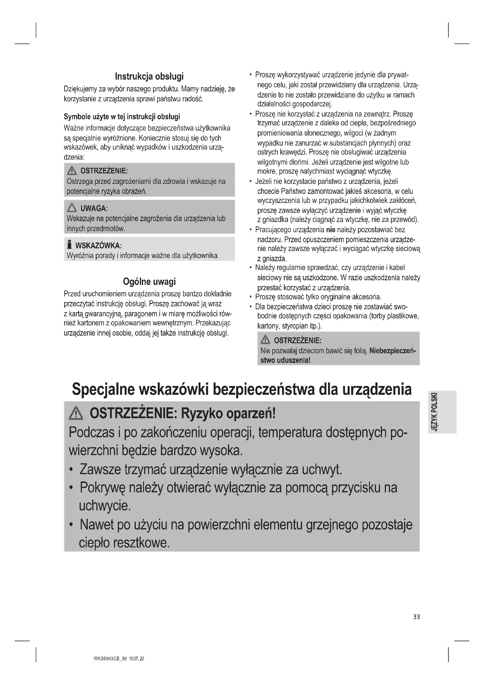 - Dla bezpieczeństwa dzieci proszę nie zostawiać swo- bodnie dostępnych części opakowania (torby plastikowe, kartony, styropian itp.). OSTRZEŻENIE: Nie pozwalaj dzieciom bawić się folią. Niebezpieczeń- stwo uduszenia! Specjalne wskazówki bezpieczeństwa dla urządzenia OSTRZEŻENIE: Ryzyko oparzeń! Podczas i po zakończeniu operacji, temperatura dostępnych po- wierzchni będzie bardzo wysoka.