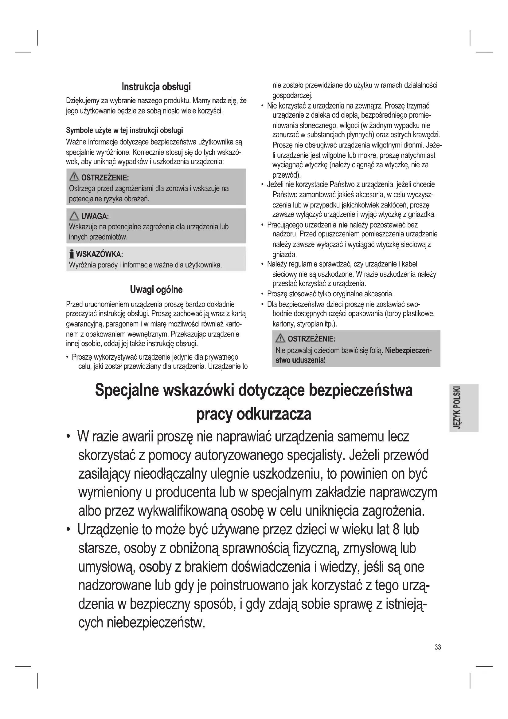 - Dla bezpieczeństwa dzieci proszę nie zostawiać swo- bodnie dostępnych części opakowania (torby plastikowe, kartony, styropian itp.). OSTRZEŻENIE: Nie pozwalaj dzieciom bawić się folią. Niebezpieczeń- stwo uduszenia! Specjalne wskazówki dotyczące bezpieczeństwa pracy odkurzacza