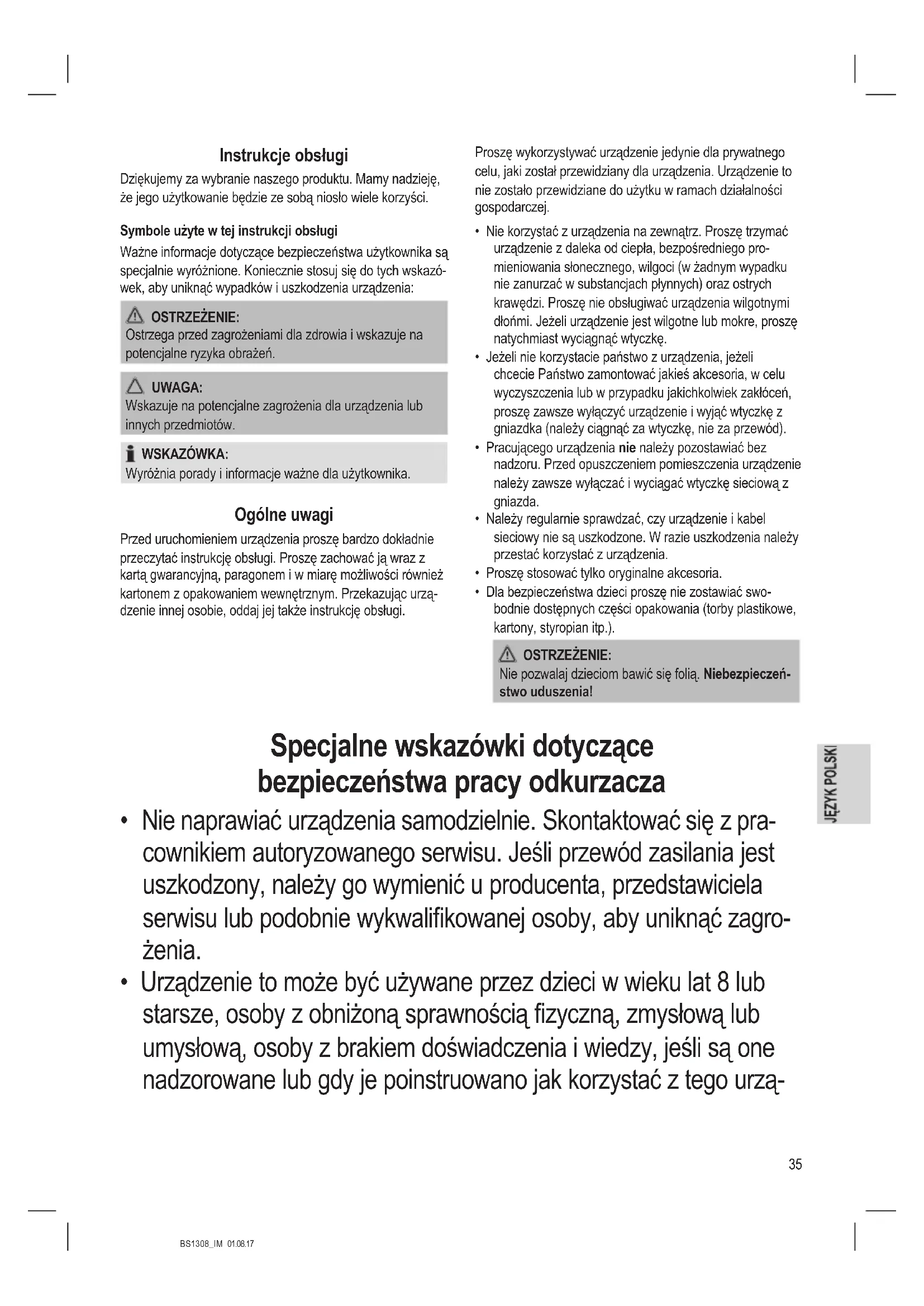 - Ecodesign requirements for vacuum cleaners COMMIS- SION REGULATION (EU) No 666 / 201334 BS1308_IM 01.08.17 Disposal Meaning of the “Dustbin” Symbol Protect our environment: do not dispose of elec- trical equipment in the domestic waste. Please return any electrical equipment that you will no longer use to the collection points provided for their disposal. This helps avoid the potential effects of incorrect disposal on the environment and human health. This will contribute to the recycling and other forms of reutili- sation of electrical and electronic equipment. Information concerning where the equipment can be dis- posed of can be obtained from your local authority.35 BS1308_IM 01.08.17 Instrukcje obsługi Dziękujemy za wybranie naszego produktu. Mamy nadzieję, że jego użytkowanie będzie ze sobą niosło wiele korzyści. Symbole użyte w tej instrukcji obsługi Ważne informacje dotyczące bezpieczeństwa użytkownika są specjalnie wyróżnione. Koniecznie stosuj się do tych wskazó- wek, aby uniknąć wypadków i uszkodzenia urządzenia: OSTRZEŻENIE: Ostrzega przed zagrożeniami dla zdrowia i wskazuje na potencjalne ryzyka obrażeń. UWAGA: Wskazuje na potencjalne zagrożenia dla urządzenia lub innych przedmiotów. WSKAZÓWKA: Wyróżnia porady i informacje ważne dla użytkownika. Ogólne uwagi Przed uruchomieniem urządzenia proszę bardzo dokładnie przeczytać instrukcję obsługi. Proszę zachować ją wraz z kartą gwarancyjną, paragonem i w miarę możliwości również kartonem z opakowaniem wewnętrznym. Przekazując urzą- dzenie innej osobie, oddaj jej także instrukcję obsługi. Proszę wykorzystywać urządzenie jedynie dla prywatnego celu, jaki został przewidziany dla urządzenia. Urządzenie to nie zostało przewidziane do użytku w ramach działalności gospodarczej.