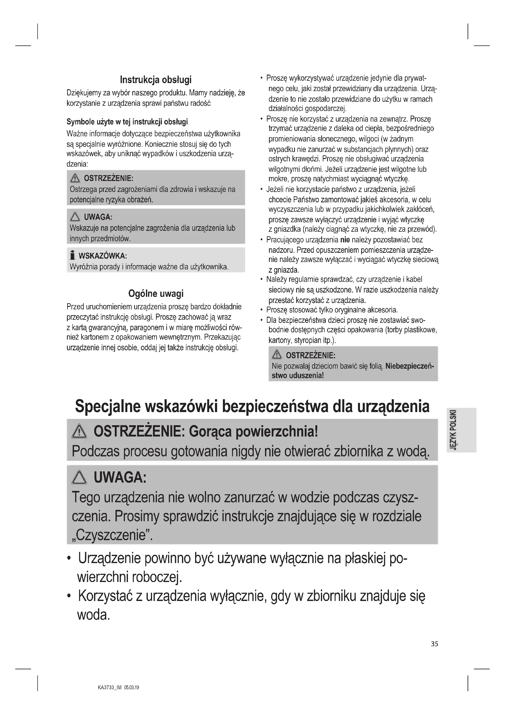- Korzystać z urządzenia wyłącznie, gdy w zbiorniku znajduje się woda.KA3733_IM 05.03.19