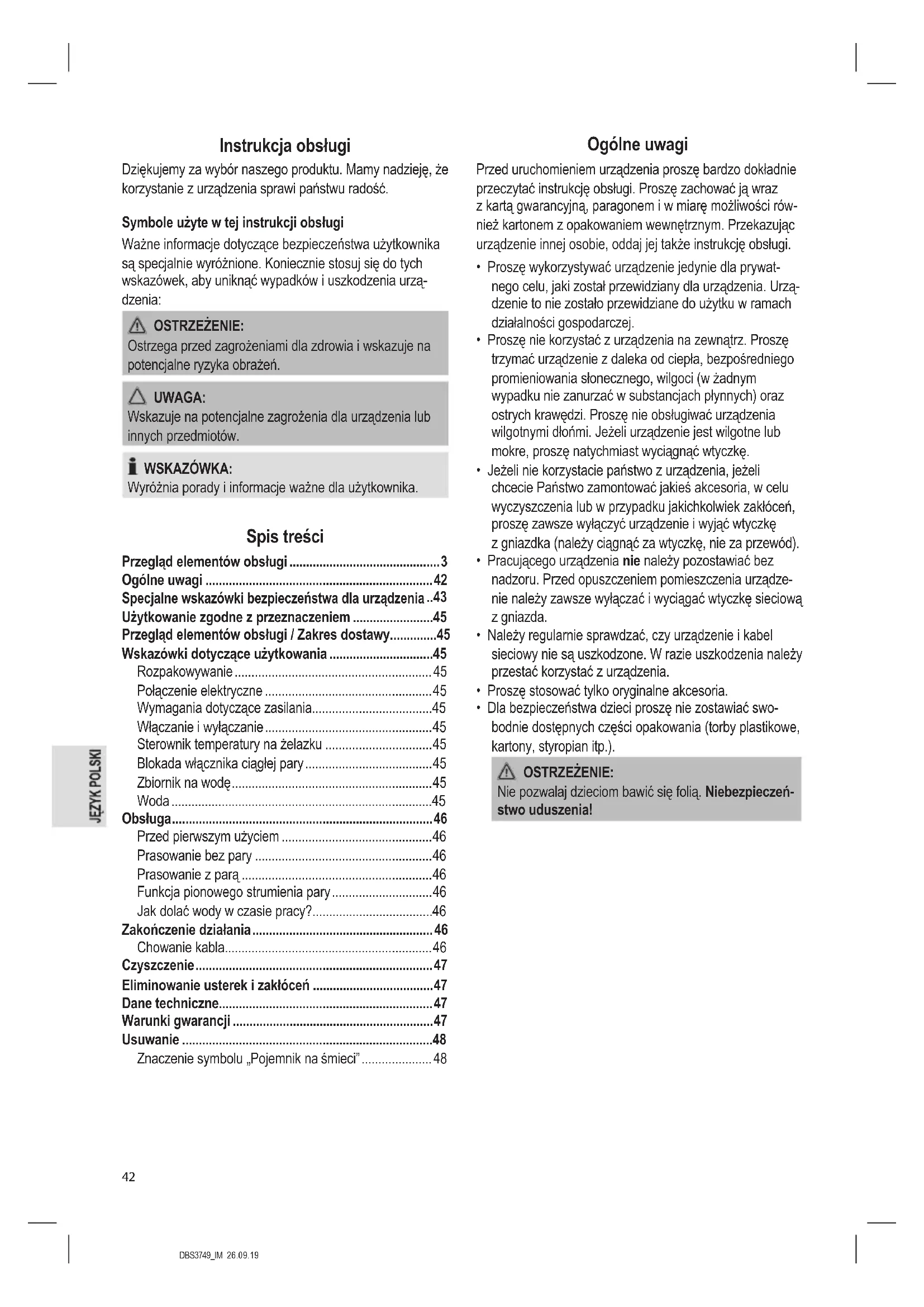 - Dla bezpieczeństwa dzieci proszę nie zostawiać swo- bodnie dostępnych części opakowania (torby plastikowe, kartony, styropian itp.). OSTRZEŻENIE: Nie pozwalaj dzieciom bawić się folią. Niebezpieczeń- stwo uduszenia!DBS3749_IM 26.09.19