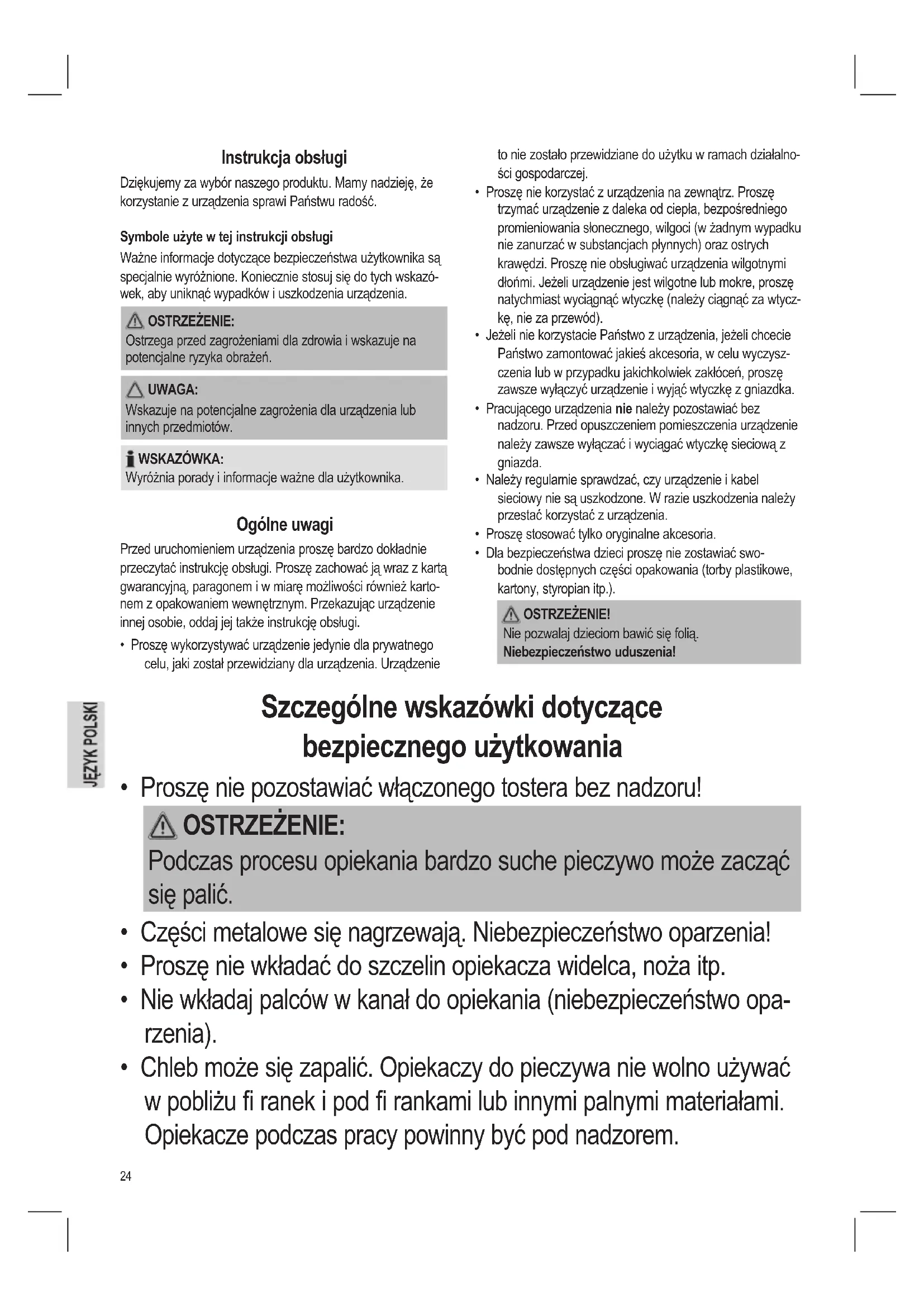 - Proszę nie pozostawiać włączonego tostera bez nadzoru! OSTRZEŻENIE: Podczas procesu opiekania bardzo suche pieczywo może zacząć się palić.