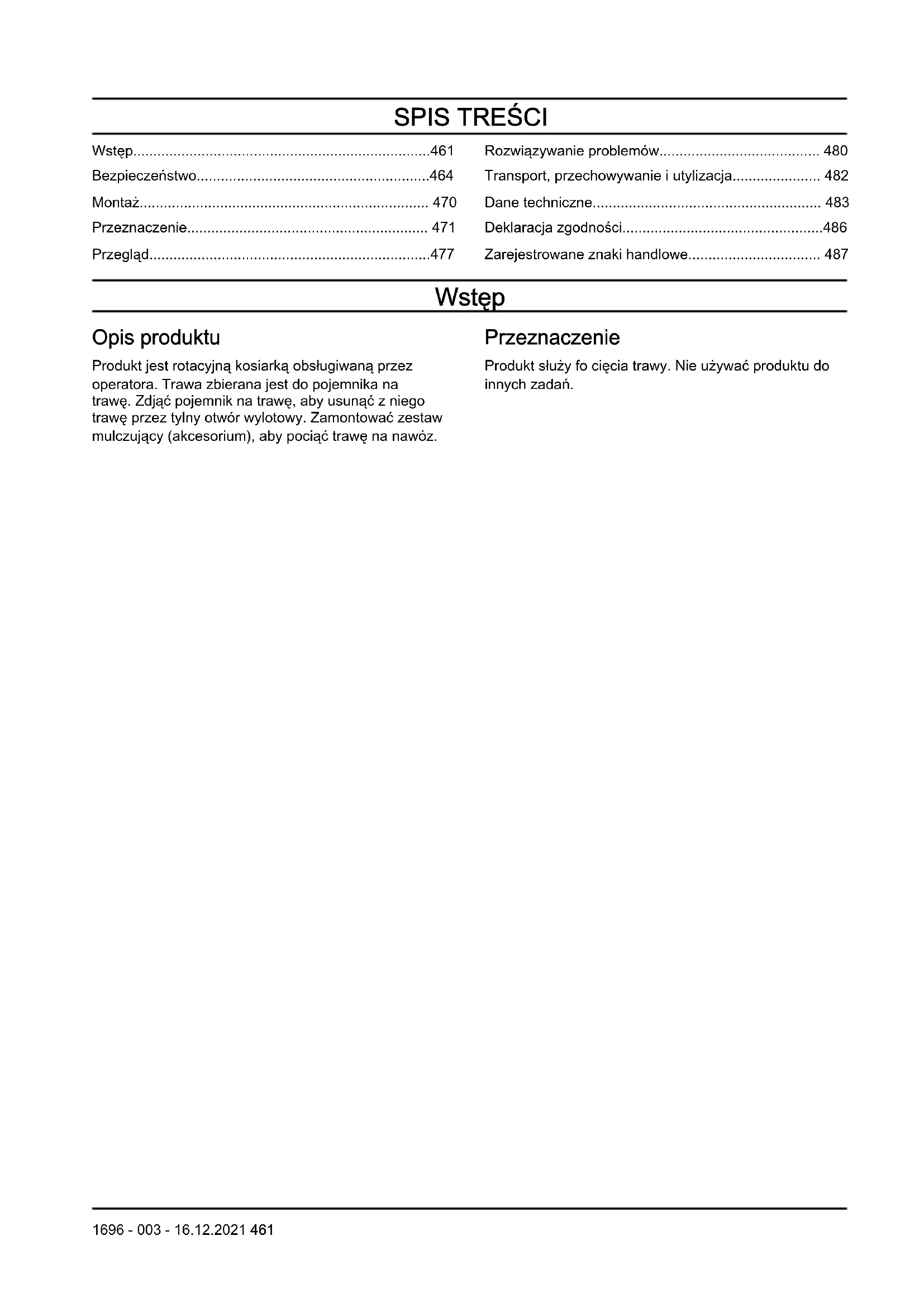 - Zarejestrowane znaki handlowe Wstęp Opis produktu Produkt jest rotacyjną kosiarką obsługiwaną przez operatora. Trawa zbierana jest do pojemnika na trawę. Zdjąć pojemnik na trawę, aby usunąć z niego trawę przez tylny otwór wylotowy. Zamontować zestaw mulczujący (akcesorium), aby pociąć trawę na nawóz. Przeznaczenie Produkt służy fo cięcia trawy. Nie używać produktu do innych zadań. 1696 - 003 - 16.12.2021 461Przegląd produktu p. 487