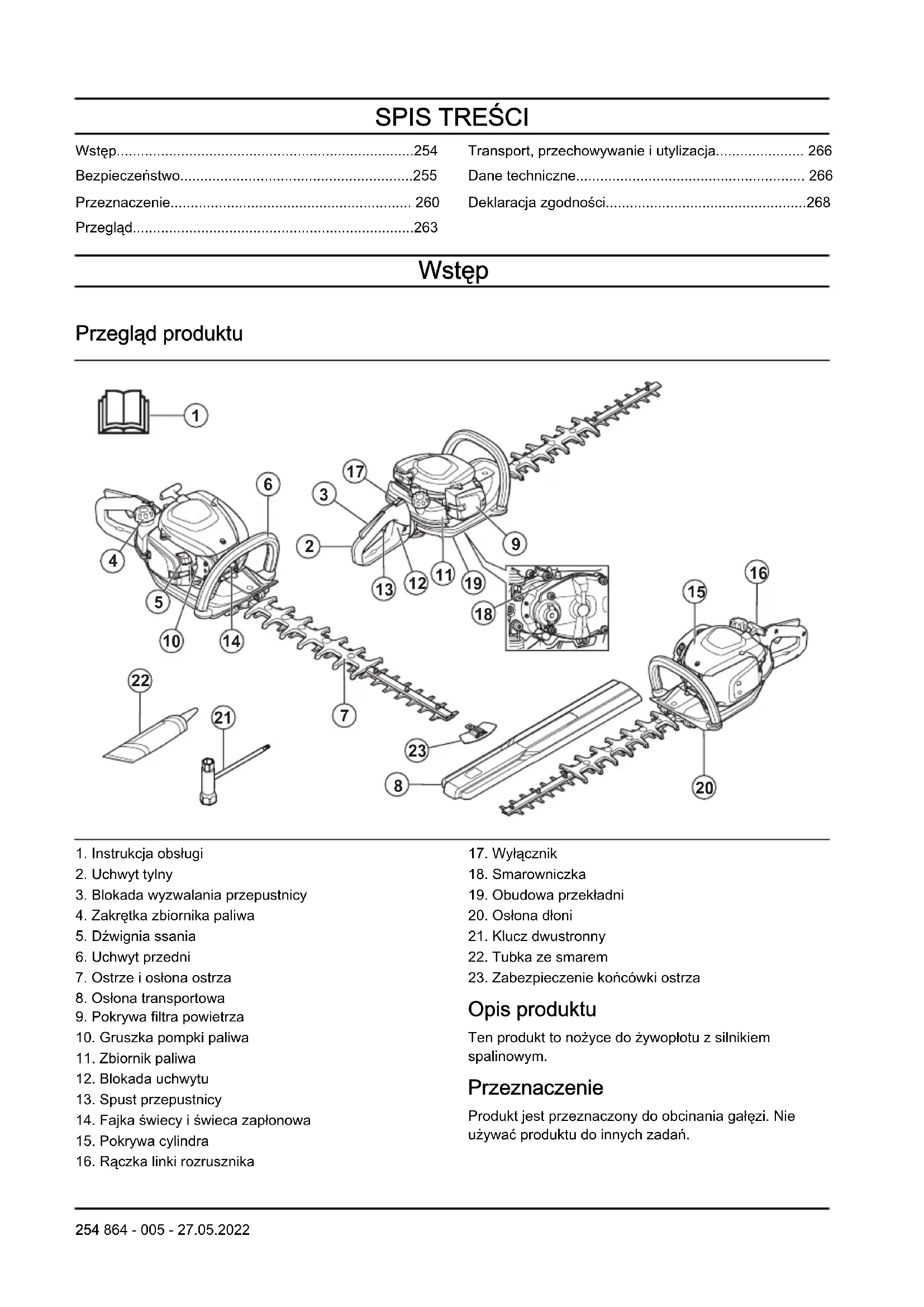 Opis produktu Ten produkt to nożyce do żywopłotu z silnikiem spalinowym. Przeznaczenie Produkt jest przeznaczony do obcinania gałęzi. Nie używać produktu do innych zadań. 254 864 - 005 - 27.05.2022Symbole znajdujące się na produkcie Stop. Należy zachować ostrożność i prawidłowo korzystać z produktu. Produkt może spowodować poważne obrażenia ciała lub śmierć operatora lub innych osób. Przed przystąpieniem do pracy należy dokładnie i ze zrozumieniem zapoznać się z treścią niniejszej instrukcji obsługi. Należy używać zatwierdzonych ochronników słuchu oraz zatwierdzonych okularów ochronnych. Nosić rękawice ochronne. Stosować mocne, przeciwpoślizgowego obuwie ochronne. Dysza regulacyjna obrotów biegu jałowego. Iglica wysokich obrotów. Iglica niskich obrotów. Emisje hałasu do środowiska zgodnie z dyrektywą europejską 2000/14/WE i przepisami Nowej Południowej Walii „Protection of the Environment Operations (Noise Control) Regulation 2017”. Dane dotyczące emisji hałasu można znaleźć na etykiecie maszyny oraz w rozdziale „Dane techniczne”. Produkt jest zgodny z odpowiednimi dyrektywami WE. Ten produkt jest zgodny z przepisami obowiązującymi w Wielkiej Brytanii. yyyywwxxxx Tabliczka znamionowa zawiera nu- mer seryjny. yyyy to rok produkcji, a ww oznacza tydzień produkcji. Uwaga: Pozostałe symbole/naklejki samoprzylepne umieszczone na produkcie dotyczą wymogów związanych z certyfikatami w niektórych krajach. Emisje Euro V OSTRZEŻENIE: Ingerencja w silnik powoduje unieważnienie europejskiego zatwierdzenia typu produktu. Bezpieczeństwo Definicje dotyczące bezpieczeństwa Ostrzeżenia, uwagi i informacje są używane do zwrócenia uwagi na szczególnie ważne sekcje instrukcji obsługi. OSTRZEŻENIE: Jest używane, gdy istnieje ryzyko poważnych obrażeń, śmierci operatora lub uszkodzenia otoczenia w wyniku nieprzestrzegania instrukcji obsługi. UWAGA: Jest używane, gdy istnieje ryzyko uszkodzenia materiałów lub urządzenia w wyniku nieprzestrzegania instrukcji obsługi. Uwaga: Stosuje się, aby przekazać więcej informacji, które są przydatne w danej sytuacji. Ogólne zasady bezpieczeństwa OSTRZEŻENIE: Przed rozpoczęciem użytkowania produktu przeczytać następujące ostrzeżenia.