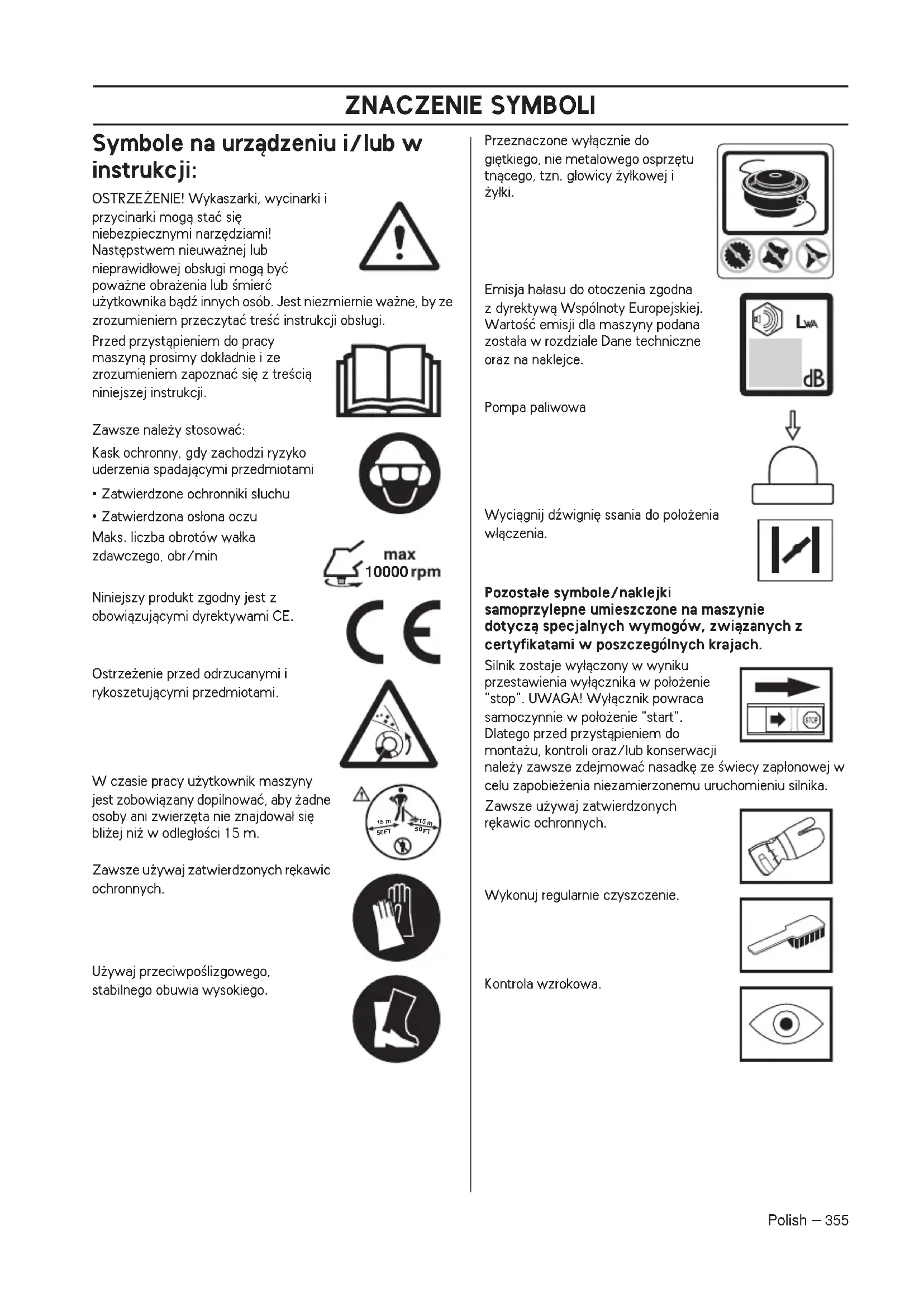 - Zatwierdzona os∏ona oczu Maks. liczba obrotów wa∏ka zdawczego, obr/min Niniejszy produkt zgodny jest z obowiàzujàcymi dyrektywami CE. Ostrze˝enie przed odrzucanymi i rykoszetujàcymi przedmiotami. W czasie pracy u˝ytkownik maszyny jest zobowiàzany dopilnowaç, aby ˝adne osoby ani zwierz´ta nie znajdowa∏ si´ bli˝ej ni˝ w odleg∏oÊci 15 m. Zawsze u˝ywaj zatwierdzonych r´kawic ochronnych. U˝ywaj przeciwpoÊlizgowego, stabilnego obuwia wysokiego. Przeznaczone wy∏àcznie do gi´tkiego, nie metalowego osprz´tu tnàcego, tzn. g∏owicy ˝y∏kowej i ˝y∏ki. Emisja ha∏asu do otoczenia zgodna z dyrektywà Wspólnoty Europejskiej. WartoÊç emisji dla maszyny podana zosta∏a w rozdziale Dane techniczne oraz na naklejce. Pompa paliwowa Wyciàgnij dêwigni´ ssania do po∏o˝enia w∏àczenia. Pozosta∏e symbole/naklejki samoprzylepne umieszczone na maszynie dotyczà specjalnych wymogów, zwiàzanych z certyfikatami w poszczególnych krajach. Silnik zostaje wy∏àczony w wyniku przestawienia wy∏àcznika w po∏o˝enie "stop". UWAGA! Wy∏àcznik powraca samoczynnie w po∏o˝enie "start". Dlatego przed przystàpieniem do monta˝u, kontroli oraz/lub konserwacji nale˝y zawsze zdejmowaç nasadk´ ze Êwiecy zap∏onowej w celu zapobie˝enia niezamierzonemu uruchomieniu silnika. Zawsze u˝ywaj zatwierdzonych r´kawic ochronnych. Wykonuj regularnie czyszczenie. Kontrola wzrokowa.
