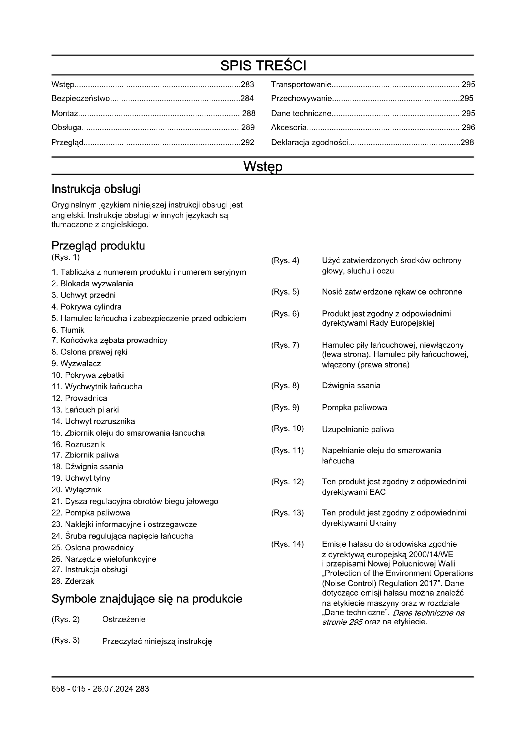 Symbole znajdujące się na produkcie (Rys. 2) Ostrzeżenie (Rys. 3) Przeczytać niniejszą instrukcję (Rys. 4) Użyć zatwierdzonych środków ochrony głowy, słuchu i oczu (Rys. 5) Nosić zatwierdzone rękawice ochronne (Rys. 6) Produkt jest zgodny z odpowiednimi dyrektywami Rady Europejskiej (Rys. 7) Hamulec piły łańcuchowej, niewłączony (lewa strona). Hamulec piły łańcuchowej, włączony (prawa strona) (Rys. 8) Dźwignia ssania (Rys. 9) Pompka paliwowa (Rys. 10) Uzupełnianie paliwa (Rys. 11) Napełnianie oleju do smarowania łańcucha (Rys. 12) Ten produkt jest zgodny z odpowiednimi dyrektywami EAC (Rys. 13) Ten produkt jest zgodny z odpowiednimi dyrektywami Ukrainy (Rys. 14) Emisje hałasu do środowiska zgodnie z dyrektywą europejską 2000/14/WE i przepisami Nowej Południowej Walii „Protection of the Environment Operations (Noise Control) Regulation 2017”. Dane dotyczące emisji hałasu można znaleźć na etykiecie maszyny oraz w rozdziale „Dane techniczne”. Dane techniczne na stronie 295 oraz na etykiecie.