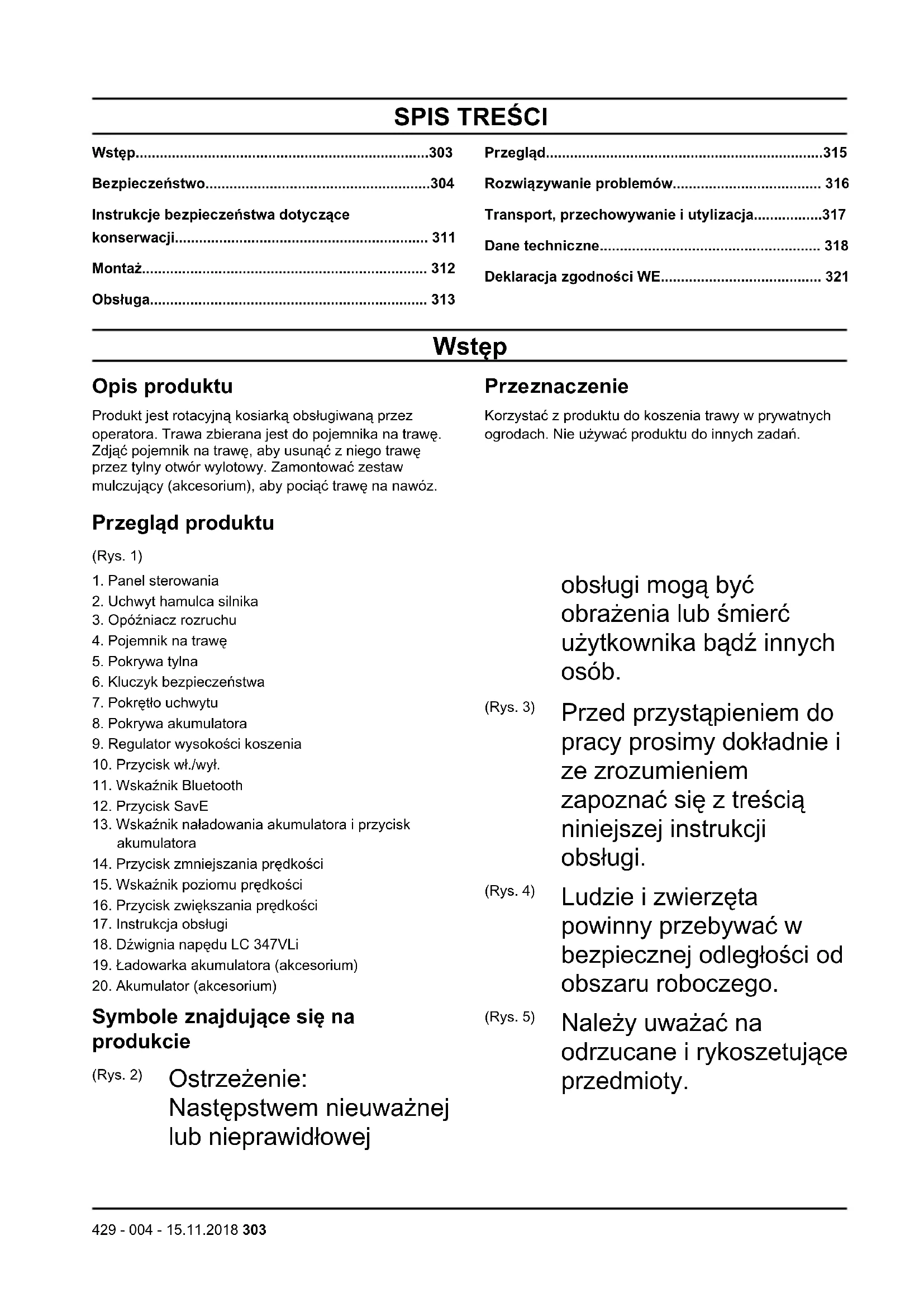 - Deklaracja zgodności WE Wstęp Opis produktu Produkt jest rotacyjną kosiarką obsługiwaną przez operatora. Trawa zbierana jest do pojemnika na trawę. Zdjąć pojemnik na trawę, aby usunąć z niego trawę przez tylny otwór wylotowy. Zamontować zestaw mulczujący (akcesorium), aby pociąć trawę na nawóz. Przeznaczenie Korzystać z produktu do koszenia trawy w prywatnych ogrodach. Nie używać produktu do innych zadań. Przegląd produktu (Rys. 1) p. 321