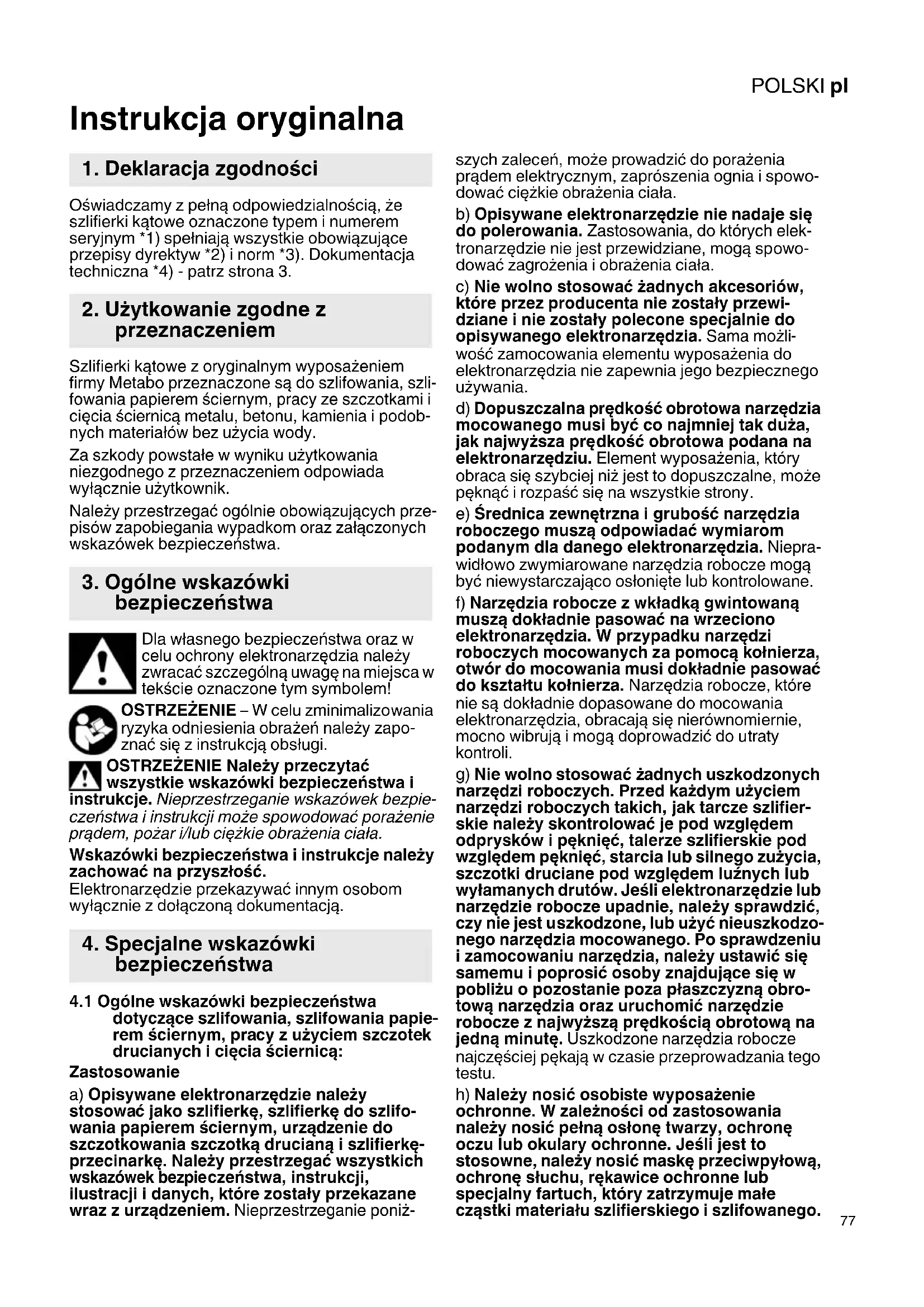 Instrukcja oryginalna Oświadczamy z pełną odpowiedzialnością, że szlifierki kątowe oznaczone typem i numerem seryjnym *1) spełniają wszystkie obowiązujące przepisy dyrektyw *2) i norm *3). Dokumentacja techniczna *4) - patrz strona 3. Szlifierki kątowe z oryginalnym wyposażeniem firmy Metabo przeznaczone są do szlifowania, szli- fowania papierem ściernym, pracy ze szczotkami i cięcia ściernicą metalu, betonu, kamienia i podob- nych materiałów bez użycia wody. Za szkody powstałe w wyniku użytkowania niezgodnego z przeznaczeniem odpowiada wyłącznie użytkownik. Należy przestrzegać ogólnie obowiązujących prze- pisów zapobiegania wypadkom oraz załączonych wskazówek bezpieczeństwa. Dla własnego bezpieczeństwa oraz w celu ochrony elektronarzędzia należy zwracać szczególną uwagę na miejsca w tekście oznaczone tym symbolem! OSTRZEŻENIE – W celu zminimalizowania ryzyka odniesienia obrażeń należy zapo- znać się z instrukcją obsługi. OSTRZEŻENIE Należy przeczytać wszystkie wskazówki bezpieczeństwa i instrukcje. Nieprzestrzeganie wskazówek bezpie- czeństwa i instrukcji może spowodować porażenie prądem, pożar i/lub ciężkie obrażenia ciała. Wskazówki bezpieczeństwa i instrukcje należy zachować na przyszłość. Elektronarzędzie przekazywać innym osobom wyłącznie z dołączoną dokumentacją.