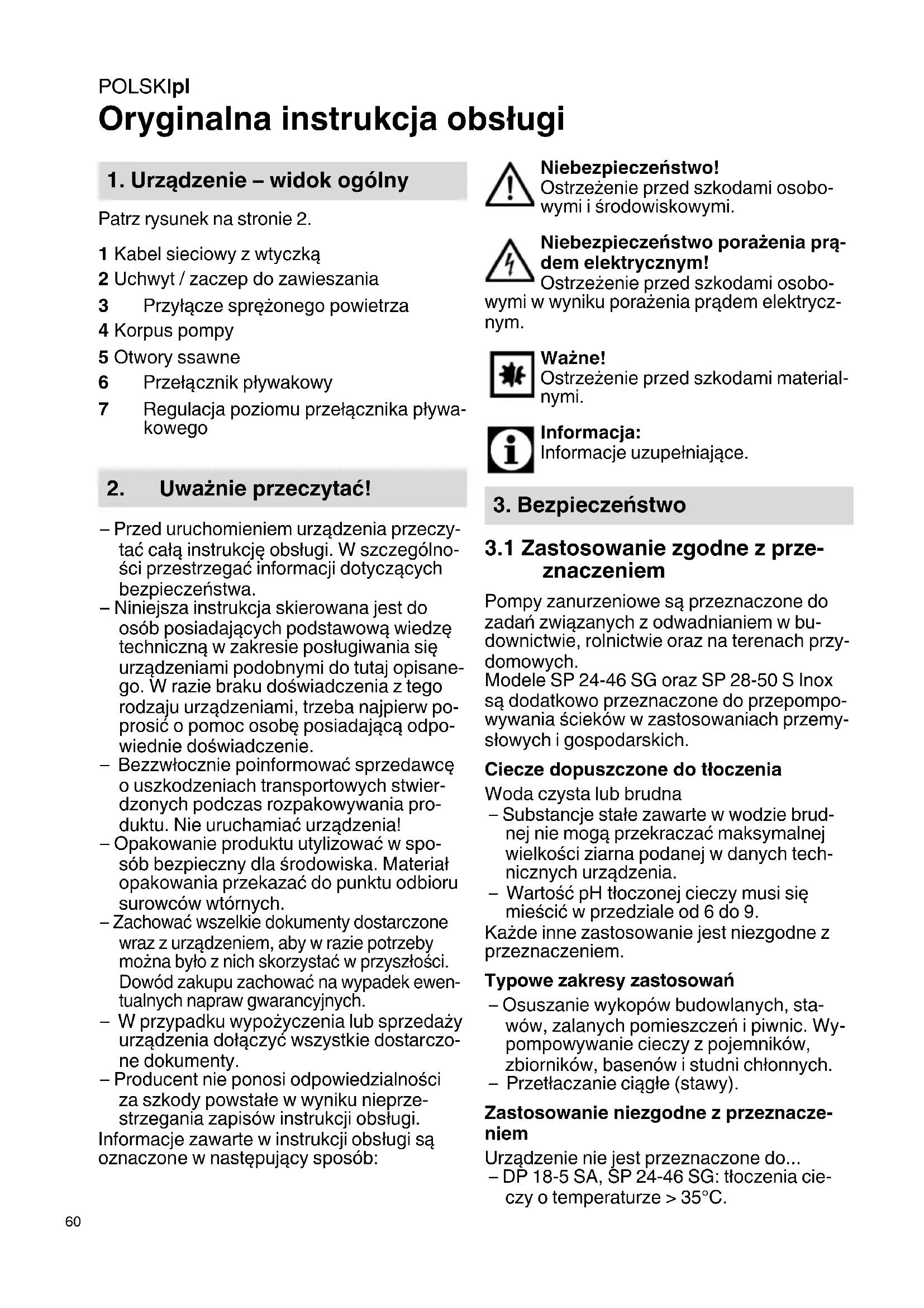 znaczeniem Pompy zanurzeniowe są przeznaczone do zadań związanych z odwadnianiem w bu- downictwie, rolnictwie oraz na terenach przy- domowych. Modele SP 24-46 SG oraz SP 28-50 S Inox są dodatkowo przeznaczone do przepompo- wywania ścieków w zastosowaniach przemy- słowych i gospodarskich. Ciecze dopuszczone do tłoczenia Woda czysta lub brudna – Substancje stałe zawarte w wodzie brud- nej nie mogą przekraczać maksymalnej wielkości ziarna podanej w danych tech- nicznych urządzenia. –Wartość pH tłoczonej cieczy musi się mieścić w przedziale od 6 do 9. Każde inne zastosowanie jest niezgodne z przeznaczeniem. Typowe zakresy zastosowań – Osuszanie wykopów budowlanych, sta- wów, zalanych pomieszczeń i piwnic. Wy- pompowywanie cieczy z pojemników, zbiorników, basenów i studni chłonnych. –Przetłaczanie ciągłe (stawy). Zastosowanie niezgodne z przeznacze- niem Urządzenie nie jest przeznaczone do... – DP 18-5 SA, SP 24-46 SG: tłoczenia cie- czy o temperaturze > 35°C.