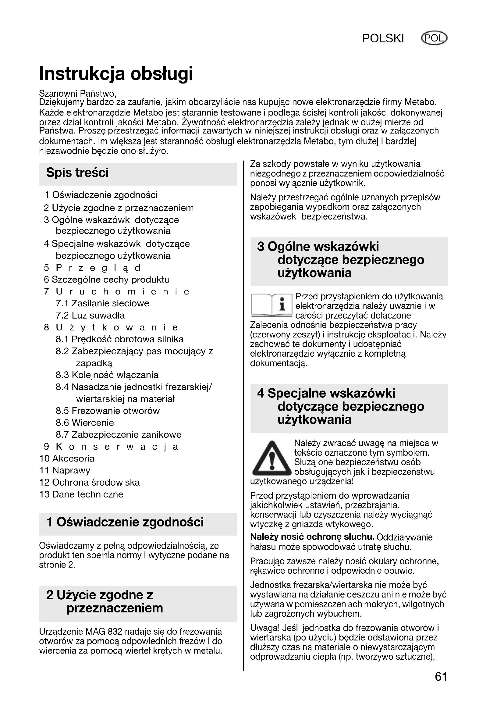 9Konserwacja 10 Akcesoria 11 Naprawy 12 Ochrona środowiska 13 Dane techniczne Oświadczamy z pełną odpowiedzialnością, że produkt ten spełnia normy i wytyczne podane na stronie 2. Urządzenie MAG 832 nadaje się do frezowania otworów za pomocą odpowiednich frezów i do wiercenia za pomocą wierteł krętych w metalu. Za szkody powstałe w wyniku użytkowania niezgodnego z przeznaczeniem odpowiedzialność ponosi wyłącznie użytkownik. Należy przestrzegać ogólnie uznanych przepisów zapobiegania wypadkom oraz załączonych wskazówek bezpieczeństwa. Przed przystąpieniem do użytkowania elektronarzędzia należy uważnie i w całości przeczytać dołączone Zalecenia odnośnie bezpieczeństwa pracy (czerwony zeszyt) i instrukcję eksploatacji. Należy zachować te dokumenty i udostępniać elektronarzędzie wyłącznie z kompletną dokumentacją. Należy zwracać uwagę na miejsca w tekście oznaczone tym symbolem. Służą one bezpieczeństwu osób obsługujących jak i bezpieczeństwu użytkowanego urządzenia! Przed przystąpieniem do wprowadzania jakichkolwiek ustawień, przezbrajania, konserwacji lub czyszczenia należy wyciągnąć wtyczkę z gniazda wtykowego. Należy nosić ochronę słuchu. Oddziaływanie hałasu może spowodować utratę słuchu. Pracując zawsze należy nosić okulary ochronne, rękawice ochronne i odpowiednie obuwie. Jednostka frezarska/wiertarska nie może być wystawiana na działanie deszczu ani nie może być używana w pomieszczeniach mokrych, wilgotnych lub zagrożonych wybuchem. Uwaga! Jeśli jednostka do frezowania otworów i wiertarska (po użyciu) będzie odstawiona przez dłuższy czas na materiale o niewystarczającym odprowadzaniu ciepła (np. tworzywo sztuczne), Instrukcja obsługi Szanowni Państwo, Dziękujemy bardzo za zaufanie, jakim obdarzyliście nas kupując nowe elektronarzędzie firmy Metabo. Każde elektronarzędzie Metabo jest starannie testowane i podlega ścisłej kontroli jakości dokonywanej przez dział kontroli jakości Metabo. Żywotność elektronarzędzia zależy jednak w dużej mierze od Państwa. Proszę przestrzegać informacji zawartych w niniejszej instrukcji obsługi oraz w załączonych dokumentach. Im większa jest staranność obsługi elektronarzędzia Metabo, tym dłużej i bardziej niezawodnie będzie ono służyło. Spis treści 1 Oświadczenie zgodności 2 Użycie zgodne z przeznaczeniem 3 Ogólne wskazówki dotyczące bezpiecznego użytkowania 4 Specjalne wskazówki dotyczące bezpiecznego użytkowania 170 22 3900 - MAG.book Seite 61 Donnerstag, 27. Oktober 2005 11:39 1162 POLSKI POL nie wolno włączać elektromagnesu stojaka, ponieważ może spowodować to zniszczenie cewki elektromagnesu. Do frezowania otworów i wiercenia na powierzchniach skośnych, pionowych oraz nad głową jednostka frezarska /wiertarska musi być zabezpieczona dostarczonym pasem mocującym w taki sposób, aby przy ewentualnym zaniku zasilania nie mogła opaść. Patrz strona 3 (proszę rozłożyć). 1 Włącznik (stojak elektromagnetyczny) 2 Punkty przytwierdzania pasa mocującego 3Suwadło 4 Włącznik (silnik) 5 Pokrętło przełącznikowe 6 Znacznik strzałkowy 7 Powierzchnie "pod klucz" wrzeciona silnikowego