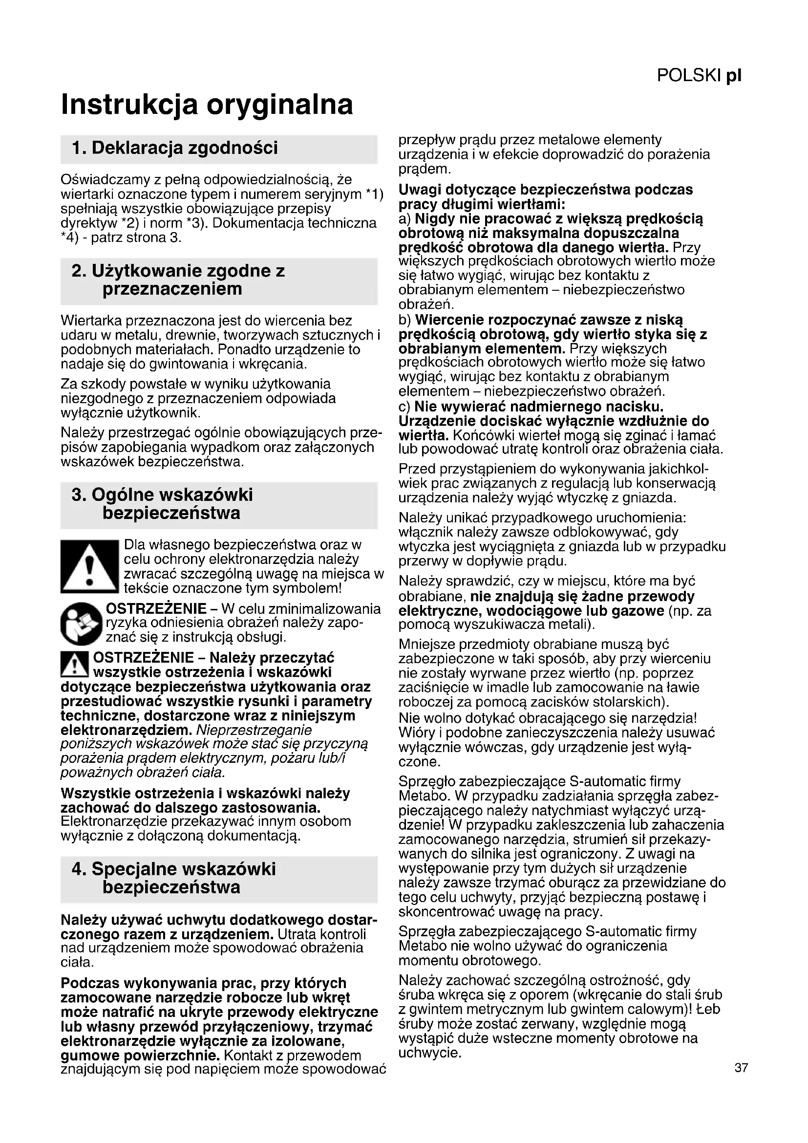 Instrukcja oryginalna Oświadczamy z pełną odpowiedzialnością, że wiertarki oznaczone typem i numerem seryjnym *1) spełniają wszystkie obowiązujące przepisy dyrektyw *2) i norm *3). Dokumentacja techniczna *4) - patrz strona 3. Wiertarka przeznaczona jest do wiercenia bez udaru w metalu, drewnie, tworzywach sztucznych i podobnych materiałach. Ponadto urządzenie to nadaje się do gwintowania i wkręcania. Za szkody powstałe w wyniku użytkowania niezgodnego z przeznaczeniem odpowiada wyłącznie użytkownik. Należy przestrzegać ogólnie obowiązujących prze- pisów zapobiegania wypadkom oraz załączonych wskazówek bezpieczeństwa. Dla własnego bezpieczeństwa oraz w celu ochrony elektronarzędzia należy zwracać szczególną uwagę na miejsca w tekście oznaczone tym symbolem! OSTRZEŻENIE – W celu zminimalizowania ryzyka odniesienia obrażeń należy zapo- znać się z instrukcją obsługi. OSTRZEŻENIE – Należy przeczytać wszystkie ostrzeżenia i wskazówki dotyczące bezpieczeństwa użytkowania oraz przestudiować wszystkie rysunki i parametry techniczne, dostarczone wraz z niniejszym elektronarzędziem. Nieprzestrzeganie poniższych wskazówek może stać się przyczyną porażenia prądem elektrycznym, pożaru lub/i poważnych obrażeń ciała. Wszystkie ostrzeżenia i wskazówki należy zachować do dalszego zastosowania. Elektronarzędzie przekazywać innym osobom wyłącznie z dołączoną dokumentacją. Należy używać uchwytu dodatkowego dostar- czonego razem z urządzeniem. Utrata kontroli nad urządzeniem może spowodować obrażenia ciała. Podczas wykonywania prac, przy których zamocowane narzędzie robocze lub wkręt może natrafić na ukryte przewody elektryczne lub własny przewód przyłączeniowy, trzymać elektronarzędzie wyłącznie za izolowane, gumowe powierzchnie. Kontakt z przewodem znajdującym się pod napięciem może spowodować przepływ prądu przez metalowe elementy urządzenia i w efekcie doprowadzić do porażenia prądem. Uwagi dotyczące bezpieczeństwa podczas pracy długimi wiertłami: a) Nigdy nie pracować z większą prędkością obrotową niż maksymalna dopuszczalna prędkość obrotowa dla danego wiertła. Przy większych prędkościach obrotowych wiertło może się łatwo wygiąć, wirując bez kontaktu z obrabianym elementem – niebezpieczeństwo obrażeń. b) Wiercenie rozpoczynać zawsze z niską prędkością obrotową, gdy wiertło styka się z obrabianym elementem. Przy większych prędkościach obrotowych wiertło może się łatwo wygiąć, wirując bez kontaktu z obrabianym elementem – niebezpieczeństwo obrażeń. c) Nie wywierać nadmiernego nacisku. Urządzenie dociskać wyłącznie wzdłużnie do wiertła. Końcówki wierteł mogą się zginać i łamać lub powodować utratę kontroli oraz obrażenia ciała. Przed przystąpieniem do wykonywania jakichkol- wiek prac związanych z regulacją lub konserwacją urządzenia należy wyjąć wtyczkę z gniazda. Należy unikać przypadkowego uruchomienia: włącznik należy zawsze odblokowywać, gdy wtyczka jest wyciągnięta z gniazda lub w przypadku przerwy w dopływie prądu. Należy sprawdzić, czy w miejscu, które ma być obrabiane, nie znajdują się żadne przewody elektryczne, wodociągowe lub gazowe (np. za pomocą wyszukiwacza metali). Mniejsze przedmioty obrabiane muszą być zabezpieczone w taki sposób, aby przy wierceniu nie zostały wyrwane przez wiertło (np. poprzez zaciśnięcie w imadle lub zamocowanie na ławie roboczej za pomocą zacisków stolarskich). Nie wolno dotykać obracającego się narzędzia! Wióry i podobne zanieczyszczenia należy usuwać wyłącznie wówczas, gdy urządzenie jest wyłą- czone. Sprzęgło zabezpieczające S-automatic firmy Metabo. W przypadku zadziałania sprzęgła zabez- pieczającego należy natychmiast wyłączyć urzą- dzenie! W przypadku zakleszczenia lub zahaczenia zamocowanego narzędzia, strumień sił przekazy- wanych do silnika jest ograniczony. Z uwagi na występowanie przy tym dużych sił urządzenie należy zawsze trzymać oburącz za przewidziane do tego celu uchwyty, przyjąć bezpieczną postawę i skoncentrować uwagę na pracy. Sprzęgła zabezpieczającego S-automatic firmy Metabo nie wolno używać do ograniczenia momentu obrotowego. Należy zachować szczególną ostrożność, gdy śruba wkręca się z oporem (wkręcanie do stali śrub z gwintem metrycznym lub gwintem calowym)! Łeb śruby może zostać zerwany, względnie mogą wystąpić duże wsteczne momenty obrotowe na uchwycie.