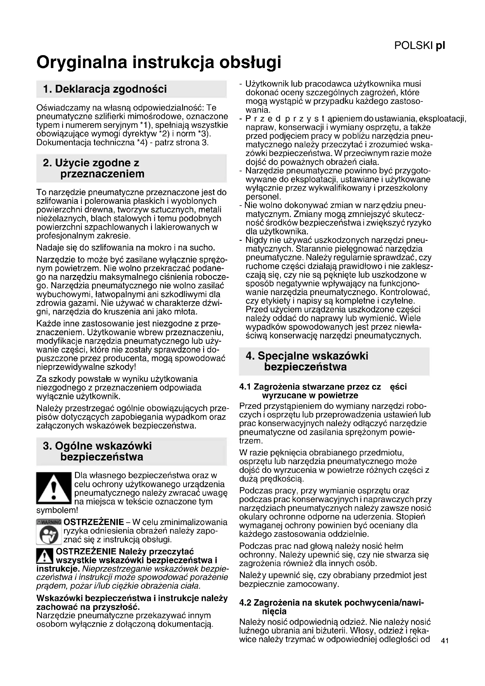 Oryginalna instrukcja obsługi Oświadczamy na własną odpowiedzialność: Te pneumatyczne szlifierki mimośrodowe, oznaczone typem i numerem seryjnym *1), spełniają wszystkie obowiązujące wymogi dyrektyw *2) i norm *3). Dokumentacja techniczna *4) - patrz strona 3. To narzędzie pneumatyczne przeznaczone jest do szlifowania i polerowania płaskich i wyoblonych powierzchni drewna, tworzyw sztucznych, metali nieżelaznych, blach stalowych i temu podobnych powierzchni szpachlowanych i lakierowanych w profesjonalnym zakresie. Nadaje się do szlifowania na mokro i na sucho. Narzędzie to może być zasilane wyłącznie sprężo- nym powietrzem. Nie wolno przekraczać podane- go na narzędziu maksymalnego ciśnienia robocze- go. Narzędzia pneumatycznego nie wolno zasilać wybuchowymi, łatwopalnymi ani szkodliwymi dla zdrowia gazami. Nie używać w charakterze dźwi- gni, narzędzia do kruszenia ani jako młota. Każde inne zastosowanie jest niezgodne z prze- znaczeniem. Użytkowanie wbrew przeznaczeniu, modyfikacje narzędzia pneumatycznego lub uży- wanie części, które nie zostały sprawdzone i do- puszczone przez producenta, mogą spowodować nieprzewidywalne szkody! Za szkody powstał e w wyniku użytkowania niezgodnego z przeznaczeniem odpowiada wyłącznie użytkownik. Należy przestrzegać ogólnie obowiązujących prze- pisów dotyczących zapobiegania wypadkom oraz załączonych wskazówek bezpieczeństwa. Dla własnego bezpieczeństwa oraz w celu ochrony użytkowanego urządzenia pneumatycznego należy zwracać uwagę na miejsca w tekście oznaczone tym symbolem! OSTRZEŻENIE – W celu zminimalizowania ryzyka odniesienia obrażeń należy zapo- znać się z instrukcją obsługi. OSTRZEŻENIE Należy przeczytać wszystkie wskazówki bezpieczeństwa i instrukcje. Nieprzestrzeganie wskazówek bezpie- czeństwa i instrukcji może spowodować porażenie prądem, pożar i/lub ciężkie obrażenia ciała. Wskazówki bezpieczeństwa i instrukcje należy zachować na przyszłość. Narzędzie pneumatyczne przekazywać innym osobom wyłącznie z dołączoną dokumentacją. -Użytkownik lub pracodawca użytkownika musi dokonać oceny szczególnych zagrożeń, które mogą wystąpić w przypadku każdego zastoso- wania. -Przed przystąpieniem do ustawiania, eksploatacji, napraw, konserwacji i wymiany osprzętu, a także przed podjęciem pracy w pobliżu narzędzia pneu- matycznego należy przeczytać i zrozumieć wska- zówki bezpieczeństwa. W przeciwnym razie może dojść do poważnych obrażeń ciała. -Narzędzie pneumatyczne powinno być przygoto- wywane do eksploatacji, ustawiane i użytkowane wyłącznie przez wykwalifikowany i przeszkolony personel. - Nie wolno dokonywać zmian w narz ędziu pneu- matycznym. Zmiany mogą zmniejszyć skutecz- ność środków bezpieczeństwa i zwiększyć ryzyko dla użytkownika. -Nigdy nie używać uszkodzonych narzędzi pneu- matycznych. Starannie pielęgnować narzędzia pneumatyczne. Należy regularnie sprawdzać, czy ruchome części działają prawidłowo i nie zaklesz- czają się, czy nie są pęknięte lub uszkodzone w sposób negatywnie wpływający na funkcjono- wanie narzędzia pneumatycznego. Kontrolować, czy etykiety i napisy są kompletne i czytelne. Przed użyciem urządzenia uszkodzone części należy oddać do naprawy lub wymienić. Wiele wypadków spowodowanych jest przez niewła- ściwą konserwację narzędzi pneumatycznych.