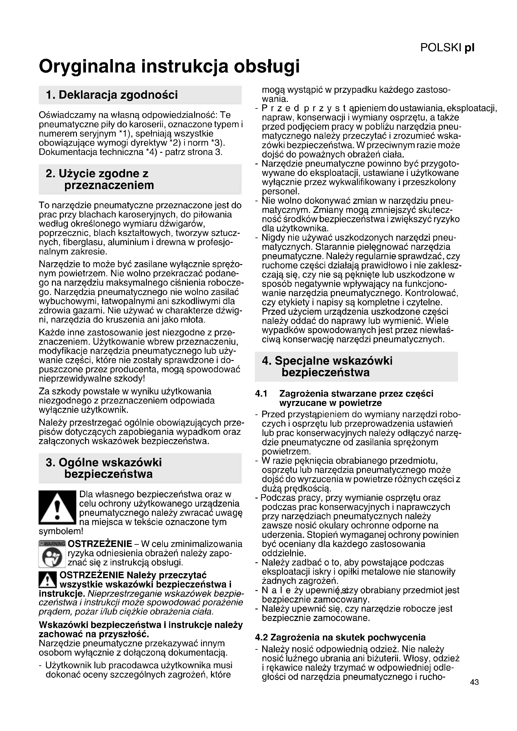 Oryginalna instrukcja obsługi Oświadczamy na własną odpowiedzialność: Te pneumatyczne piły do karoserii, oznaczone typem i numerem seryjnym *1), spełniają wszystkie obowiązujące wymogi dyrektyw *2) i norm *3). Dokumentacja techniczna *4) - patrz strona 3. To narzędzie pneumatyczne przeznaczone jest do prac przy blachach karoseryjnych, do piłowania według określonego wymiaru dźwigarów, poprzecznic, blach kształtowych, tworzyw sztucz- nych, fiberglasu, aluminium i drewna w profesjo- nalnym zakresie. Narzędzie to może być zasilane wyłącznie sprężo- nym powietrzem. Nie wolno przekraczać podane- go na narzędziu maksymalnego ciśnienia robocze- go. Narzędzia pneumatycznego nie wolno zasilać wybuchowymi, łatwopalnymi ani szkodliwymi dla zdrowia gazami. Nie używać w charakterze dźwig- ni, narzędzia do kruszenia ani jako młota. Każde inne zastosowanie jest niezgodne z prze- znaczeniem. Użytkowanie wbrew przeznaczeniu, modyfikacje narzędzia pneumatycznego lub uży- wanie części, które nie zostały sprawdzone i do- puszczone przez producenta, mogą spowodować nieprzewidywalne szkody! Za szkody powstałe w wyniku użytkowania niezgodnego z przeznaczeniem odpowiada wyłącznie użytkownik. Należy przestrzegać ogólnie obowiązujących prze- pisów dotyczących zapobiegania wypadkom oraz załączonych wskazówek bezpieczeństwa. Dla własnego bezpieczeństwa oraz w celu ochrony użytkowanego urządzenia pneumatycznego należy zwracać uwagę na miejsca w tekście oznaczone tym symbolem! OSTRZEŻENIE – W celu zminimalizowania ryzyka odniesienia obrażeń należy zapo- znać się z instrukcją obsługi. OSTRZEŻENIE Należy przeczytać wszystkie wskazówki bezpieczeństwa i instrukcje. Nieprzestrzeganie wskazówek bezpie- czeństwa i instrukcji może spowodować porażenie prądem, pożar i/lub ciężkie obraż enia ciała. Wskazówki bezpieczeństwa i instrukcje należy zachować na przyszłość. Narzędzie pneumatyczne przekazywać innym osobom wyłącznie z dołączoną dokumentacją. -Użytkownik lub pracodawca użytkownika musi dokonać oceny szczególnych zagrożeń, które mogą wystąpić w przypadku każdego zastoso- wania. -Przed przystąpieniem do ustawiania, eksploatacji, napraw, konserwacji i wymiany osprzętu, a także przed podjęciem pracy w pobliżu narzędzia pneu- matycznego należy przeczytać i zrozumieć wska- zówki bezpieczeństwa. W przeciwnym razie może dojść do poważnych obrażeń ciała. -Narzędzie pneumatyczne powinno być przygoto- wywane do eksploatacji, ustawiane i użytkowane wyłącznie przez wykwalifikowany i przeszkolony personel. - Nie wolno dokonywać zmian w narzędziu pneu- matycznym. Zmiany mogą zmniejszyć skutecz- ność środków bezpieczeństwa i zwiększyć ryzyko dla użytkownika. -Nigdy nie używać uszkodzonych narzędzi pneu- matycznych. Starannie pielęgnować narzędzia pneumatyczne. Należy regularnie sprawdzać, czy ruchome części działają prawidłowo i nie zaklesz- czają się, czy nie są pęknięte lub uszkodzone w sposób negatywnie wpływający na funkcjono- wanie narzędzia pneumatycznego. Kontrolować, czy etykiety i napisy są kompletne i czytelne. Przed użyciem urządzenia uszkodzone części należy oddać do naprawy lub wymienić. Wiele wypadków spowodowanych jest przez niewłaś- ciwą konserwację narzę dzi pneumatycznych.