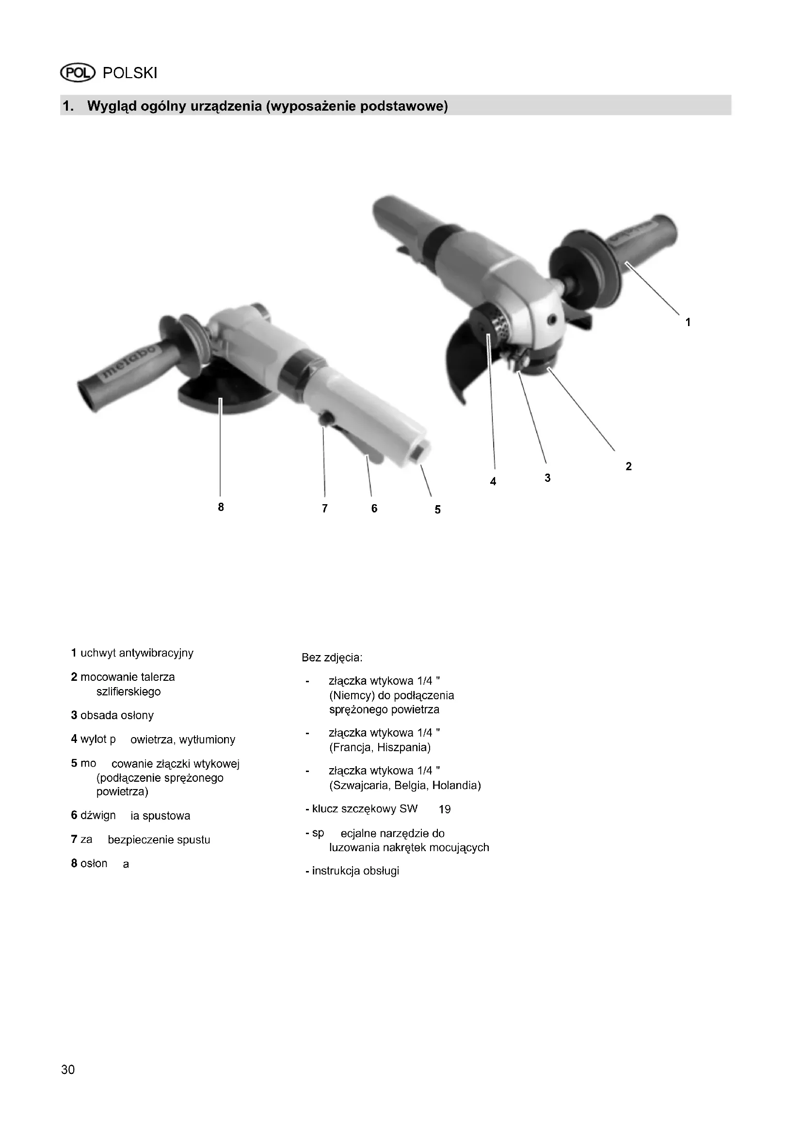 Zagrożenie ogólne! Należ y utrzymywać porządek w obrębie miejsca pracy – nieporządek w miejscu pracy może prowadzić do wypadków. Proszę uważ ać. Proszę nie używać urządzenia, jeżeli nie są Państwo skoncentrowani. Proszę nigdy nie używać urządzenia pod wpływem alkoholu lub tabletek. Należ y uwzględnić oddziaływanie środowiska. Należy zadbać o dobre oświetlenie. Proszę wystrzegać się nienaturalnych pozycji. Proszę pamiętać o pewnej postawie i zawsze trzymać równowagę. Proszę nie pozwalać dzieciom oraz innym osobom zbliżać się do miejsca pracy. Urządzenia pneumatyczne należy przechowywać w miejscu niedostępnym dla dzieci. Urządzenie można podłączać do kompresora tylko przy pomocy sprzęgła szybkodziałającego. Proszę nie używać do obróbki materiałów szkodliwych dla zdrowia. Podczas pracy przy użyciu tego urządzenia mogą powstawać iskry. Proszę nie używać urządzenia w Spis treści