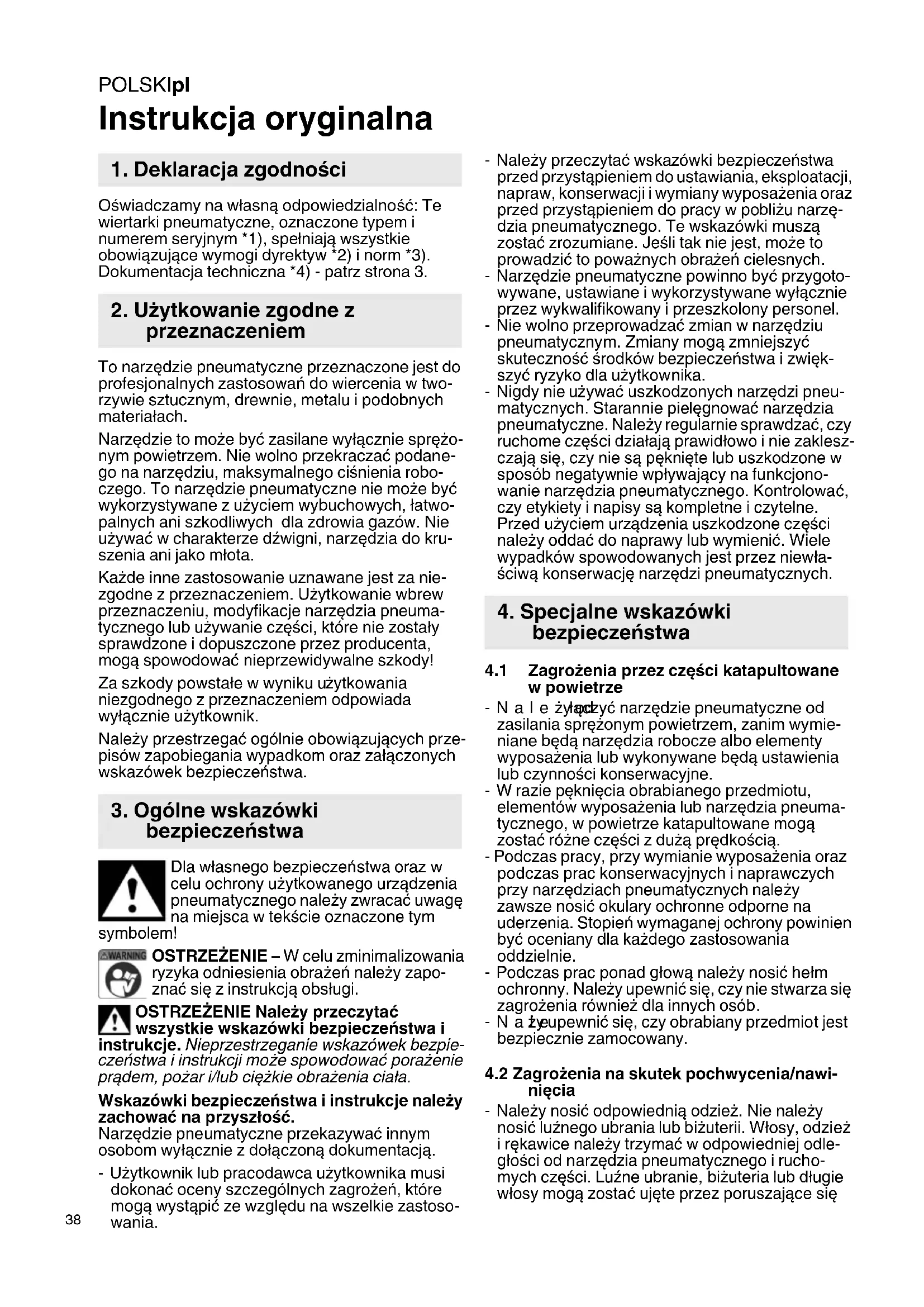 Instrukcja oryginalna Oświadczamy na własną odpowiedzialność: Te wiertarki pneumatyczne, oznaczone typem i numerem seryjnym *1), spełniają wszystkie obowiązujące wymogi dyrektyw *2) i norm *3). Dokumentacja techniczna *4) - patrz strona 3. To narzędzie pneumatyczne przeznaczone jest do profesjonalnych zastosowań do wiercenia w two- rzywie sztucznym, drewnie, metalu i podobnych materiałach. Narzędzie to może być zasilane wyłącznie sprężo- nym powietrzem. Nie wolno przekraczać podane- go na narzędziu, maksymalnego ciśnienia robo- czego. To narzędzie pneumatyczne nie może być wykorzystywane z użyciem wybuchowych, łatwo- palnych ani szkodliwych dla zdrowia gazów. Nie używać w charakterze dźwigni, narzędzia do kru- szenia ani jako młota. Każde inne zastosowanie uznawane jest za nie- zgodne z przeznaczeniem. Użytkowanie wbrew przeznaczeniu, modyfikacje narzędzia pneuma- tycznego lub używanie części, które nie zostały sprawdzone i dopuszczone przez producenta, mogą spowodować nieprzewidywalne szkody! Za szkody powstałe w wyniku u żytkowania niezgodnego z przeznaczeniem odpowiada wyłącznie użytkownik. Należy przestrzegać ogólnie obowiązujących prze- pisów zapobiegania wypadkom oraz załączonych wskazówek bezpieczeństwa. Dla własnego bezpieczeństwa oraz w celu ochrony użytkowanego urządzenia pneumatycznego należy zwracać uwagę na miejsca w tekście oznaczone tym symbolem! OSTRZEŻENIE – W celu zminimalizowania ryzyka odniesienia obrażeń należy zapo- znać się z instrukcją obsługi. OSTRZEŻENIE Należy przeczytać wszystkie wskazówki bezpieczeństwa i instrukcje. Nieprzestrzeganie wskazówek bezpie- czeństwa i instrukcji może spowodować porażenie prądem, pożar i/lub ciężkie obrażenia ciała. Wskazówki bezpieczeństwa i instrukcje należ