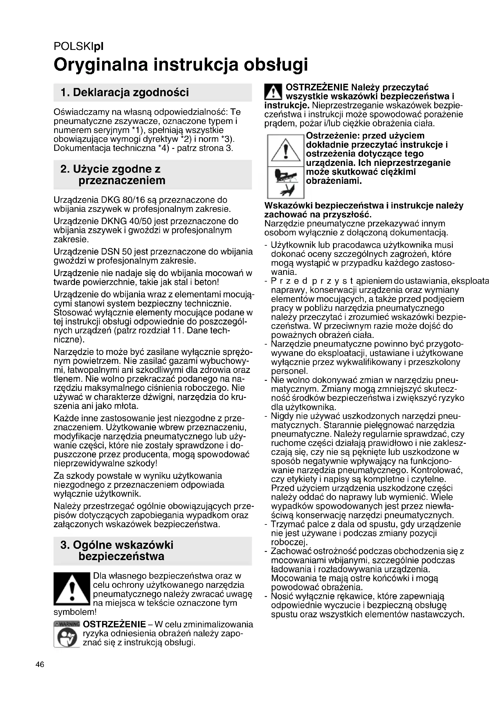 Oryginalna instrukcja obsługi Oświadczamy na własną odpowiedzialność: Te pneumatyczne zszywacze, oznaczone typem i numerem seryjnym *1), spełniają wszystkie obowiązujące wymogi dyrektyw *2) i norm *3). Dokumentacja techniczna *4) - patrz strona 3. Urządzenia DKG 80/16 są przeznaczone do wbijania zszywek w profesjonalnym zakresie. Urządzenie DKNG 40/50 jest przeznaczone do wbijania zszywek i gwoździ w profesjonalnym zakresie. Urządzenie DSN 50 jest przeznaczone do wbijania gwoździ w profesjonalnym zakresie. Urządzenie nie nadaje się do wbijania mocowań w twarde powierzchnie, takie jak stal i beton! Urządzenie do wbijania wraz z elementami mocują- cymi stanowi system bezpieczny technicznie. Stosować wyłącznie elementy mocujące podane w tej instrukcji obsługi odpowiednie do poszczegól- nych urządzeń (patrz rozdział 11. Dane tech- niczne). Narzędzie to może być zasilane wyłącznie sprężo- nym powietrzem. Nie zasilać gazami wybuchowy- mi, łatwopalnymi ani szkodliwymi dla zdrowia oraz tlenem. Nie wolno przekraczać podanego na na- rzędziu maksymalnego ciśnienia roboczego. Nie używa ć w charakterze dźwigni, narzędzia do kru- szenia ani jako młota. Każde inne zastosowanie jest niezgodne z prze- znaczeniem. Użytkowanie wbrew przeznaczeniu, modyfikacje narzędzia pneumatycznego lub uży- wanie części, które nie zostały sprawdzone i do- puszczone przez producenta, mogą spowodować nieprzewidywalne szkody! Za szkody powstałe w wyniku użytkowania niezgodnego z przeznaczeniem odpowiada wyłącznie użytkownik. Należy przestrzegać ogólnie obowiązujących prze- pisów dotyczących zapobiegania wypadkom oraz załączonych wskazówek bezpieczeństwa. Dla własnego bezpieczeństwa oraz w celu ochrony użytkowanego narzędzia pneumatycznego należy zwracać uwagę na miejsca w tekście oznaczone tym symbolem! OSTRZEŻENIE – W celu zminimalizowania ryzyka odniesienia obrażeń należy zapo- znać się z instrukcją obsługi. OSTRZE ŻENIE Należy przeczytać wszystkie wskazówki bezpieczeństwa i instrukcje. Nieprzestrzeganie wskazówek bezpie- czeństwa i instrukcji może spowodować porażenie prądem, pożar i/lub ciężkie obrażenia ciała. Ostrzeżenie: przed użyciem dokładnie przeczytać instrukcje i ostrzeżenia dotyczące tego urządzenia. Ich nieprzestrzeganie może skutkować ciężkimi obrażeniami. Wskazówki bezpieczeństwa i instrukcje należy zachować na przyszłość. Narzędzie pneumatyczne przekazywać innym osobom wyłącznie z dołączoną dokumentacją. -Użytkownik lub pracodawca użytkownika musi dokonać oceny szczególnych zagrożeń, które mogą wystą pić w przypadku każdego zastoso- wania. -Przed przystąpieniem do ustawiania, eksploatacji, naprawy, konserwacji urządzenia oraz wymiany elementów mocujących, a także przed podjęciem pracy w pobliżu narzędzia pneumatycznego należy przeczytać i zrozumieć wskazówki bezpie- czeństwa. W przeciwnym razie może dojść do poważnych obrażeń ciała. -Narzędzie pneumatyczne powinno być przygoto- wywane do eksploatacji, ustawiane i użytkowane wyłącznie przez wykwalifikowany i przeszkolony personel. - Nie wolno dokonywać zmian w narzędziu pneu- matycznym. Zmiany mogą zmniejszyć skutecz- ność środków bezpieczeństwa i zwiększyć ryzyko dla użytkownika. -Nigdy nie używać uszkodzonych narzędzi pneu- matycznych. Starannie pielęgnować narzędzia pneumatyczne. Należy regularnie sprawdzać , czy ruchome części działają prawidłowo i nie zaklesz- czają się, czy nie są pęknięte lub uszkodzone w sposób negatywnie wpływający na funkcjono- wanie narzędzia pneumatycznego. Kontrolować, czy etykiety i napisy są kompletne i czytelne. Przed użyciem urządzenia uszkodzone części należy oddać do naprawy lub wymienić. Wiele wypadków spowodowanych jest przez niewła- ściwą konserwację narzędzi pneumatycznych. -Trzymać palce z dala od spustu, gdy urządzenie nie jest używane i podczas zmiany pozycji roboczej. -Zachować ostrożność podczas obchodzenia się z mocowaniami wbijanymi, szczególnie podczas ładowania i rozładowywania urządzenia. Mocowania te mają ostre końcówki i mogą powodować obrażenia. -Nosić wyłącznie r ękawice, które zapewniają odpowiednie wyczucie i bezpieczną obsługę spustu oraz wszystkich elementów nastawczych.