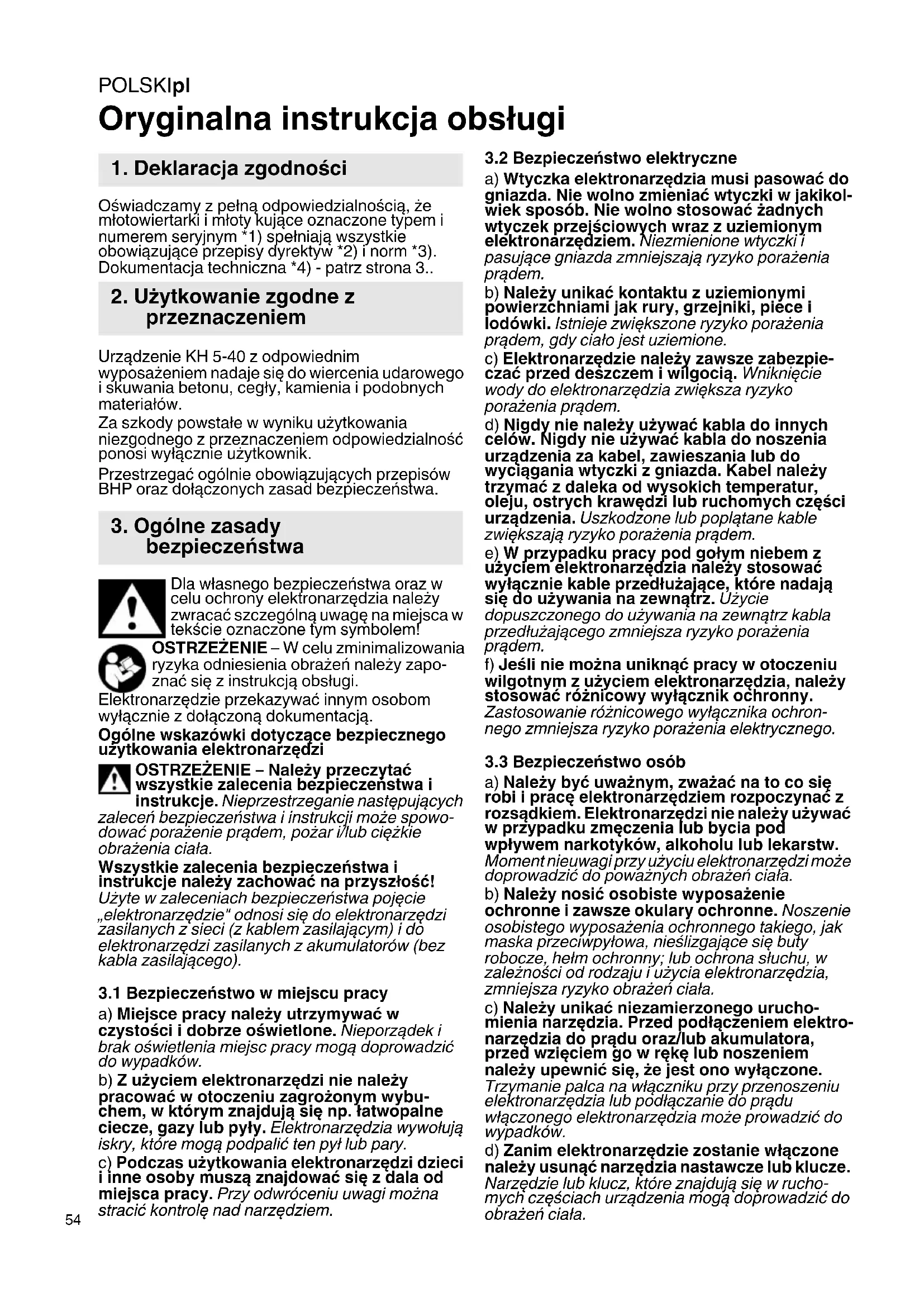 Oryginalna instrukcja obsługi Oświadczamy z pełną odpowiedzialnością, że młotowiertarki i młoty kujące oznaczone typem i numerem seryjnym *1) spełniają wszystkie obowiązujące przepisy dyrektyw *2) i norm *3). Dokumentacja techniczna *4) - patrz strona 3.. Urządzenie KH 5-40 z odpowiednim wyposażeniem nadaje się do wiercenia udarowego i skuwania betonu, cegły, kamienia i podobnych materiałów. Za szkody powstałe w wyniku użytkowania niezgodnego z przeznaczeniem odpowiedzialność ponosi wyłącznie użytkownik. Przestrzegać ogólnie obowiązujących przepisów BHP oraz dołączonych zasad bezpieczeństwa. Dla własnego bezpieczeństwa oraz w celu ochrony elektronarzędzia należy zwracać szczególną uwagę na miejsca w tekście oznaczone tym symbolem! OSTRZEŻENIE – W celu zminimalizowania ryzyka odniesienia obrażeń należy zapo- znać się z instrukcją obsługi. Elektronarzędzie przekazywać innym osobom wyłącznie z dołączoną dokumentacją. Ogólne wskazówki dotyczące bezpiecznego użytkowania elektronarzędzi OSTRZEŻENIE – Należy przeczytać wszystkie zalecenia bezpieczeństwa i instrukcje. Nieprzestrzeganie następujących zaleceń bezpieczeństwa i instrukcji może spowo- dować porażenie prądem, pożar i/lub ciężkie obrażenia ciała. Wszystkie zalecenia bezpieczeństwa i instrukcje należy zachować na przyszłość! Użyte w zaleceniach bezpieczeństwa pojęcie „elektronarzędzie" odnosi się do elektronarzędzi zasilanych z sieci (z kablem zasilającym) i do elektronarzędzi zasilanych z akumulatorów (bez kabla zasilającego).