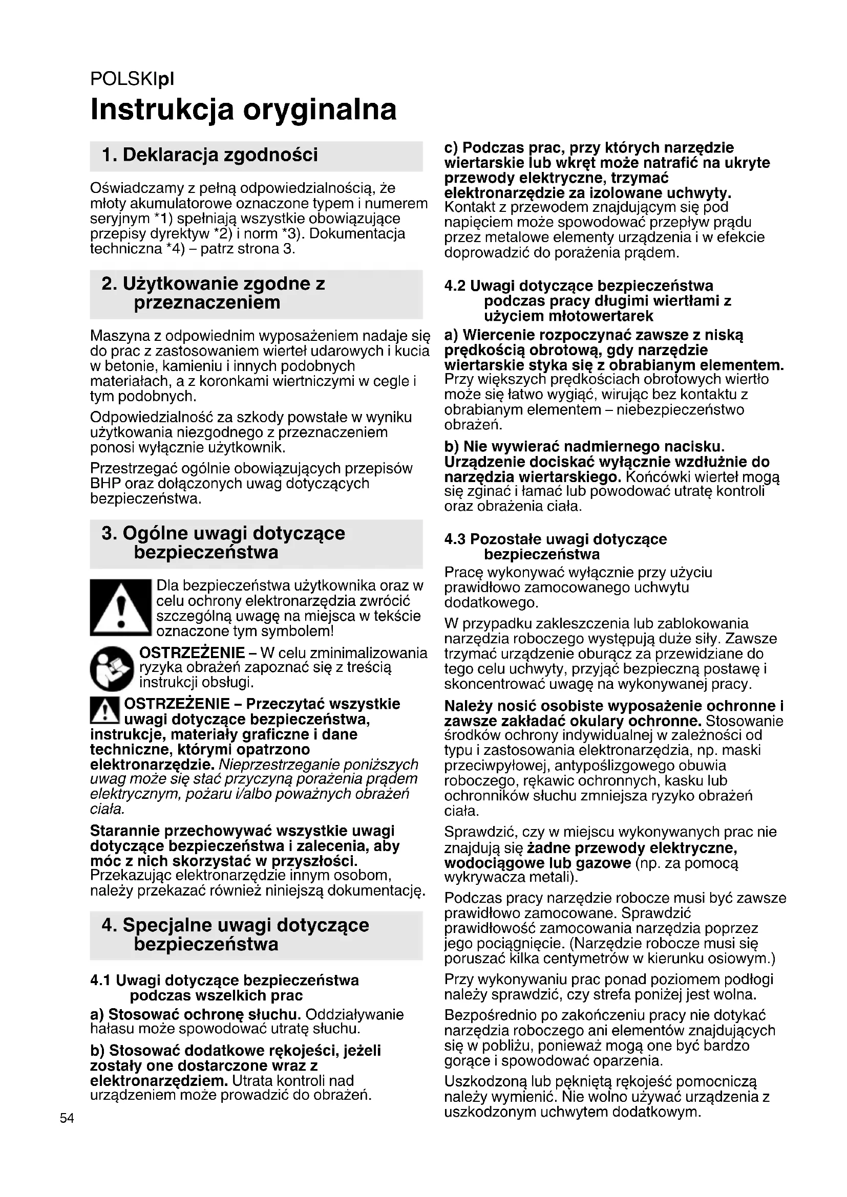Instrukcja oryginalna Oświadczamy z pełną odpowiedzialnością, że młoty akumulatorowe oznaczone typem i numerem seryjnym *1) spełniają wszystkie obowiązujące przepisy dyrektyw *2) i norm *3). Dokumentacja techniczna *4) – patrz strona 3. Maszyna z odpowiednim wyposażeniem nadaje się do prac z zastosowaniem wierteł udarowych i kucia w betonie, kamieniu i innych podobnych materiałach, a z koronkami wiertniczymi w cegle i tym podobnych. Odpowiedzialność za szkody powstałe w wyniku użytkowania niezgodnego z przeznaczeniem ponosi wyłącznie użytkownik. Przestrzegać ogólnie obowiązujących przepisów BHP oraz dołączonych uwag dotyczących bezpieczeństwa. Dla bezpieczeństwa użytkownika oraz w celu ochrony elektronarzędzia zwrócić szczególną uwagę na miejsca w tekście oznaczone tym symbolem! OSTRZEŻENIE – W celu zminimalizowania ryzyka obrażeń zapoznać się z treścią instrukcji obsługi. OSTRZEŻENIE – Przeczytać wszystkie uwagi dotyczące bezpieczeństwa, instrukcje, materiały graficzne i dane techniczne, którymi opatrzono elektronarzędzie. Nieprzestrzeganie poniższych uwag może się stać przyczyną porażenia prądem elektrycznym, pożaru i/albo poważnych obrażeń ciała. Starannie przechowywać wszystkie uwagi dotyczące bezpieczeństwa i zalecenia, aby móc z nich skorzystać w przyszłości. Przekazując elektronarzędzie innym osobom, należy przekazać również niniejszą dokumentację.