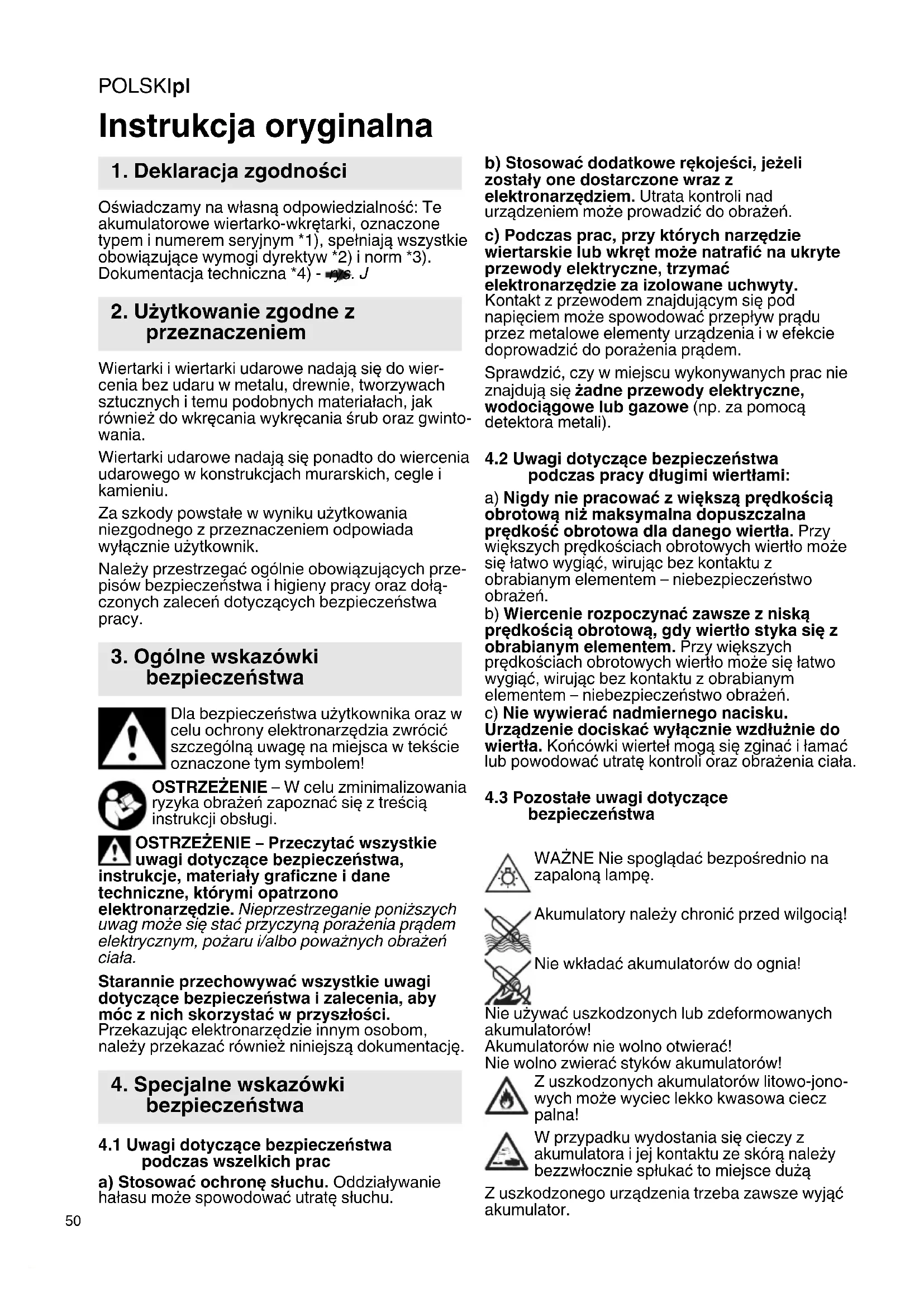 Oświadczamy na własną odpowiedzialność: Te akumulatorowe wiertarko-wkrętarki, oznaczone typem i numerem seryjnym *1), spełniają wszystkie obowiązujące wymogi dyrektyw *2) i norm *3). Dokumentacja techniczna *4) - rys. J Wiertarki i wiertarki udarowe nadają się do wier- cenia bez udaru w metalu, drewnie, tworzywach sztucznych i temu podobnych materiałach, jak również do wkręcania wykręcania śrub oraz gwinto- wania. Wiertarki udarowe nadają się ponadto do wiercenia udarowego w konstrukcjach murarskich, cegle i kamieniu. Za szkody powstałe w wyniku użytkowania niezgodnego z przeznaczeniem odpowiada wyłącznie użytkownik. Należy przestrzegać ogólnie obowiązujących prze- pisów bezpieczeństwa i higieny pracy oraz dołą- czonych zaleceń dotyczących bezpieczeństwa pracy. Dla bezpieczeństwa użytkownika oraz w celu ochrony elektronarzędzia zwrócić szczególną uwagę na miejsca w tekście oznaczone tym symbolem! OSTRZEŻENIE – W celu zminimalizowania ryzyka obrażeń zapoznać się z treścią instrukcji obsługi. OSTRZEŻENIE – Przeczytać wszystkie uwagi dotyczące bezpieczeństwa, instrukcje, materiały graficzne i dane techniczne, którymi opatrzono elektronarzędzie. Nieprzestrzeganie poniższych uwag może się stać przyczyną porażenia prądem elektrycznym, pożaru i/albo poważnych obrażeń ciała. Starannie przechowywać wszystkie uwagi dotyczące bezpieczeństwa i zalecenia, aby móc z nich skorzystać w przyszłości. Przekazując elektronarzędzie innym osobom, należy przekazać również niniejszą dokumentację.
