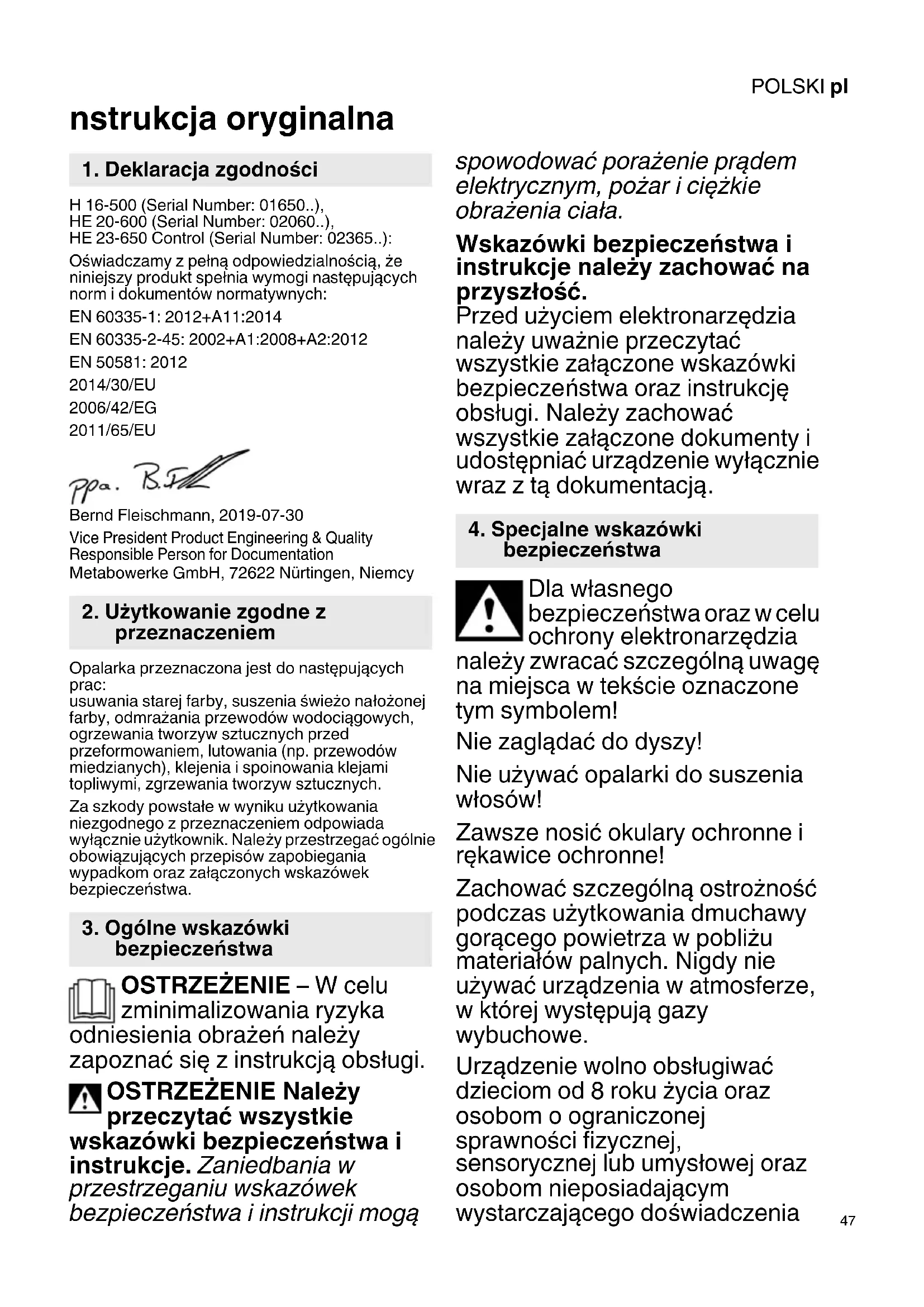 nstrukcja oryginalna H 16-500 (Serial Number: 01650..), HE 20-600 (Serial Number: 02060..), HE 23-650 Control (Serial Number: 02365..): Oświadczamy z pełną odpowiedzialnością, że niniejszy produkt spełnia wymogi następujących norm i dokumentów normatywnych: EN 60335-1: 2012+A11:2014 EN 60335-2-45: 2002+A1:2008+A2:2012 EN 50581: 2012 2014/30/EU 2006/42/EG 2011/65/EU Bernd Fleischmann, 2019-07-30 Vice President Product Engineering & Quality Responsible Person for Documentation Metabowerke GmbH, 72622 Nürtingen, Niemcy Opalarka przeznaczona jest do następujących prac: usuwania starej farby, suszenia świeżo nałożonej farby, odmrażania przewodów wodociągowych, ogrzewania tworzyw sztucznych przed przeformowaniem, lutowania (np. przewodów miedzianych), klejenia i spoinowania klejami topliwymi, zgrzewania tworzyw sztucznych. Za szkody powstałe w wyniku użytkowania niezgodnego z przeznaczeniem odpowiada wyłącznie użytkownik. Należy przestrzegać ogólnie obowiązujących przepisów zapobiegania wypadkom oraz załączonych wskazówek bezpieczeństwa. OSTRZEŻENIE – W celu zminimalizowania ryzyka odniesienia obrażeń należy zapoznać się z instrukcją obsługi. OSTRZEŻENIE Należy przeczytać wszystkie wskazówki bezpieczeństwa i instrukcje. Zaniedbania w przestrzeganiu wskazówek bezpieczeństwa i instrukcji mogą spowodować porażenie prądem elektrycznym, pożar i ciężkie obrażenia ciała. Wskazówki bezpieczeństwa i instrukcje należy zachować na przyszłość. Przed użyciem elektronarzędzia należy uważnie przeczytać wszystkie załączone wskazówki bezpieczeństwa oraz instrukcję obsługi. Należy zachować wszystkie załączone dokumenty i udostępniać urządzenie wyłącznie wraz z tą dokumentacją. Dla własnego bezpieczeństwa oraz w celu ochrony elektronarzędzia należy zwracać szczególną uwagę na miejsca w tekście oznaczone tym symbolem! Nie zaglądać do dyszy! Nie używać opalarki do suszenia włosów! Zawsze nosić okulary ochronne i rękawice ochronne! Zachować szczególną ostrożność podczas użytkowania dmuchawy gorącego powietrza w pobliżu materiałów palnych. Nigdy nie używać urządzenia w atmosferze, w której występują gazy wybuchowe. Urządzenie wolno obsługiwać dzieciom od 8 roku życia oraz osobom o ograniczonej sprawności fizycznej, sensorycznej lub umysłowej oraz osobom nieposiadającym wystarczającego doświadczenia