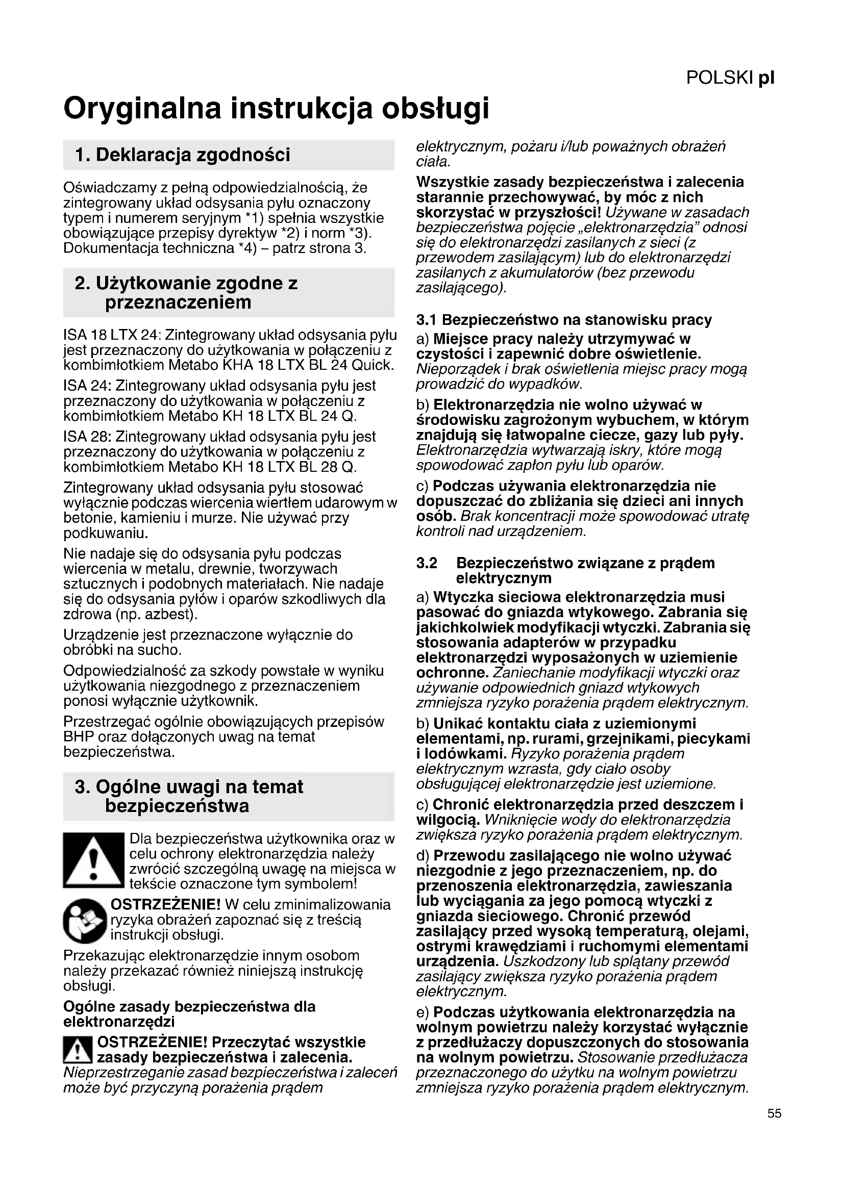 Oryginalna instrukcja obsługi Oświadczamy z pełną odpowiedzialnością, że zintegrowany układ odsysania pyłu oznaczony typem i numerem seryjnym *1) spełnia wszystkie obowiązujące przepisy dyrektyw *2) i norm *3). Dokumentacja techniczna *4) – patrz strona 3. ISA 18 LTX 24: Zintegrowany układ odsysania pyłu jest przeznaczony do użytkowania w połączeniu z kombimłotkiem Metabo KHA 18 LTX BL 24 Quick. ISA 24: Zintegrowany układ odsysania pyłu jest przeznaczony do użytkowania w połączeniu z kombimłotkiem Metabo KH 18 LTX BL 24 Q. ISA 28: Zintegrowany układ odsysania pyłu jest przeznaczony do użytkowania w połączeniu z kombimłotkiem Metabo KH 18 LTX BL 28 Q. Zintegrowany układ odsysania pyłu stosować wyłącznie podczas wiercenia wiertłem udarowym w betonie, kamieniu i murze. Nie używać przy podkuwaniu. Nie nadaje się do odsysania pyłu podczas wiercenia w metalu, drewnie, tworzywach sztucznych i podobnych materiałach. Nie nadaje się do odsysania pyłów i oparów szkodliwych dla zdrowa (np. azbest). Urządzenie jest przeznaczone wyłącznie do obróbki na sucho. Odpowiedzialność za szkody powstałe w wyniku użytkowania niezgodnego z przeznaczeniem ponosi wyłącznie użytkownik. Przestrzegać ogólnie obowiązujących przepisów BHP oraz dołączonych uwag na temat bezpieczeństwa. Dla bezpieczeństwa użytkownika oraz w celu ochrony elektronarzędzia należy zwrócić szczególną uwagę na miejsca w tekście oznaczone tym symbolem! OSTRZEŻENIE! W celu zminimalizowania ryzyka obrażeń zapoznać się z treścią instrukcji obsługi. Przekazując elektronarzędzie innym osobom należy przekazać również niniejszą instrukcję obsługi. Ogólne zasady bezpieczeństwa dla elektronarzędzi OSTRZEŻENIE! Przeczyta ć wszystkie zasady bezpieczeństwa i zalecenia. Nieprzestrzeganie zasad bezpieczeństwa i zaleceń może być przyczyną porażenia prądem elektrycznym, pożaru i/lub poważnych obrażeń ciała. Wszystkie zasady bezpieczeństwa i zalecenia starannie przechowywać, by móc z nich skorzystać w przyszłości! Używane w zasadach bezpieczeństwa pojęcie „elektronarzędzia” odnosi się do elektronarzędzi zasilanych z sieci (z przewodem zasilającym) lub do elektronarzędzi zasilanych z akumulatorów (bez przewodu zasilającego).