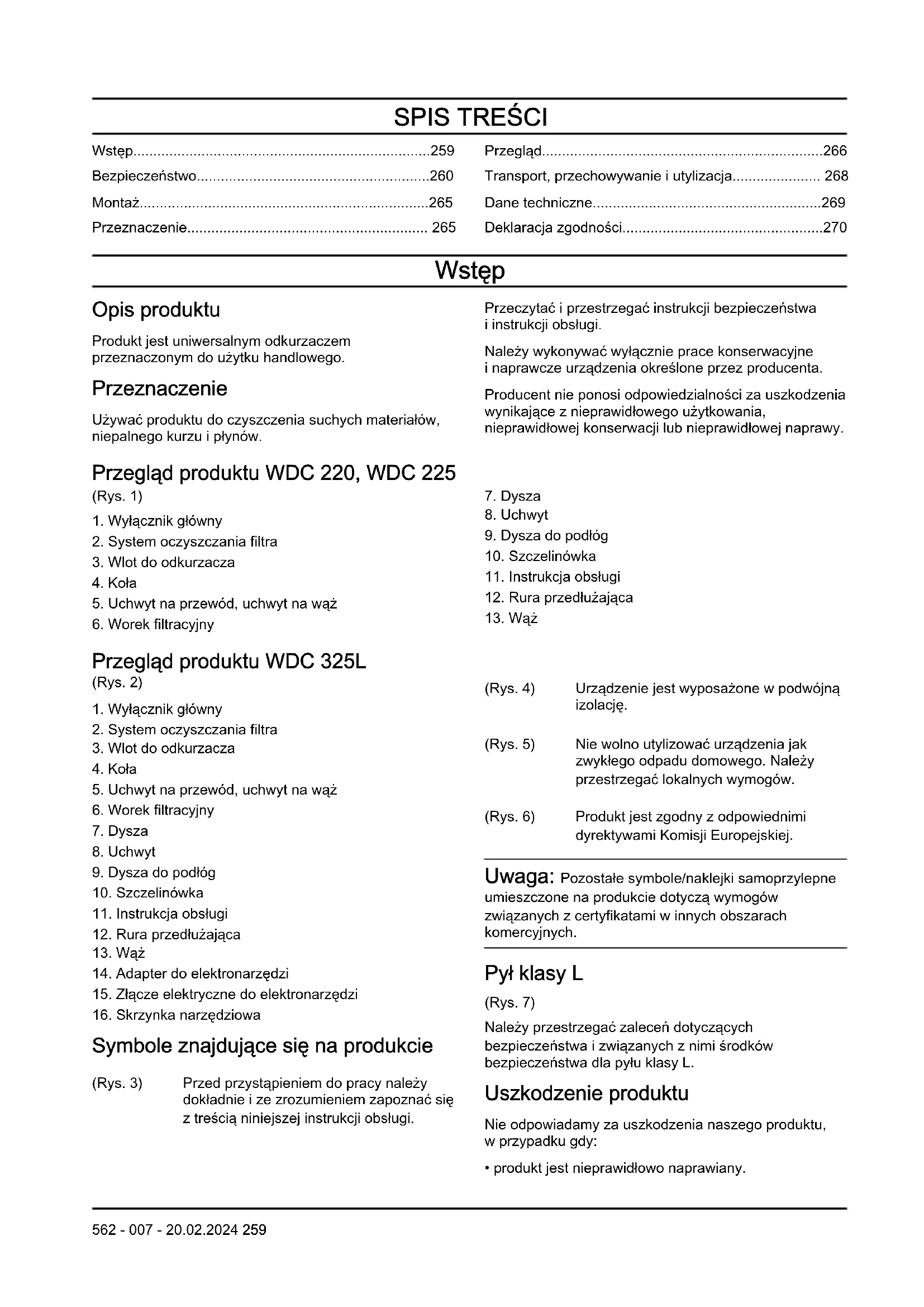 - Deklaracja zgodności Wstęp Opis produktu Produkt jest uniwersalnym odkurzaczem przeznaczonym do użytku handlowego. Przeznaczenie Używać produktu do czyszczenia suchych materiałów, niepalnego kurzu i płynów. Przeczytać i przestrzegać instrukcji bezpieczeństwa i instrukcji obsługi. Należy wykonywać wyłącznie prace konserwacyjne i naprawcze urządzenia określone przez producenta. Producent nie ponosi odpowiedzialności za uszkodzenia wynikające z nieprawidłowego użytkowania, nieprawidłowej konserwacji lub nieprawidłowej naprawy. Przegląd produktu WDC 220, WDC 225 (Rys. 1) p. 270