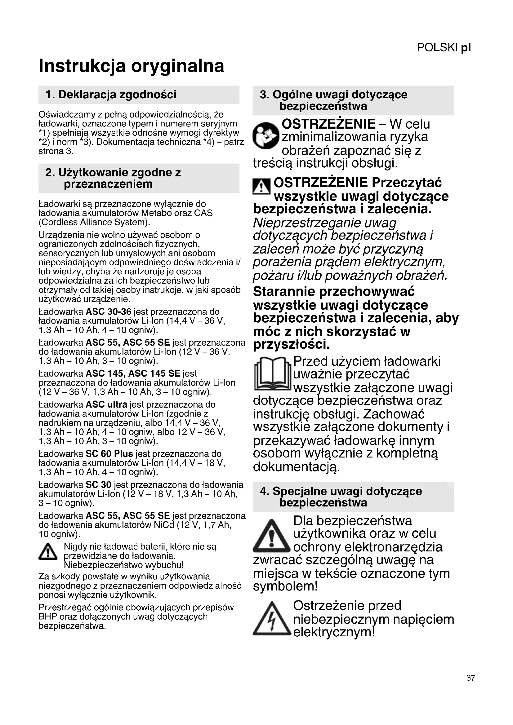 Instrukcja oryginalna Oświadczamy z pełną odpowiedzialnością, że ładowarki, oznaczone typem i numerem seryjnym *1) spełniają wszystkie odnośne wymogi dyrektyw *2) i norm *3). Dokumentacja techniczna *4) – patrz strona 3. Ładowarki są przeznaczone wyłącznie do ładowania akumulatorów Metabo oraz CAS (Cordless Alliance System). Urządzenia nie wolno używać osobom o ograniczonych zdolnościach fizycznych, sensorycznych lub umysłowych ani osobom nieposiadającym odpowiedniego doświadczenia i/ lub wiedzy, chyba że nadzoruje je osoba odpowiedzialna za ich bezpieczeństwo lub otrzymały od takiej osoby instrukcje, w jaki sposób użytkować urządzenie. Ładowarka ASC 30-36 jest przeznaczona do ładowania akumulatorów Li-Ion (14,4 V – 36 V, 1,3 Ah – 10 Ah, 4 – 10 ogniw). Ładowarka ASC 55, ASC 55 SE jest przeznaczona do ładowania akumulatorów Li-Ion (12 V – 36 V, 1,3 Ah – 10 Ah, 3 – 10 ogniw). Ładowarka ASC 145, ASC 145 SE jest przeznaczona do ładowania akumulatorów Li-Ion (12 V – 36 V, 1,3 Ah – 10 Ah, 3 – 10 ogniw). Ładowarka ASC ultra jest przeznaczona do ładowania akumulatorów Li-Ion (zgodnie z nadrukiem na urządzeniu, albo 14,4 V – 36 V, 1,3 Ah – 10 Ah, 4 – 10 ogniw, albo 12 V – 36 V, 1,3 Ah – 10 Ah, 3 – 10 ogniw). Ładowarka SC 60 Plus jest przeznaczona do ładowania akumulatorów Li-Ion (14,4 V – 18 V, 1,3 Ah – 10 Ah, 4 – 10 ogniw). Ładowarka SC 30 jest przeznaczona do ładowania akumulatorów Li-Ion (12 V – 18 V, 1,3 Ah – 10 Ah, 3 – 10 ogniw). Ładowarka ASC 55, ASC 55 SE jest przeznaczona do ładowania akumulatorów NiCd (12 V, 1,7 Ah, 10 ogniw). Nigdy nie ładować baterii, które nie są przewidziane do ładowania. Niebezpieczeństwo wybuchu! Za szkody powstałe w wyniku użytkowania niezgodnego z przeznaczeniem odpowiedzialność ponosi wyłącznie użytkownik. Przestrzegać ogólnie obowiązujących przepisów BHP oraz dołączonych uwag dotyczących bezpieczeństwa. OSTRZEŻENIE – W celu zminimalizowania ryzyka obrażeń zapoznać się z treścią instrukcji obsługi. OSTRZEŻENIE Przeczytać wszystkie uwagi dotyczące bezpieczeństwa i zalecenia. Nieprzestrzeganie uwag dotyczących bezpieczeństwa i zaleceń może być przyczyną porażenia prądem elektrycznym, pożaru i/lub poważnych obrażeń. Starannie przechowywać wszystkie uwagi dotyczące bezpieczeństwa i zalecenia, aby móc z nich skorzystać w przyszłości. Przed użyciem ładowarki uważnie przeczytać wszystkie załączone uwagi dotyczące bezpieczeństwa oraz instrukcję obsługi. Zachować wszystkie załączone dokumenty i przekazywać ładowarkę innym osobom wyłącznie z kompletną dokumentacją. Dla bezpieczeństwa użytkownika oraz w celu ochrony elektronarzędzia zwracać szczególną uwagę na miejsca w tekście oznaczone tym symbolem! Ostrzeżenie przed niebezpiecznym napięciem elektrycznym!