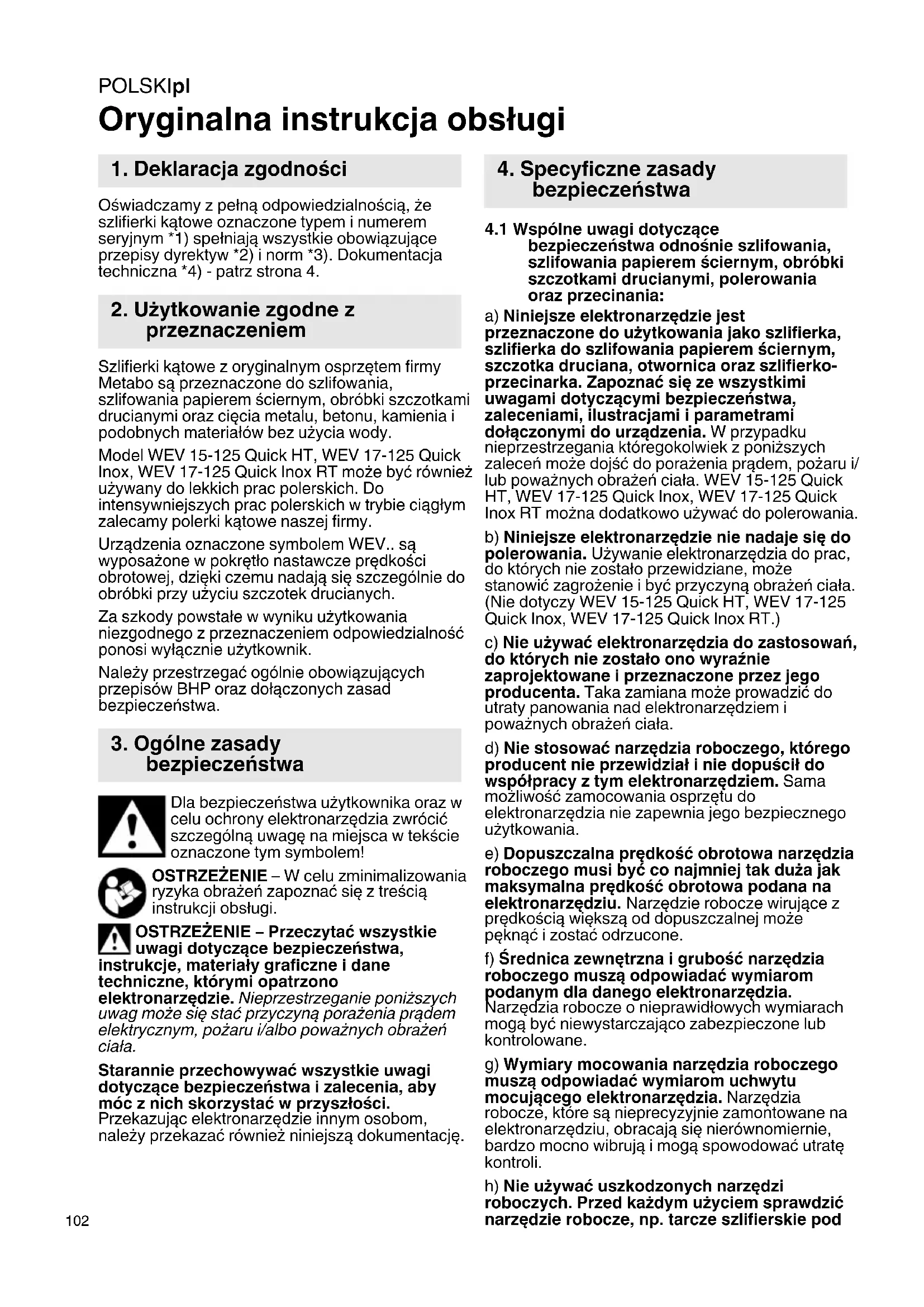 Oryginalna instrukcja obsługi Oświadczamy z pełną odpowiedzialnością, że szlifierki kątowe oznaczone typem i numerem seryjnym *1) spełniają wszystkie obowiązujące przepisy dyrektyw *2) i norm *3). Dokumentacja techniczna *4) - patrz strona 4. Szlifierki kątowe z oryginalnym osprzętem firmy Metabo są przeznaczone do szlifowania, szlifowania papierem ściernym, obróbki szczotkami drucianymi oraz cięcia metalu, betonu, kamienia i podobnych materiałów bez użycia wody. Model WEV 15-125 Quick HT, WEV 17-125 Quick Inox, WEV 17-125 Quick Inox RT może być również używany do lekkich prac polerskich. Do intensywniejszych prac polerskich w trybie ciągłym zalecamy polerki kątowe naszej firmy. Urządzenia oznaczone symbolem WEV.. są wyposażone w pokrętło nastawcze prędkości obrotowej, dzięki czemu nadają się szczególnie do obróbki przy użyciu szczotek drucianych. Za szkody powstałe w wyniku użytkowania niezgodnego z przeznaczeniem odpowiedzialność ponosi wyłącznie użytkownik. Należy przestrzegać ogólnie obowiązujących przepisów BHP oraz dołączonych zasad bezpieczeństwa. Dla bezpieczeństwa użytkownika oraz w celu ochrony elektronarzędzia zwrócić szczególną uwagę na miejsca w tekście oznaczone tym symbolem! OSTRZEŻENIE – W celu zminimalizowania ryzyka obrażeń zapoznać się z treścią instrukcji obsługi. OSTRZEŻENIE – Przeczytać wszystkie uwagi dotyczące bezpieczeństwa, instrukcje, materiały graficzne i dane techniczne, którymi opatrzono elektronarzędzie. Nieprzestrzeganie poniższych uwag może się stać przyczyną porażenia prądem elektrycznym, pożaru i/albo poważnych obrażeń ciała. Starannie przechowywać wszystkie uwagi dotyczące bezpieczeństwa i zalecenia, aby móc z nich skorzystać w przyszłości. Przekazując elektronarzędzie innym osobom, należy przekazać również niniejszą dokumentację.