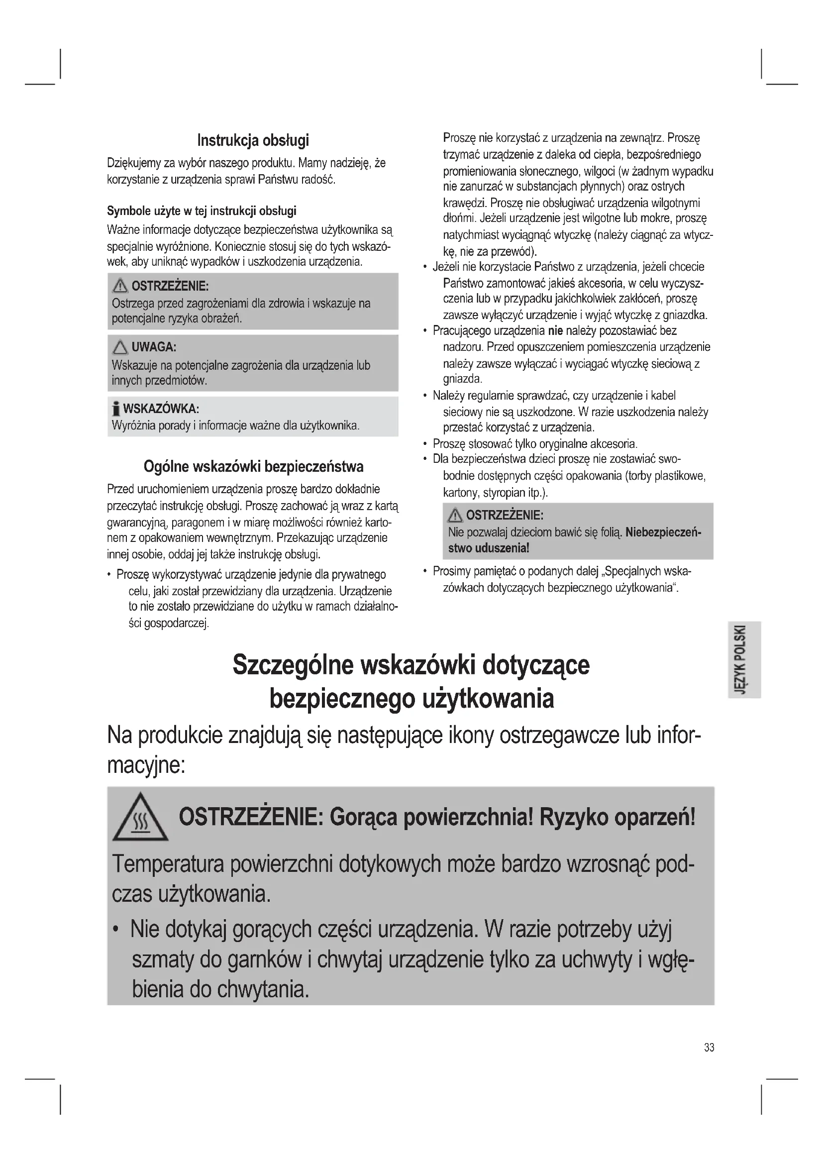- Prosimy pamiętać o podanych dalej „Specjalnych wska- zówkach dotyczących bezpiecznego użytkowania“. Szczególne wskazówki dotyczące bezpiecznego użytkowania Na produkcie znajdują się następujące ikony ostrzegawcze lub infor- macyjne: OSTRZEŻENIE: Gorąca powierzchnia! Ryzyko oparzeń! Temperatura powierzchni dotykowych może bardzo wzrosnąć pod- czas użytkowania.