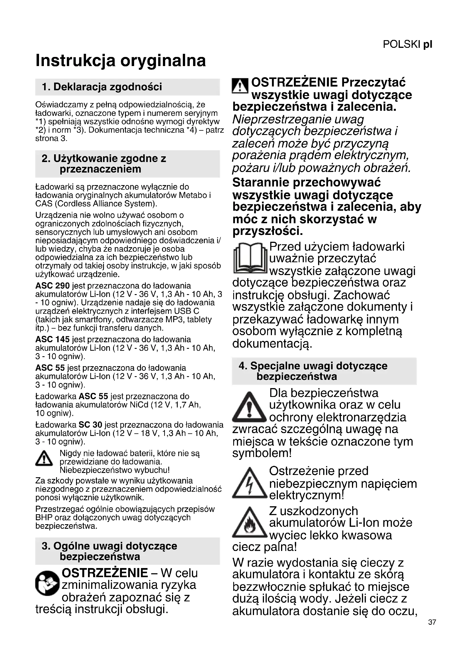 Instrukcja oryginalna Oświadczamy z pełną odpowiedzialnością, że ładowarki, oznaczone typem i numerem seryjnym *1) spełniają wszystkie odnośne wymogi dyrektyw *2) i norm *3). Dokumentacja techniczna *4) – patrz strona 3. Ładowarki są przeznaczone wyłącznie do ładowania oryginalnych akumulatorów Metabo i CAS (Cordless Alliance System). Urządzenia nie wolno używać osobom o ograniczonych zdolnościach fizycznych, sensorycznych lub umysłowych ani osobom nieposiadającym odpowiedniego doświadczenia i/ lub wiedzy, chyba że nadzoruje je osoba odpowiedzialna za ich bezpieczeństwo lub otrzymały od takiej osoby instrukcje, w jaki sposób użytkować urządzenie. ASC 290 jest przeznaczona do ładowania akumulatorów Li-Ion (12 V - 36 V, 1,3 Ah - 10 Ah, 3 - 10 ogniw). Urządzenie nadaje się do ładowania urządzeń elektrycznych z interfejsem USB C (takich jak smartfony, odtwarzacze MP3, tablety itp.) – bez funkcji transferu danych. ASC 145 jest przeznaczona do ładowania akumulatorów Li-Ion (12 V - 36 V, 1,3 Ah - 10 Ah,