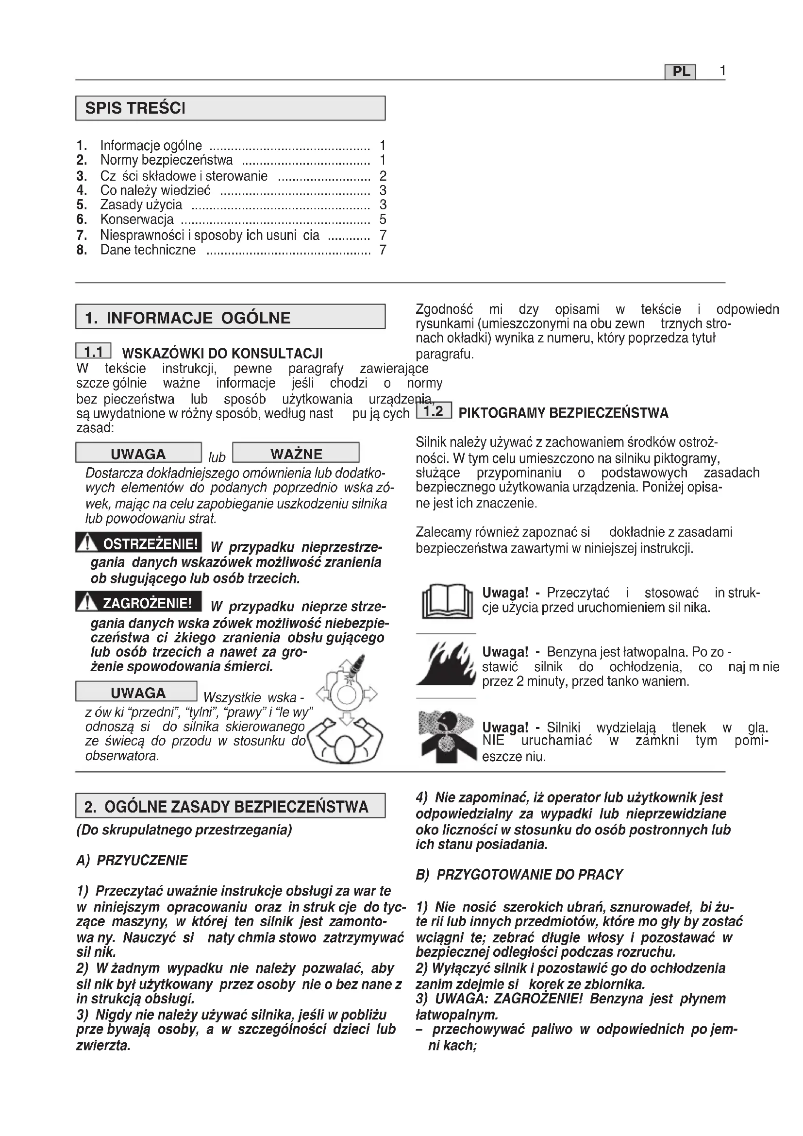 Silnik należy używać z zachowaniem środków ostroż- ności. W tym celu umieszczono na silniku piktogramy, służące przypominaniu o podstawowych zasadach bezpiecznego użytkowania urządzenia. Poniżej opisa- ne jest ich znaczenie. Zalecamy również zapoznać si dokładnie z zasadami bezpieczeństwa zawartymi w niniejszej instrukcji. Uwaga! - Przeczytać i stosować in struk- cje użycia przed uruchomieniem sil nika. Uwaga! - Benzyna jest łatwopalna. Po zo - stawić silnik do ochłodzenia, co naj m niej przez 2 minuty, przed tanko waniem. Uwaga! - Silniki wydzielają tlenek w gla. NIE uruchamiać w zamkni tym pomi- eszcze niu.