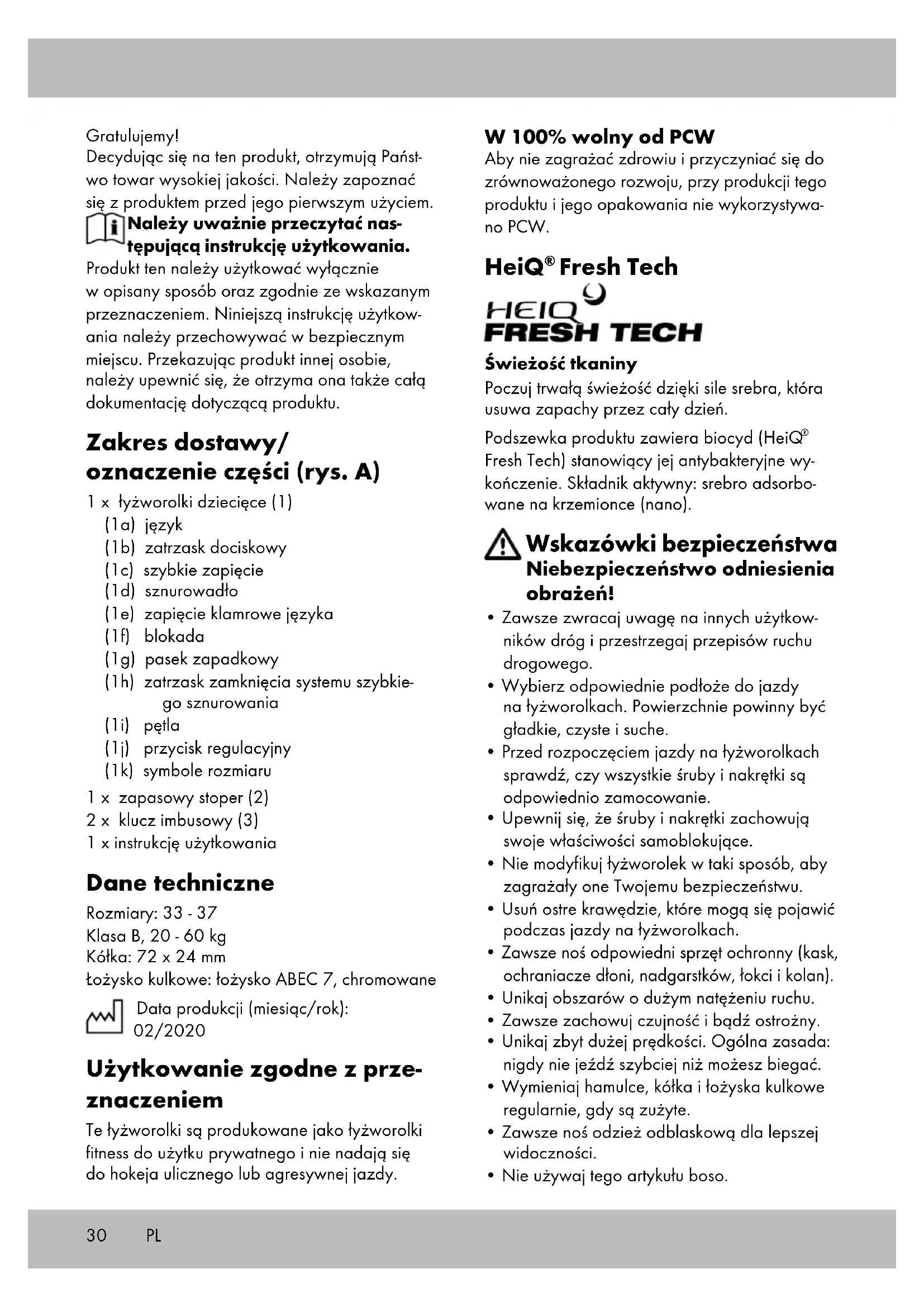- Nie używaj tego artykułu boso. Gratulujemy! Decydując się na ten produkt, otrzymują Państ- wo towar wysokiej jakości. Należy zapoznać się z produktem przed jego pierwszym użyciem. Należy uważnie przeczytać nas- tępującą instrukcję użytkowania. Produkt ten należy użytkować wyłącznie w opisany sposób oraz zgodnie ze wskazanym przeznaczeniem. Niniejszą instrukcję użytkow- ania należy przechowywać w bezpiecznym miejscu. Przekazując produkt innej osobie, należy upewnić się, że otrzyma ona także całą dokumentację dotyczącą produktu. Zakres dostawy/ oznaczenie części (rys. A) 1 x łyżworolki dziecięce (1) (1a) język (1b) zatrzask dociskowy (1c) szybkie zapięcie (1d) sznurowadło (1e) zapięcie klamrowe języka (1f) blokada (1g) pasek zapadkowy (1h) zatrzask zamknięcia systemu szybkie- go sznurowania (1i) pętla (1j) przycisk regulacyjny (1k) symbole rozmiaru 1 x zapasowy stoper (2) 2 x klucz imbusowy (3) 1 x instrukcję użytkowania Dane techniczne Rozmiary: 33 - 37 Klasa B, 20 - 60 kg Kółka: 72 x 24 mm Łożysko kulkowe: łożysko ABEC 7, chromowane Data produkcji (miesiąc/rok): 02/2020 Użytkowanie zgodne z prze- znaczeniem Te łyżworolki są produkowane jako łyżworolki fitness do użytku prywatnego i nie nadają się do hokeja ulicznego lub agresywnej jazdy. PL31PL Techniki hamowania Wskazówka: ćwicz różne techniki hamowania na pła- skiej powierzchni bez ruchu drogowego i bez pieszych. Unikaj pochyłości, dopóki nie opanu- jesz technik hamowania. Hamulec na pięcie (rys. C): jeśli Twoje łyżworolki są wyposażone w hamul- ce, pamiętaj o ich użyciu. Lekko unieś przód łyżworolki, na której zamontowany jest hamulec, i przyciśnij hamulec do ziemi. Przenieś lekko ciężar ciała do przodu i ugnij kolana. Hamowa- nie można poprawić, mocniej uginając kolana i przesuwając ciężar ciała bardziej do przodu, jednocześnie zwiększając nacisk na hamującą łyżworolkę. Hamulec T (rys. D): jeśli łyżworolki nie są wyposażone w hamulec lub hamulec został usunięty, zalecamy użycie „techniki T-Stop” – jest ona odpowiednia tylko dla osób zaawansowanych w jeździe na łyżwo- rolkach! Podczas korzystania z techniki „T-stop” przenieś cały swój ciężar na jedną nogę. Teraz przesuń drugą stopę za pierwszą i ustaw ją pod kątem prostym. Następnie przenieś swój ciężar z przodu do wnętrza kółek tylnej łyżworolki i hamuj z ro- snącym naciskiem. Ustawianie rozmiaru (rys. E) Naciśnij przycisk regulacji (1j) i przesuń but do żądanego rozmiaru, przytrzymując jedno- cześnie przycisk regulacji. But musi zatrzasnąć się słyszalnym „KLIKNIĘ- CIEM”. Strzałka na bucie wskazuje odpowiedni rozmiar (1k) na ramie. Regulacja szerokości (rys. F) Poluzuj śrubę na spodzie produktu za pomocą dołączonego długiego klucza imbusowego (3), obracając go w kierunku strzałki. Dostosuj szerokość, przesuwając but zgodnie ze swoimi indywidualnymi potrzebami. Następnie ponownie dokręć śrubę. Zapobieganie szkodom material- nym!