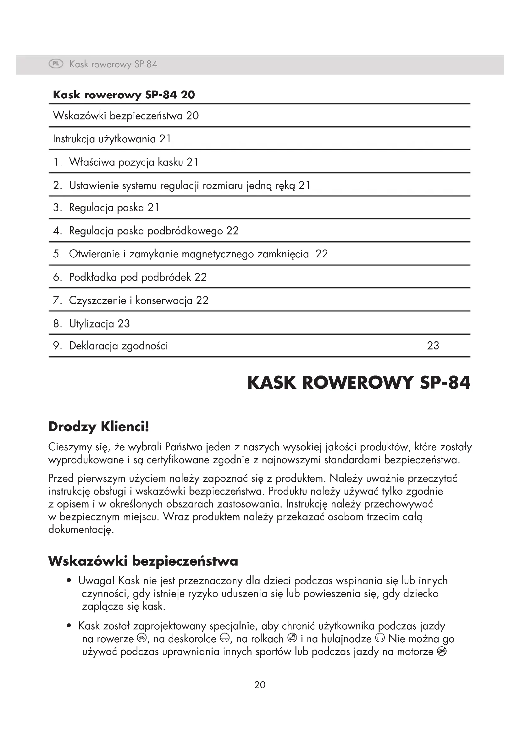 Kask rowerowy SP-84 20 Wskazówki bezpieczeństwa 20 Instrukcja użytkowania 21