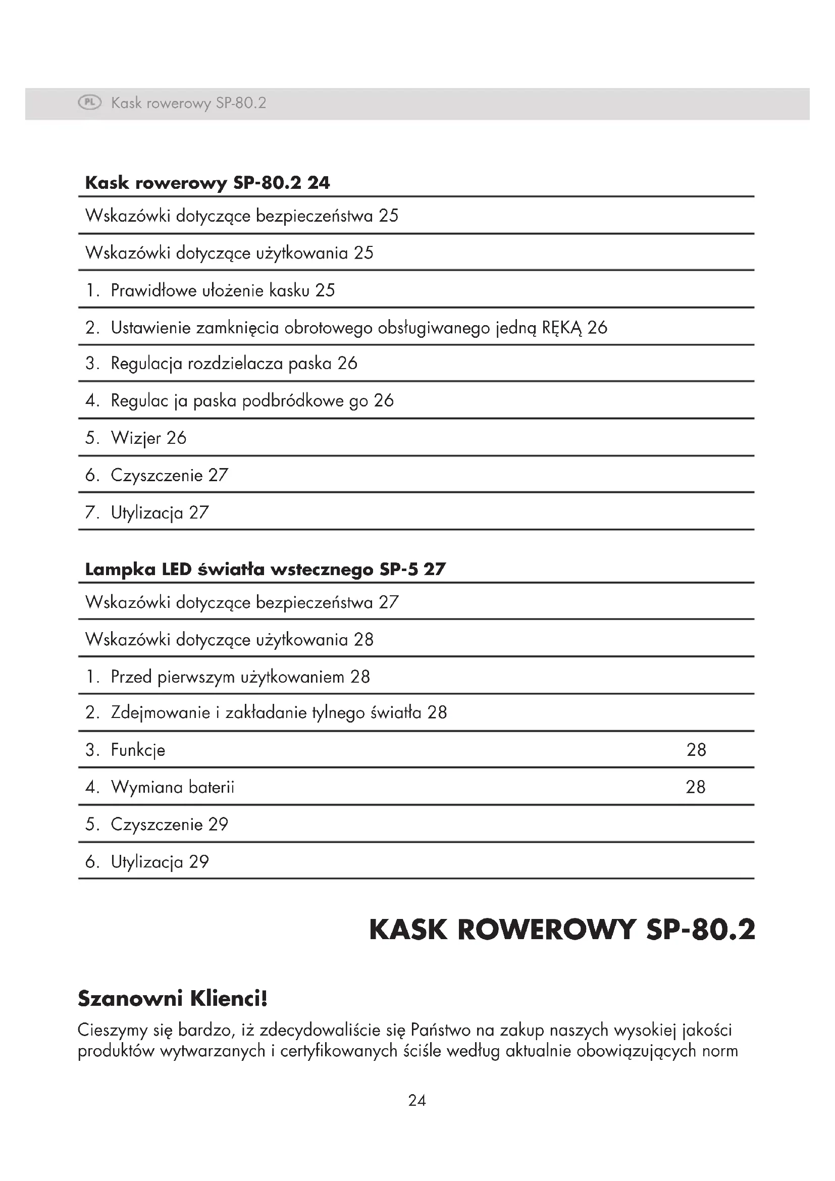 Szanowni Klienci! Cieszymy się bardzo, iż zdecydowaliście się Państwo na zakup naszych wysokiej jakości produktów wytwarzanych i certykowanych ściśle według aktualnie obowiązujących norm Kask rowerowy SP-80.2 24 Wskazówki dotyczące bezpieczeństwa 25 Wskazówki dotyczące użytkowania 25