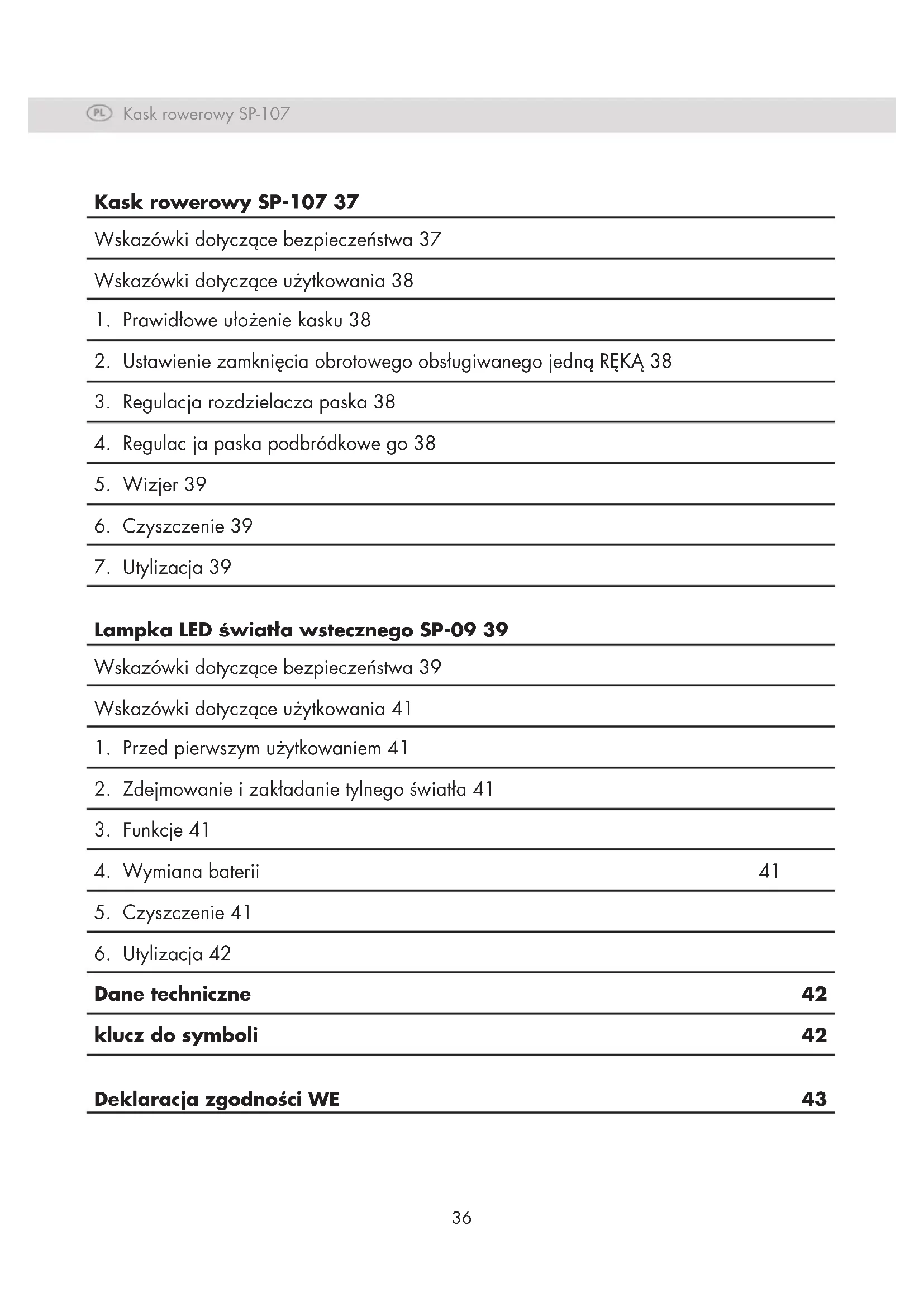 Nie wolno wyrzucać baterii razem z odpadami domowymi, należy je włożyć do odpowiednich pojemników zbiorczych. Starych urządzeń nie wolno wyrzucać do odpadów domowych! W przypadku braku możliwości dalszej eksploatacji produktu użytkownik jest prawnie zobowiązany do segregacji i przekazania starego urządzenia do punktu zbiórki surowców wtórnych w swojej gminie/dzielnicy. W ten sposób zapewnia się profesjonalną utylizację starych urządzeń i uniknięcie negatywnego wpływu na środowisko naturalne. Dlatego urządzenia elektryczne są oznaczone przedstawionym symbolem. Baterie i akumulatorki nie mogą być wyrzucane do odpadów do- mowych! Jako konsument jesteś prawnie zobowiązany do oddania wszystkich baterii i akumulator- ków, niezależnie od tego, czy zawierają one substancje szkodliwe* czy nie, do punktu zbiórki w Twojej gminie lub do sklepu, aby mogły zostać zutylizowane w sposób przyjazny dla środowiska. Baterie i akumulatory, które nie są na stałe zamontowane w urządzeniu, należy przed utylizacją wyjąć i zutylizować oddzielnie. Baterie i akumulatorki należy zwracać tylko wtedy, gdy są rozładowane! *oznakowanie: Cd = kadm, Hg = rtęć, Pb = ołów Dane techniczne Światło tylne LED Model: SP-09 Bateria: 1x CR1620, 3V Klasa ochrony: III Grupa ryzyka: Wolna grupa (lampa nie stanowi zagrożenia fotobiologicznego.) klucz do symboli Deklaracja zgodności (patrz rozdział „Deklaracja zgodności“): Produkty oznaczone tym symbolem są zgodne ze wszystkimi obowiązującymi przepisami Wspólnoty Europejskiej. Obszar gospodarczy. klasa ochrony lll. Światło LED jest zasilane niskim napięciem za pomocą baterii. Najlepiej sprzed daty Lampka LED światła wstecznego SP-0943 waga kasku Data produkcji Znak Jakości Zatwierdzonego Bezpieczeństwa (znak GS) potwierdza, że produkt spełnia wymagania niemieckiej ustawy o bezpieczeństwie produktów (ProdSG). Znak GS wskazuje, że bezpieczeństwo i zdrowie użytkownika nie są zagrożone, jeżeli produkt jest używany zgodnie z przeznaczeniem i jeżeli ma miejsce możliwe do przewidzenia niewłaściwe użycie oznaczonego produktu. Należy zapoznać się z instrukcją obsługi Napięcie stałe Deklaracja zgodności WE Deklarację zgodności UE można otrzymać pod następującym adresem: SPEQ GmbH Tannbachstraße 10 73635 Steinenberg GERMANY instytut badawczy TÜV Rheinland LGA Products GmbH Tillystrasse 2 90431 Nürnberg Niemcy numer identykacyjny: 0197 PSA 2016/425 Kompletną deklarację zgodności WE znajdą Państwo na www.speq.de/konformitaetserklaerung. Lampka LED światła wstecznego SP-0944 Cyklistická helma SP-107 45 Bezpečnostní pokyny 45 Pokyny pro uživatele 45