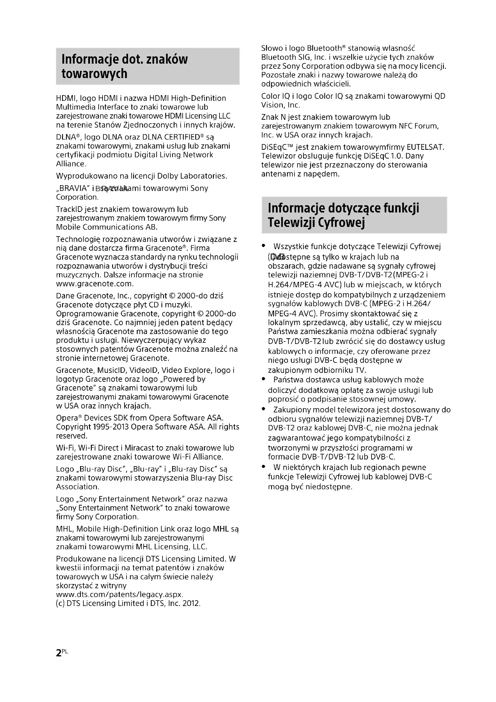 HDMI, logo HDMI i nazwa HDMI High-Definition Multimedia Interface to znaki towarowe lub zarejestrowane znaki towarowe HDMI Licensing LLC na terenie Stanów Zjednoczonych i innych krajów. DLNA®, logo DLNA oraz DLNA CERTIFIED® są znakami towarowymi, znakami usług lub znakami certyfikacji podmiotu Digital Living Network Alliance. Wyprodukowano na licencji Dolby Laboratories. „BRAVIA” i są znakami towarowymi Sony Corporation. TrackID jest znakiem towarowym lub zarejestrowanym znakiem towarowym firmy Sony Mobile Communications AB. Technologię rozpoznawania utworów i związane z nią dane dostarcza firma Gracenote®. Firma Gracenote wyznacza standardy na rynku technologii rozpoznawania utworów i dystrybucji treści muzycznych. Dalsze informacje na stronie www.gracenote.com. Dane Gracenote, Inc., copyright © 2000-do dziś Gracenote dotyczące płyt CD i muzyki. Oprogramowanie Gracenote, copyright © 2000-do dziś Gracenote. Co najmniej jeden patent będący własnością Gracenote ma zastosowanie do tego produktu i usługi. Niewyczerpujący wykaz stosownych patentów Gracenote można znaleźć na stronie internetowej Gracenote. Gracenote, MusicID, VideoID, Video Explore, logo i logotyp Gracenote oraz logo „Powered by Gracenote” są znakami towarowymi lub zarejestrowanymi znakami towarowymi Gracenote w USA oraz innych krajach. Opera® Devices SDK from Opera Software ASA. Copyright 1995-2013 Opera Software ASA. All rights reserved. Wi-Fi, Wi-Fi Direct i Miracast to znaki towarowe lub zarejestrowane znaki towarowe Wi-Fi Alliance. Logo „Blu-ray Disc”, „Blu-ray” i „Blu-ray Disc” są znakami towarowymi stowarzyszenia Blu-ray Disc Association. Logo „Sony Entertainment Network” oraz nazwa „Sony Entertainment Network” to znaki towarowe firmy Sony Corporation. MHL, Mobile High-Definition Link oraz logo MHL są znakami towarowymi lub zarejestrowanymi znakami towarowymi MHL Licensing, LLC. Produkowane na licencji DTS Licensing Limited. W kwestii informacji na temat patentów i znaków towarowych w USA i na całym świecie należy skorzystać z witryny www.dts.com/patents/legacy.aspx. (c) DTS Licensing Limited i DTS, Inc. 2012. Słowo i logo Bluetooth® stanowią własność Bluetooth SIG, Inc. i wszelkie użycie tych znaków przez Sony Corporation odbywa się na mocy licencji. Pozostałe znaki i nazwy towarowe należą do odpowiednich właścicieli. Color IQ i logo Color IQ są znakami towarowymi QD Vision, Inc. Znak N jest znakiem towarowym lub zarejestrowanym znakiem towarowym NFC Forum, Inc. w USA oraz innych krajach. DiSEqC™ jest znakiem towarowymfirmy EUTELSAT. Telewizor obsługuje funkcję DiSEqC 1.0. Dany telewizor nie jest przeznaczony do sterowania antenami z napędem. Wszystkie funkcje dotyczące Telewizji Cyfrowej ( ) dostępne są tylko w krajach lub na obszarach, gdzie nadawane są sygnały cyfrowej telewizji naziemnej DVB-T/DVB-T2 (MPEG-2 i H.264/MPEG-4 AVC) lub w miejscach, w których istnieje dostęp do kompatybilnych z urządzeniem sygnałów kablowych DVB-C (MPEG-2 i H.264/ MPEG-4 AVC). Prosimy skontaktować się z lokalnym sprzedawcą, aby ustalić, czy w miejscu Państwa zamieszkania można odbierać sygnały DVB-T/DVB-T2 lub zwrócić się do dostawcy usług kablowych o informacje, czy oferowane przez niego usługi DVB-C będą dostępne w zakupionym odbiorniku TV. Państwa dostawca usług kablowych może doliczyć dodatkową opłatę za swoje usługi lub poprosić o podpisanie stosownej umowy. Zakupiony model telewizora jest dostosowany do odbioru sygnałów telewizji naziemnej DVB-T/ DVB-T2 oraz kablowej DVB-C, nie można jednak zagwarantować jego kompatybilności z tworzonymi w przyszłości programami w formacie DVB-T/DVB-T2 lub DVB-C. W niektórych krajach lub regionach pewne funkcje Telewizji Cyfrowej lub kablowej DVB-C mogą być niedostępne. Informacje dot. znaków towarowych Informacje dotyczące funkcji Telewizji Cyfrowej3