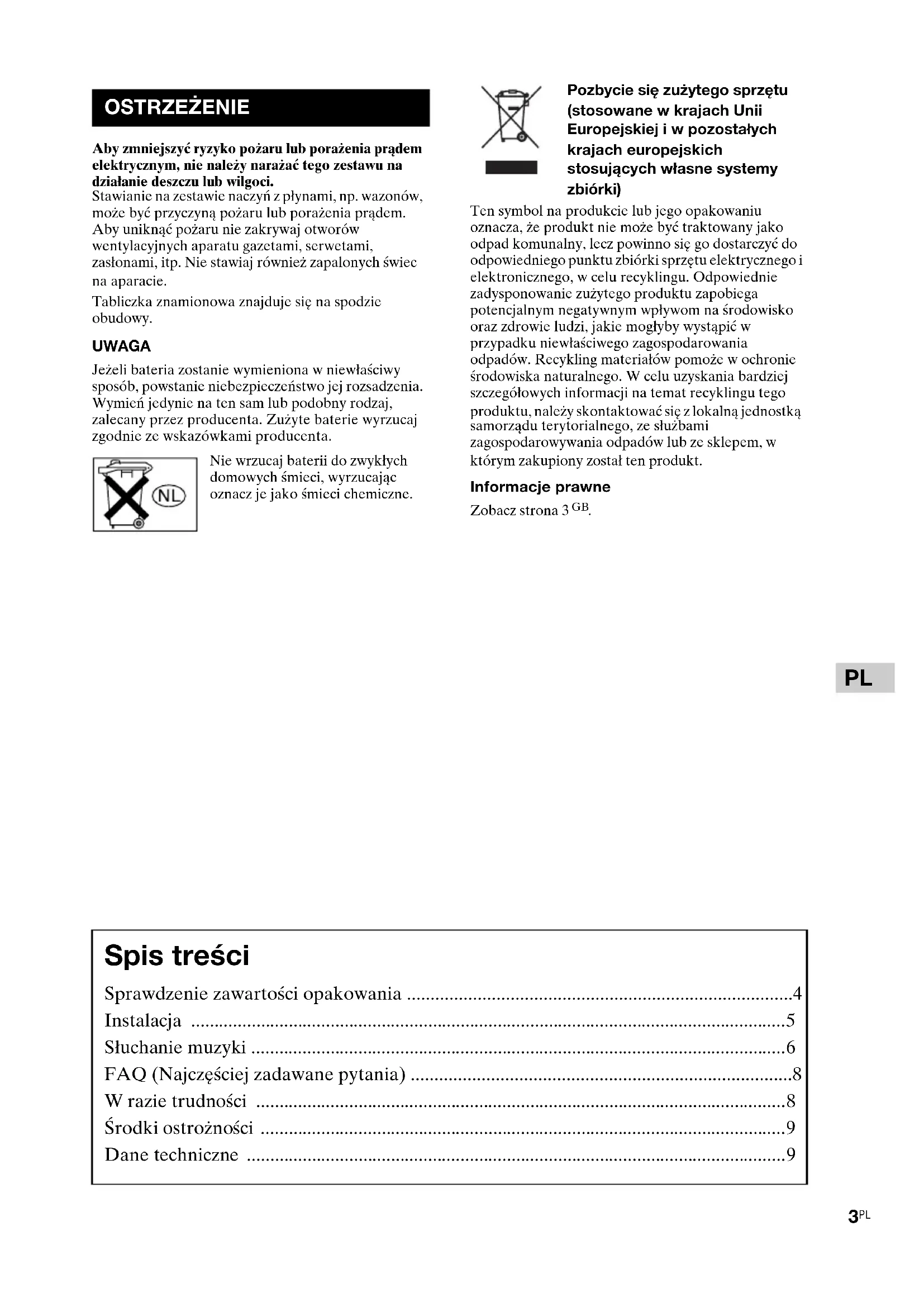 Aby zmniejszyć ryzyko pożaru lub porażenia prądem elektrycznym, nie należy narażać tego zestawu na działanie deszczu lub wilgoci.Stawianie na zestawie naczyń z płynami, np. wazonów, może być przyczyną pożaru lub porażenia prądem.Aby uniknąć pożaru nie zakrywaj otworów wentylacyjnych aparatu gazetami, serwetami, zasłonami, itp. Nie stawiaj również zapalonych świec na aparacie.Tabliczka znamionowa znajduje się na spodzie obudowy. UWAGA Jeżeli bateria zostanie wymieniona w niewłaściwy sposób, powstanie niebezpieczeństwo jej rozsadzenia. Wymień jedynie na ten sam lub podobny rodzaj, zalecany przez producenta. Zużyte baterie wyrzucaj zgodnie ze wskazówkami producenta. Nie wrzucaj baterii do zwykłych domowych śmieci, wyrzucając oznacz je jako śmieci chemiczne. Pozbycie się zużytego sprzętu (stosowane w krajach Unii Europejskiej i w pozostałych krajach europejskich stosujących własne systemy zbiórki) Ten symbol na produkcie lub jego opakowaniu oznacza, że produkt nie może być traktowany jako odpad komunalny, lecz powinno się go dostarczyć do odpowiedniego punktu zbiórki sprzętu elektrycznego i elektronicznego, w celu recyklingu. Odpowiednie zadysponowanie zużytego produktu zapobiega potencjalnym negatywnym wpływom na środowisko oraz zdrowie ludzi, jakie mogłyby wystąpić w przypadku niewłaściwego zagospodarowania odpadów. Recykling materiałów pomoże w ochronie środowiska naturalnego. W celu uzyskania bardziej szczegółowych informacji na temat recyklingu tego produktu, należy skontaktować się z lokalną jednostką samorządu terytorialnego, ze służbami zagospodarowywania odpadów lub ze sklepem, w którym zakupiony został ten produkt. Informacje prawne Zobacz strona 3