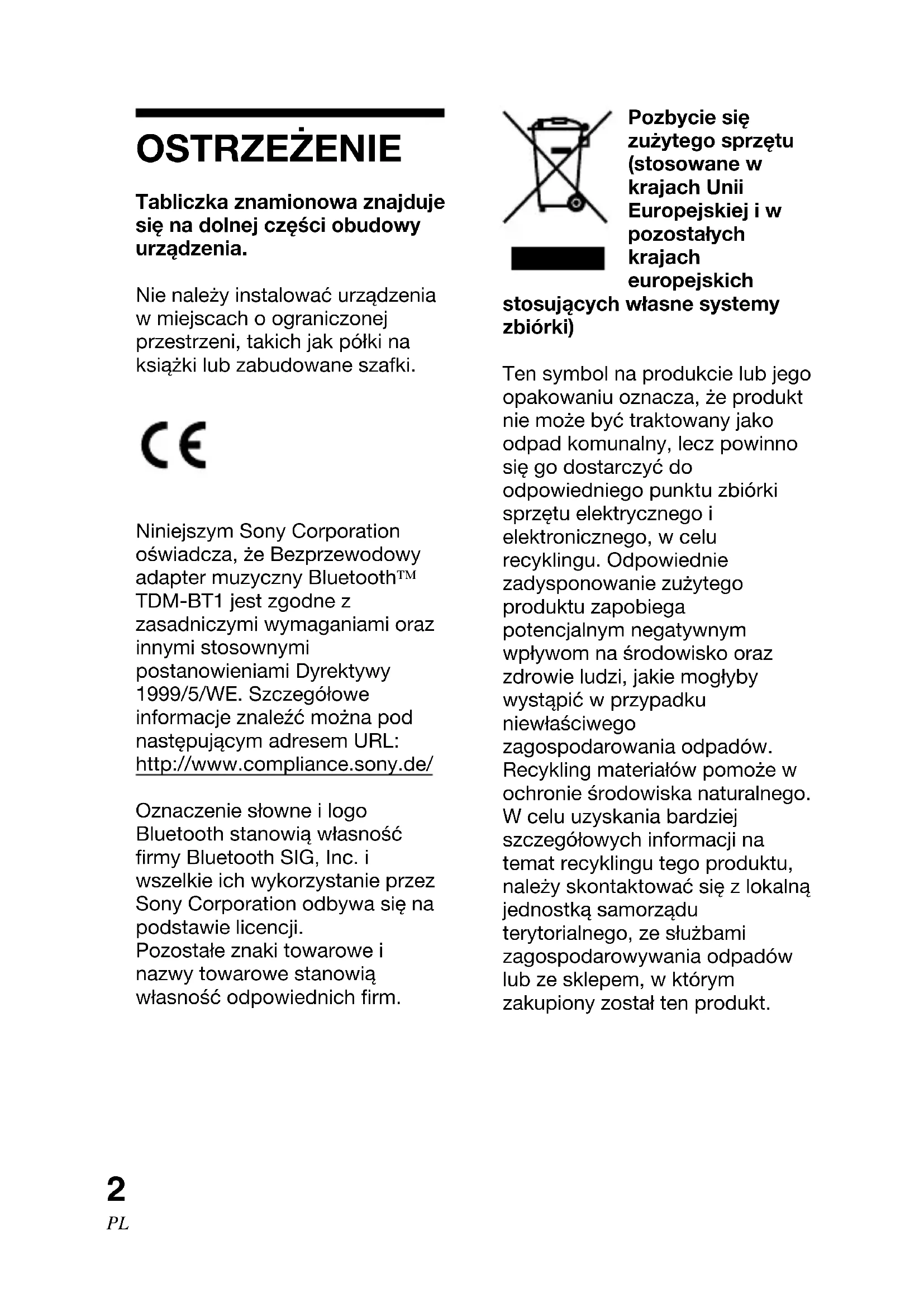 Tabliczka znamionowa znajduje się na dolnej części obudowy urządzenia. Nie należy instalować urządzenia w miejscach o ograniczonej przestrzeni, takich jak półki na książki lub zabudowane szafki. OSTRZEŻENIE Niniejszym Sony Corporation oświadcza, że Bezprzewodowy adapter muzyczny Bluetooth™ TDM-BT1 jest zgodne z zasadniczymi wymaganiami oraz innymi stosownymi postanowieniami Dyrektywy 1999/5/WE. Szczegółowe informacje znaleźć można pod następującym adresem URL: http://www.compliance.sony.de/ Oznaczenie słowne i logo Bluetooth stanowią własność firmy Bluetooth SIG, Inc. i wszelkie ich wykorzystanie przez Sony Corporation odbywa się na podstawie licencji. Pozostałe znaki towarowe i nazwy towarowe stanowią własność odpowiednich firm. Pozbycie się zużytego sprzętu (stosowane w krajach Unii Europejskiej i w pozostałych krajach europejskich stosujących własne systemy zbiórki) Ten symbol na produkcie lub jego opakowaniu oznacza, że produkt nie może być traktowany jako odpad komunalny, lecz powinno się go dostarczyć do odpowiedniego punktu zbiórki sprzętu elektrycznego i elektronicznego, w celu recyklingu. Odpowiednie zadysponowanie zużytego produktu zapobiega potencjalnym negatywnym wpływom na środowisko oraz zdrowie ludzi, jakie mogłyby wystąpić w przypadku niewłaściwego zagospodarowania odpadów. Recykling materiałów pomoże w ochronie środowiska naturalnego. W celu uzyskania bardziej szczegółowych informacji na temat recyklingu tego produktu, należy skontaktować się z lokalną jednostką samorządu terytorialnego, ze służbami zagospodarowywania odpadów lub ze sklepem, w którym zakupiony został ten produkt.TDM-BT1 [PL] 3-095-404-11(1)