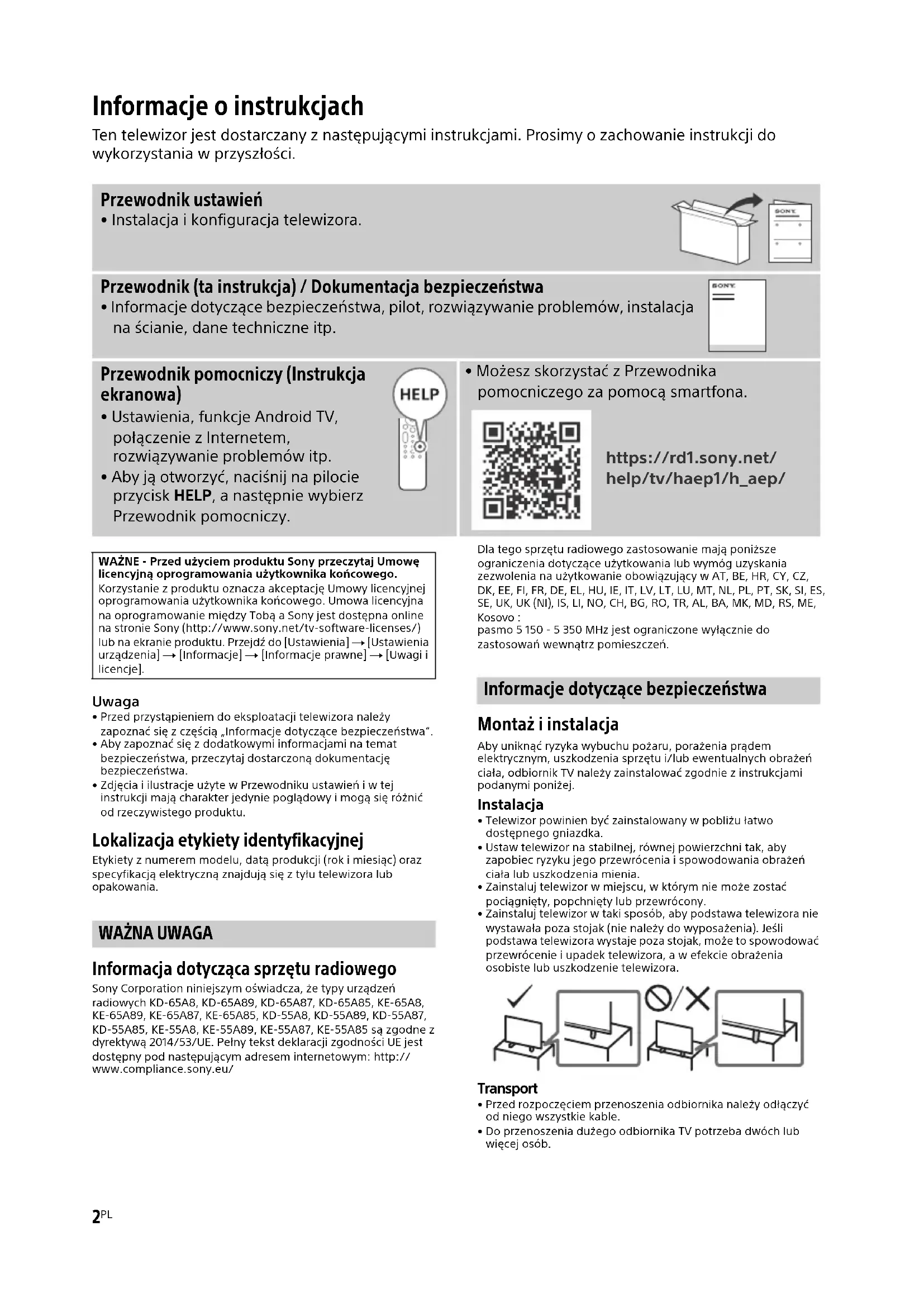 Informacja dotycząca sprzętu radiowego Sony Corporation niniejszym oświadcza, że typy urządzeń radiowych KD-65A8, KD-65A89, KD-65A87, KD-65A85, KE-65A8, KE-65A89, KE-65A87, KE-65A85, KD-55A8, KD-55A89, KD-55A87, KD-55A85, KE-55A8, KE-55A89, KE-55A87, KE-55A85 są zgodne z dyrektywą 2014/53/UE. Pełny tekst deklaracji zgodności UE jest dostępny pod następującym adresem internetowym: http://www.compliance.sony.eu/Dla tego sprzętu radiowego zastosowanie mają poniższe ograniczenia dotyczące użytkowania lub wymóg uzyskania zezwolenia na użytkowanie obowiązujący w AT, BE, HR, CY, CZ, DK, EE, FI, FR, DE, EL, HU, IE, IT, LV, LT, LU, MT, NL, PL, PT, SK, SI, ES, SE, UK, UK (NI), IS, LI, NO, CH, BG, RO, TR, AL, BA, MK, MD, RS, ME, Kosovo :pasmo 5 150 - 5 350 MHz jest ograniczone wyłącznie do zastosowań wewnątrz pomieszczeń. Informacje dotyczące bezpieczeństwa Montaż i instalacja Aby uniknąć ryzyka wybuchu pożaru, porażenia prądem elektrycznym, uszkodzenia sprzętu i/lub ewentualnych obrażeń ciała, odbiornik TV należy zainstalować zgodnie z instrukcjami podanymi poniżej. Instalacja