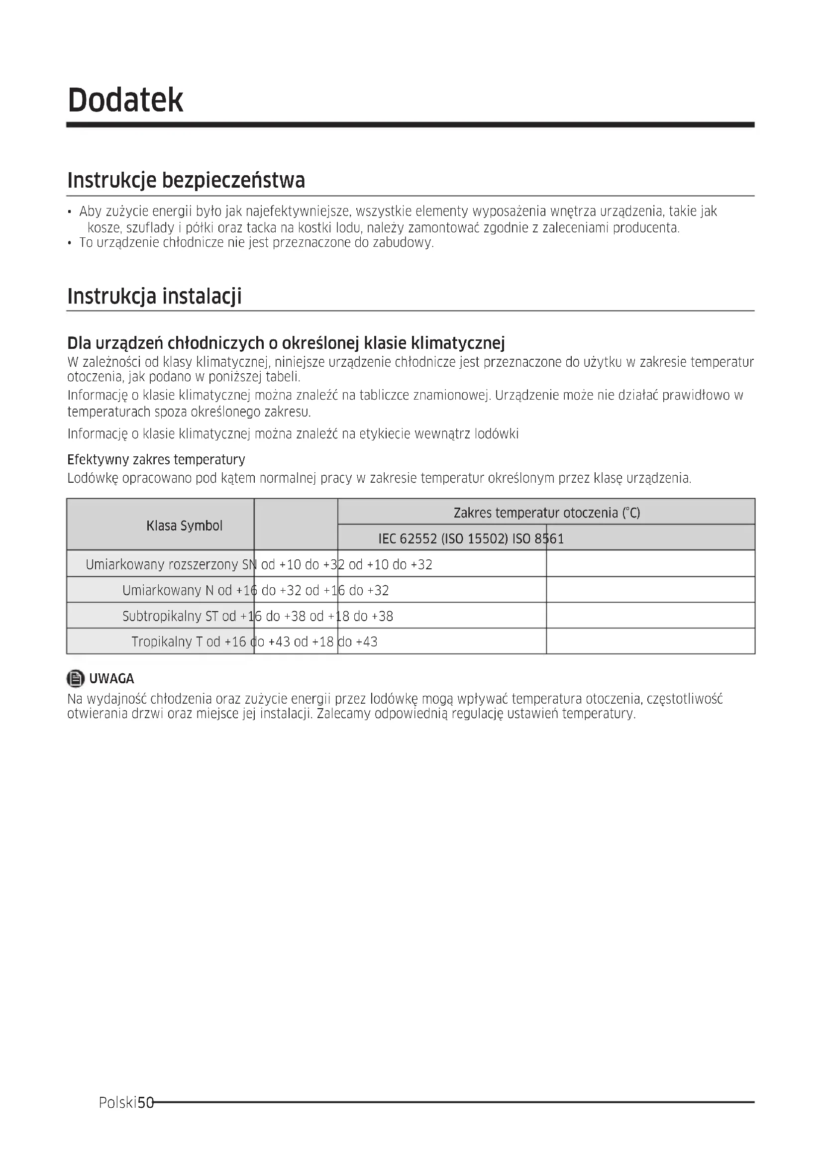 - To urządzenie chłodnicze nie jest przeznaczone do zabudowy. Instrukcja instalacji Dla urządzeń chłodniczych o określonej klasie klimatycznej W zależności od klasy klimatycznej, niniejsze urządzenie chłodnicze jest przeznaczone do użytku w zakresie temperatur otoczenia, jak podano w poniższej tabeli. Informację o klasie klimatycznej można znaleźć na tabliczce znamionowej. Urządzenie może nie działać prawidłowo w temperaturach spoza określonego zakresu. Informację o klasie klimatycznej można znaleźć na etykiecie wewnątrz lodówki Efektywny zakres temperatury Lodówkę opracowano pod kątem normalnej pracy w zakresie temperatur określonym przez klasę urządzenia. Klasa Symbol Zakres temperatur otoczenia (°C)