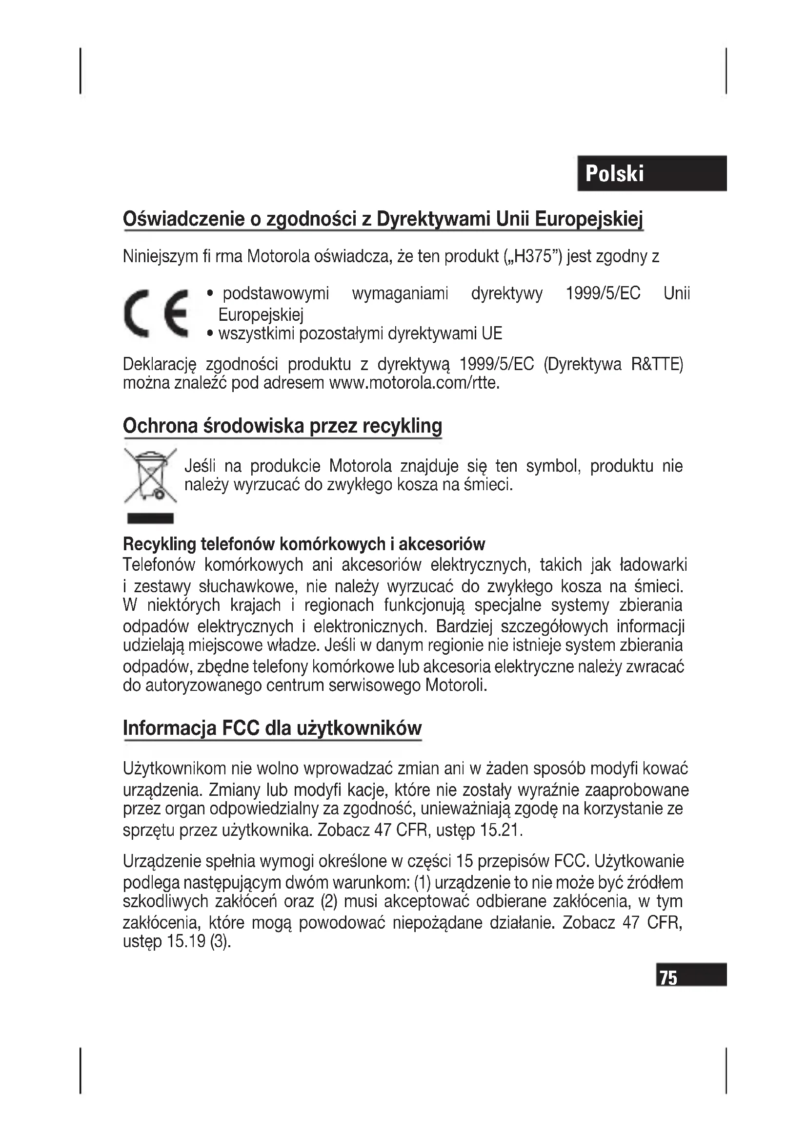Oświadczenie o zgodności z Dyrektywami Unii Europejskiej Niniejszym fi rma Motorola oświadcza, że ten produkt („H375”) jest zgodny z