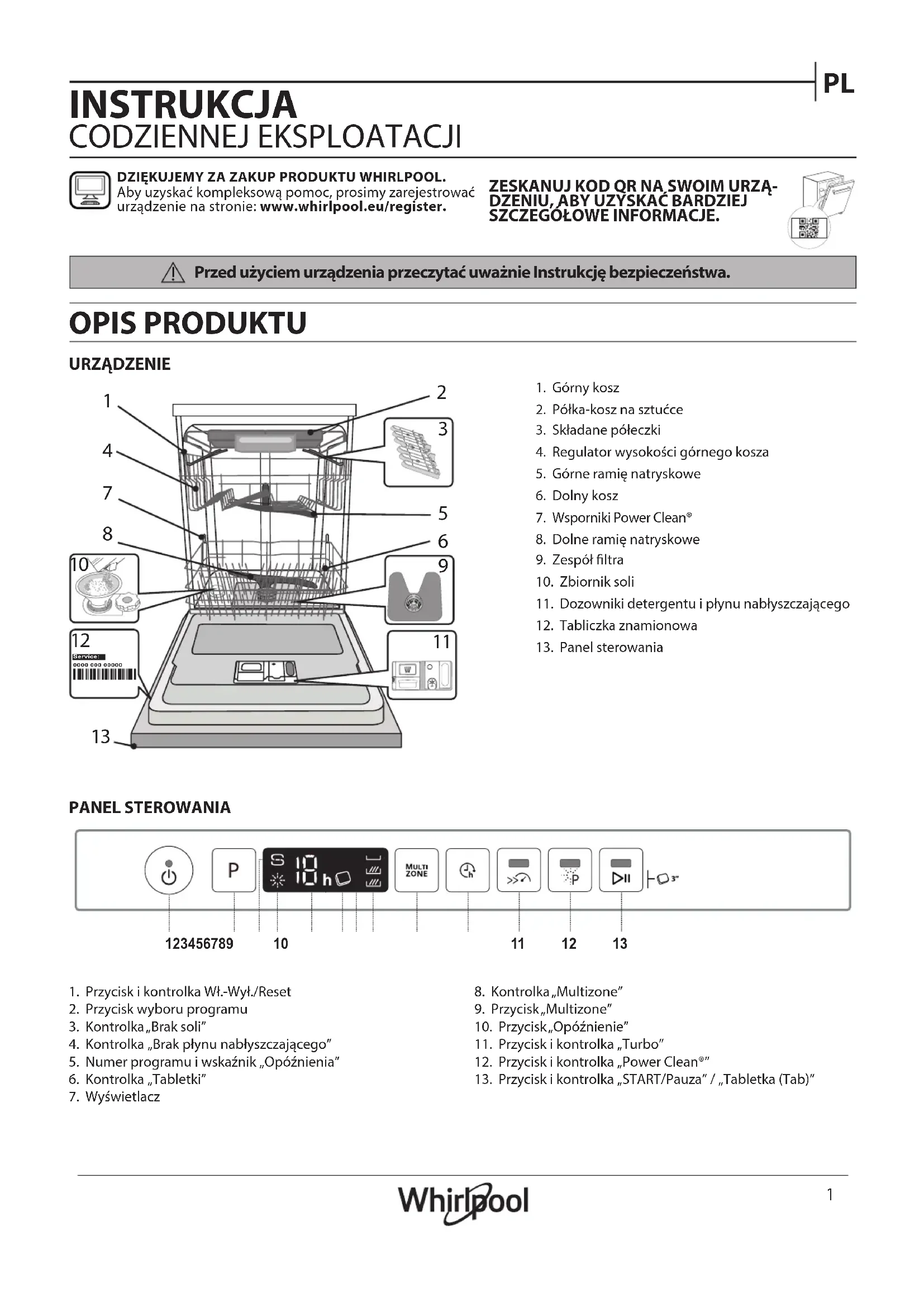 1 2 3 4 5 6 7 8 9 1011 12 13DZIĘKUJEMY ZA ZAKUP PRODUKTU WHIRLPOOL. Aby uzyskać kompleksową pomoc, prosimy zarejestrować urządzenie na stronie: www.whirlpool.eu/register.Przed użyciem urządzenia przeczytać uważnie Instrukcję bezpieczeństwa. ZESKANUJ KOD QR NA SWOIM URZĄ-DZENIU, ABY UZYSKAĆ BARDZIEJ SZCZEGÓŁOWE INFORMACJE.2