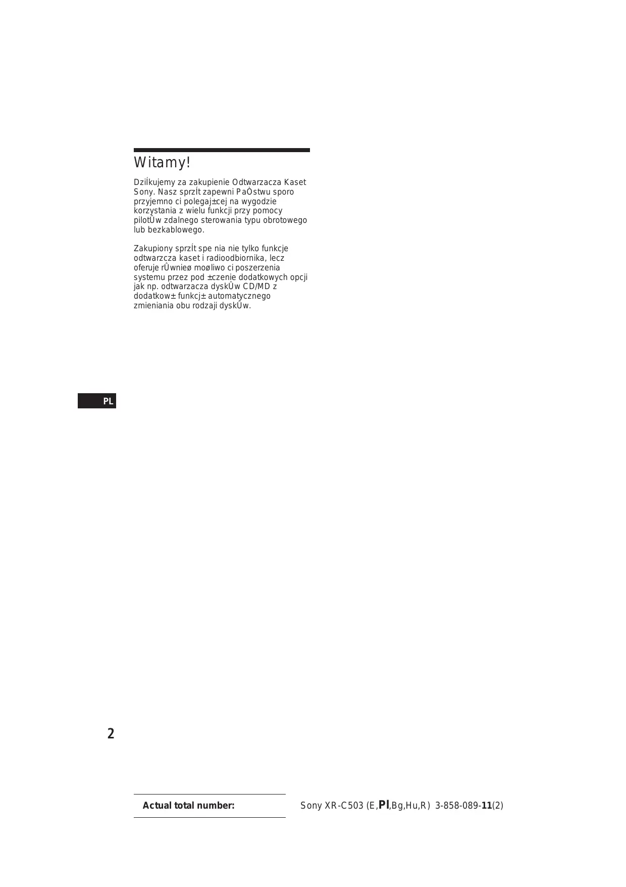 Actual total number: Sony XR-C503 (E,Pl,Bg,Hu,R) 3-858-089-11(2) Witamy! DziÍkujemy za zakupienie Odtwarzacza Kaset Sony. Nasz sprzÍt zapewni PaÒstwu sporo przyjemno ci polegaj±cej na wygodzie korzystania z wielu funkcji przy pomocy pilotÛw zdalnego sterowania typu obrotowego lub bezkablowego. Zakupiony sprzÍt spe nia nie tylko funkcje odtwarzcza kaset i radioodbiornika, lecz oferuje rÛwnieø moøliwo ci poszerzenia systemu przez pod ±czenie dodatkowych opcji jak np. odtwarzacza dyskÛw CD/MD z dodatkow± funkcj± automatycznego zmieniania obu rodzaji dyskÛw.