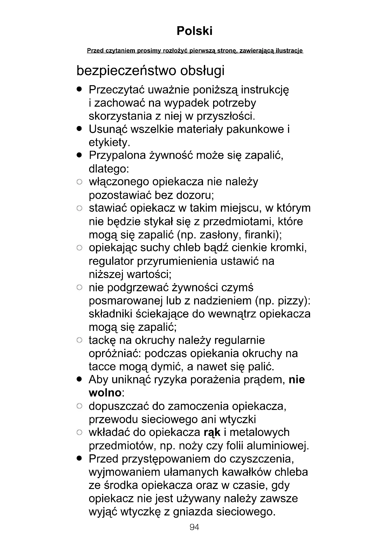 Przed przystępowaniem do czyszczenia, wyjmowaniem ułamanych kawałków chleba ze środka opiekacza oraz w czasie, gdy opiekacz nie jest używany należy zawsze wyjąć wtyczkę z gniazda sieciowego. Polski Przed czytaniem prosimy roz¢o¯yç pierwszå stronë, zawierajåcå ilustracjeEnglish