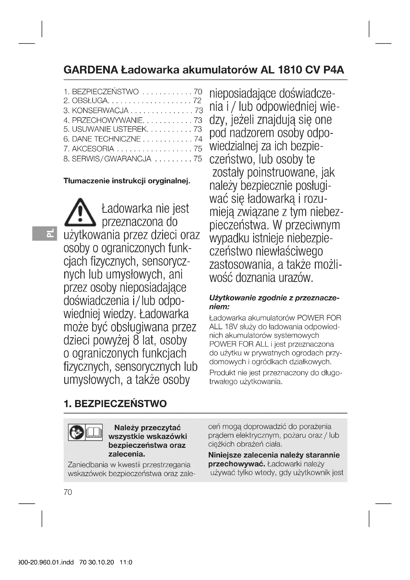 Należy przeczytać wszystkie wskazówki bezpieczeństwa oraz zalecenia. Zaniedbania w kwestii przestrzegania wskazówek bezpieczeństwa oraz zale- ceń mogą doprowadzić do porażenia prądem elektrycznym, pożaru oraz / lub ciężkich obrażeń ciała. Niniejsze zalecenia należy starannie przechowywać. Ładowarki należy używać tylko wtedy, gdy użytkownik jest GARDENA Ładowarka akumulatorów AL 1810 CV P4A
