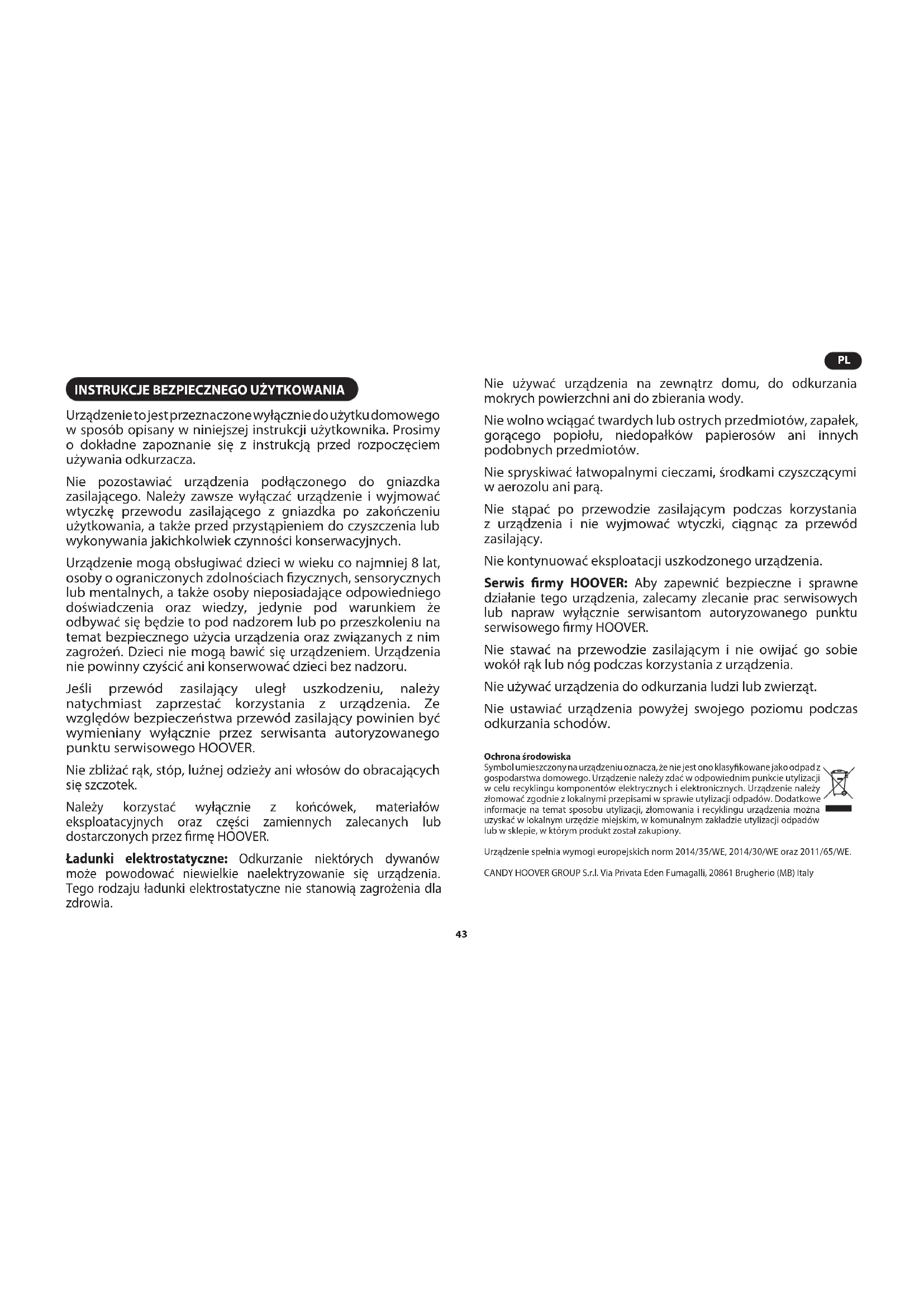- Μήπως υπερθερμάνθηκε η σκούπα; Εάν ναι, η αυτόματη επαναφορά θα διαρκέσει περίπου 30 λεπτά.INSTRUKCJE BEZPIECZNEGO UŻYTKOWANIA Urządzenie to jest przeznaczone wyłącznie do użytku domowego w sposób opisany w niniejszej instrukcji użytkownika. Prosimy o dokładne zapoznanie się z instrukcją przed rozpoczęciem używania odkurzacza. Nie pozostawiać urządzenia podłączonego do gniazdka zasilającego. Należy zawsze wyłączać urządzenie i wyjmować wtyczkę przewodu zasilającego z gniazdka po zakończeniu użytkowania, a także przed przystąpieniem do czyszczenia lub wykonywania jakichkolwiek czynności konserwacyjnych. Urządzenie mogą obsługiwać dzieci w wieku co najmniej 8 lat, osoby o ograniczonych zdolnościach zycznych, sensorycznych lub mentalnych, a także osoby nieposiadające odpowiedniego doświadczenia oraz wiedzy, jedynie pod warunkiem że odbywać się będzie to pod nadzorem lub po przeszkoleniu na temat bezpiecznego użycia urządzenia oraz związanych z nim zagrożeń. Dzieci nie mogą bawić się urządzeniem. Urządzenia nie powinny czyścić ani konserwować dzieci bez nadzoru. Jeśli przewód zasilający uległ uszkodzeniu, należy natychmiast zaprzestać korzystania z urządzenia. Ze względów bezpieczeństwa przewód zasilający powinien być wymieniany wyłącznie przez serwisanta autoryzowanego punktu serwisowego HOOVER. Nie zbliżać rąk, stóp, luźnej odzieży ani włosów do obracających się szczotek. Należy korzystać wyłącznie z końcówek, materiałów eksploatacyjnych oraz części zamiennych zalecanych lub dostarczonych przez rmę HOOVER. Ładunki elektrostatyczne: Odkurzanie niektórych dywanów może powodować niewielkie naelektryzowanie się urządzenia. Tego rodzaju ładunki elektrostatyczne nie stanowią zagrożenia dla zdrowia. Nie używać urządzenia na zewnątrz domu, do odkurzania mokrych powierzchni ani do zbierania wody. Nie wolno wciągać twardych lub ostrych przedmiotów, zapałek, gorącego popiołu, niedopałków papierosów ani innych podobnych przedmiotów. Nie spryskiwać łatwopalnymi cieczami, środkami czyszczącymi w aerozolu ani parą. Nie stąpać po przewodzie zasilającym podczas korzystania z urządzenia i nie wyjmować wtyczki, ciągnąc za przewód zasilający. Nie kontynuować eksploatacji uszkodzonego urządzenia. Serwis rmy HOOVER: Aby zapewnić bezpieczne i sprawne działanie tego urządzenia, zalecamy zlecanie prac serwisowych lub napraw wyłącznie serwisantom autoryzowanego punktu serwisowego rmy HOOVER. Nie stawać na przewodzie zasilającym i nie owijać go sobie wokół rąk lub nóg podczas korzystania z urządzenia. Nie używać urządzenia do odkurzania ludzi lub zwierząt. Nie ustawiać urządzenia powyżej swojego poziomu podczas odkurzania schodów. Ochrona środowiska Symbol umieszczony na urządzeniu oznacza, że nie jest ono klasykowane jako odpad z gospodarstwa domowego. Urządzenie należy zdać w odpowiednim punkcie utylizacji w celu recyklingu komponentów elektrycznych i elektronicznych. Urządzenie należy złomować zgodnie z lokalnymi przepisami w sprawie utylizacji odpadów. Dodatkowe informacje na temat sposobu utylizacji, złomowania i recyklingu urządzenia można uzyskać w lokalnym urzędzie miejskim, w komunalnym zakładzie utylizacji odpadów lub w sklepie, w którym produkt został zakupiony. Urządzenie spełnia wymogi europejskich norm 2014/35/WE, 2014/30/WE oraz 2011/65/WE. CANDY HOOVER GROUP S.r.l. Via Privata Eden Fumagalli, 20861 Brugherio (MB) Italy