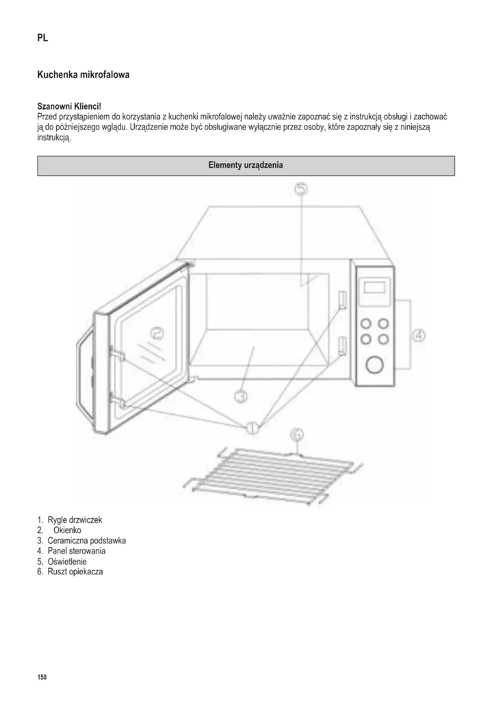 PL151 Elementy panelu sterowania Przycisk Funkcja Dźwięki przycisków i zabezpieczenie przed dzieckiem Ulubione danie i zegar Szybki start / Przedłużanie czasu gotowania o 30 sekund Mikrofale Opiekanie Połączenie opiekacza i mikrofal Przerwij /Stop Pokrętło Funkcja Nacisnąć Start / Szybki start Obrócić Czas &Automatyczne programy gotowania152 Wyświetlacz Wyświetlacza pokazuje aktualną godzinę albo, w trakcie pracy urządzenia, zaprogramowany czas pracy oraz wybrane funkcje. Programy automatyczne Wybór pierwszego programu Wybór drugiego programu Rozmrażaniewgwagi Zabezpieczenie przed dzieckiem Temperatura Ustawianie zegara Waga Funkcja opiekacza Funkcja mikrofal Programy automatyczne Rozmrażaniewgczasu153 Instrukcjabezpieczeństwa Instrukcjabezpieczeństwa Proszędokładniezapoznaćsięzponiższąinstrukcjąizachowaćjądowglądu. Podłączeniedoźródłazasilania Urządzenie należy podłączyć wyłącznie do uziemionego gniazda zasilania elektrycznego, zainstalowanego zgodnie z wymogami bezpieczeństwa. Należy upewnić się, czy napięcie zasilania jest zgodne z napięciem podanym na tabliczce znamionowej urządzenia. Niniejszy wyrób odpowiada wszelkim obowiązującym zaleceniom UE dot. znakowania produktów. Wybórmiejscadlaurządzenia ∙ Urządzenie należy umieścić na stabilnej, równej powierzchni, odpornej na wysokie temperatury i znajdującej się w dużej odległości od jakiegokolwiek źródła ciepła oraz nadmiernej wilgoci. ∙ Kuchenki mikrofalowej nie można używać na wolnym powietrzu. ∙ Nie wyjmować stopek, na których stoi piekarnik. ∙ Należy zapewnić dostateczny i stały przepływ powietrza. Na kuchence nie należy kłaść żadnych przedmiotów, a ponadto należy zapewnić, by wolna przestrzeń wokół urządzenia była nie mniejsza niż podano poniżej: Po bokach: 7,5 cm Z tyłu: 7,5 cm Z góry: 30,0 cm Urządzenia nie wolno instalować wewnątrz szafki, bezpośrednio pod szafką lub pod innymi urządzeniami. Ważnewskazówki ∙ Ostrzeżenie:Niektórerodzajeżywnościmogąsięłatwozapalić.Wżadnym wypadkuniewolnopozostawiaćwłączonegourządzeniabeznadzoruw czasiepracykuchenkimikrofalowej,opiekaczaczyteżichkombinacji. ∙ Kuchenka mikrofalowa jest przeznaczona wyłącznie do rozmrażania, podgrzewania i gotowania potraw. Ostrzeżenie: Wszelkie próby suszenia żywności lub części garderoby, podgrzewania wkładek rozgrzewających, kapci, gąbek, mokrych ubrań itp. mogą doprowadzić do obrażeń ciała, spalenia lub pożaru. ∙ Producent nie ponosi odpowiedzialności za szkody wynikłe wskutek nieprawidłowego korzystania z urządzenia bądź niestosowania się do niniejszej instrukcji.154 ∙ Należy używać wyłącznie naczyń odpowiednich do stosowania w kuchenkach mikrofalowych. Do podgrzewania lub gotowania dań lub napojów z użyciem funkcji mikrofal nie należy używać metalowych naczyń. Więcej informacji na ten temat można znaleźć w punkcie pt. „Stosowanie odpowiednich naczyń kuchennych”. ∙ Urządzenie nie jest przystosowane do bycia uruchamianym przy użyciu zewnętrznego czasomierza lub odrębnego systemu zdalnego sterowania. ∙ Osoby o ograniczonych zdolnościach zycznych, czuciowych lub psychicznych albo nieposiadające stosownego doświadczenia lub wiedzy, a także dzieci (w wieku co najmniej 8 lat), mogą korzystać z urządzenia, pod warunkiem że znajdują się pod nadzorem lub zostały poinstruowane, jak używać urządzenia i są w pełni świadome wszelkich zagrożeń i wymaganych środków ostrożności. ∙ Nie dopuszczać do używania urządzenia jako zabawki przez dzieci. ∙ Nie wolno pozwalać dzieciom na wykonywanie jakichkolwiek prac związanych bezpośrednio z konserwacją lub czyszczeniem urządzenia, a jeżeli już, to dziecko musi mieć co najmniej 8 lat i być nadzorowane przez osobę dorosłą. ∙ Nie dopuszczać do urządzenia i jego przewodu zasilającego dzieci poniżej 8 lat. ∙ Zanurzanie urządzenia w wodzie i mycie go wodą jest niedozwolone i może grozić porażeniem prądem. ∙ Ostrzeżenie: Ze względu na wysokie temperatury powstające podczas korzystania z opiekacza i/lub programów łączonych, dzieci mogą korzystać z urządzenia wyłącznie pod nadzorem osoby dorosłej. ∙ Korzystając z opiekacza i/lub programu łączonego, zachować szczególną ostrożność i nie dotykać elementów grzewczych, znajdujących się wewnątrz. ∙ Nie należy również stosować urządzeń wytwarzających parę pod ciśnieniem. ∙ Urządzenie należy wyłączyć i wyjąć wtyczkę przewodu zasilającego z gniazdka elektrycznego: - przed przystąpieniem do czyszczenia lub mycia; - w przypadku stwierdzenia wadliwego działania; - po zakończeniu pracy. ∙ Wyjmując wtyczkę z gniazdka nigdy nie należy szarpać za przewód.
