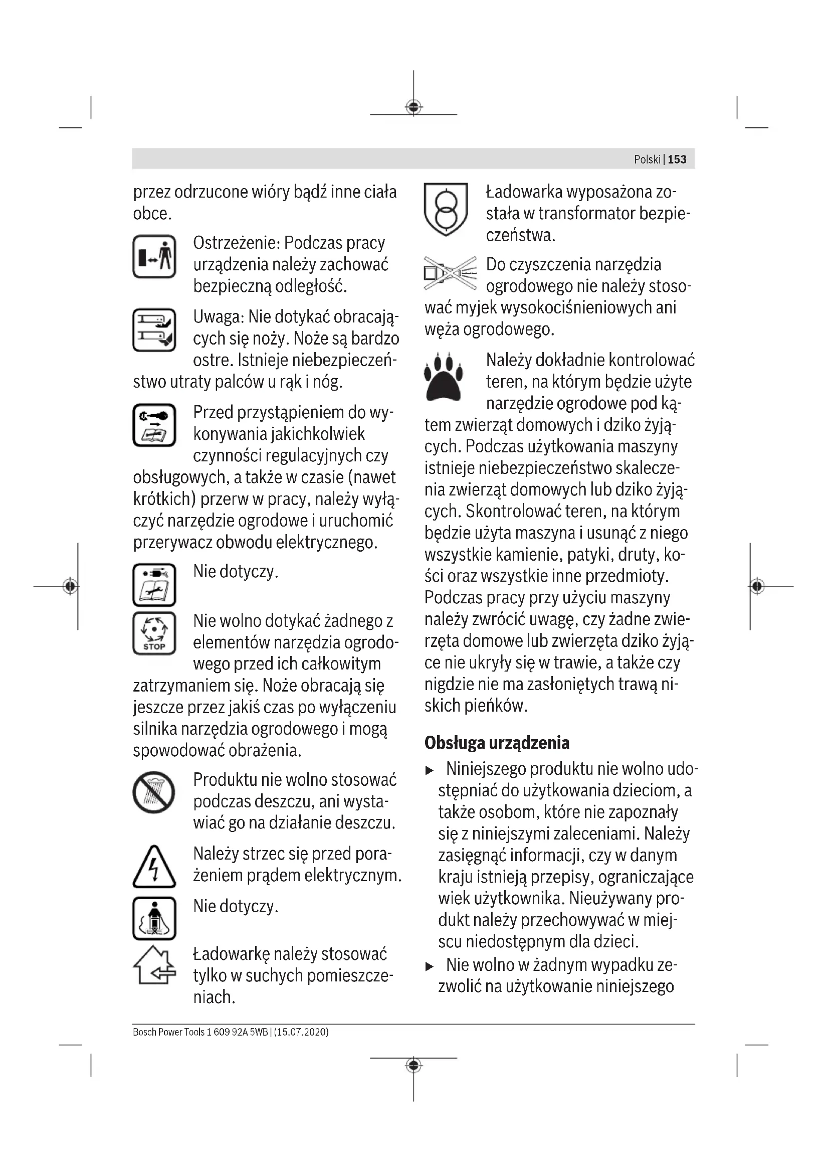 Karasoku Mahallesi 28028. Sokak No:20/A Merkez / ADANA Tel.: +903223599710 -3521379 Fax: +903223591323 E-mail: isiklar@isiklarelektrik.com Diğer servis adreslerini şurada bulabilirsiniz: www.bosch-pt.com/serviceaddresses Taşıma Alet içindeki lityum iyon (Li-Ion) aküler tehlikeli madde taşıma yönetmeliği hükümlerine tabidir. Akuler başka bir yukumluluk olmaksızın kullanıcı tarafından caddeler uzerinde taşınabilir. Üçüncü kişiler aracılığıyla yollamada (örneğin hava yolu veya nakliye şirketi ile yollamada) ambalaj ve etiketlemeye ait özel hükümlere uyulmalıdır. Bu konuda gönderi hazırlanırken bir tehlikeli madde uzmanından yardım alınmalıdır. Aküleri sadece gövdeleri hasarsız durumda gönderin. Açık kontakların üzerini kapatınız ve aküyü ambalaj içinde hareket etmeyecek biçimde paketleyiniz. Lutfen olası ek ulusal yönetmelik hukumlerine de uyun. Tasfiye Bahçe aletleri, aküler, aksesuar ve ambalaj malzemesi çevre dostu bir biçimde tasfiye edilmek üzere geri dönüşüm merkezine yollanmak zorundadır. Bahçe aletlerini ve aküleri/bataryaları evsel çöplerin içine atmayın! Sadece AB üyesi ülkeler için: 2012/19/EU yönetmeliği uyarınca kullanım ömrünü tamamlamış elektronik ve elektrikli aletler ve 2006/66/EC yönetmeliği uyarınca arızalı veya kullanım ömrünü tamamlamış aküler/bataryalar ayrı ayrı toplanmak ve çevre dostu tasfiye için geri kazanım merkezlerine gönderilmek zorundadır. Aküler/Bataryalar: Li-Ion: Lütfen Nakliye bölümündeki uyarı ve açıklamalara uyun. Polski Wskazówki bezpieczeństwa Uwaga! Poniższe wskazówki należy dokładnie przeczytać. Należy zapo- znać się z elementami sterującymi i prawidłową obsługą zakupionego produktu. Instrukcję eksploatacji należy zachować istarannie prze- chowywać w celu dalszego zastoso- wania. Wyjaśnienie symboli umieszczonych na narzędziu ogrodowym Ogólna wskazówka ostrzega- jąca przed potencjalnym za- grożeniem. Przed przystąpieniem do pra- cy należy przeczytać niniejszą instrukcję eksploatacji. Należy zwrócić uwagę, aby osoby znajdujące się w pobli- żu nie zostały skaleczone 1 609 92A 5WB | (15.07.2020) Bosch Power ToolsPolski | 153 przez odrzucone wióry bądź inne ciała obce. Ostrzeżenie: Podczas pracy urządzenia należy zachować bezpieczną odległość. Uwaga: Nie dotykać obracają- cych się noży. Noże są bardzo ostre. Istnieje niebezpieczeń- stwo utraty palców u rąk i nóg. Przed przystąpieniem do wy- konywania jakichkolwiek czynności regulacyjnych czy obsługowych, a także w czasie (nawet krótkich) przerw w pracy, należy wyłą- czyć narzędzie ogrodowe i uruchomić przerywacz obwodu elektrycznego. Nie dotyczy. Nie wolno dotykać żadnego z elementów narzędzia ogrodo- wego przed ich całkowitym zatrzymaniem się. Noże obracają się jeszcze przez jakiś czas po wyłączeniu silnika narzędzia ogrodowego i mogą spowodować obrażenia. Produktu nie wolno stosować podczas deszczu, ani wysta- wiać go na działanie deszczu. Należy strzec się przed pora- żeniem prądem elektrycznym. Nie dotyczy. Ładowarkę należy stosować tylko w suchych pomieszcze- niach. Ładowarka wyposażona zo- stała w transformator bezpie- czeństwa. Do czyszczenia narzędzia ogrodowego nie należy stoso- wać myjek wysokociśnieniowych ani węża ogrodowego. Należy dokładnie kontrolować teren, na którym będzie użyte narzędzie ogrodowe pod ką- tem zwierząt domowych i dziko żyją- cych. Podczas użytkowania maszyny istnieje niebezpieczeństwo skalecze- nia zwierząt domowych lub dziko żyją- cych. Skontrolować teren, na którym będzie użyta maszyna i usunąć z niego wszystkie kamienie, patyki, druty, ko- ści oraz wszystkie inne przedmioty. Podczas pracy przy użyciu maszyny należy zwrócić uwagę, czy żadne zwie- rzęta domowe lub zwierzęta dziko żyją- ce nie ukryły się w trawie, a także czy nigdzie nie ma zasłoniętych trawą ni- skich pieńków. Obsługa urządzenia u Niniejszego produktu nie wolno udo- stępniać do użytkowania dzieciom, a także osobom, które nie zapoznały się z niniejszymi zaleceniami. Należy zasięgnąć informacji, czy w danym kraju istnieją przepisy, ograniczające wiek użytkownika. Nieużywany pro- dukt należy przechowywać w miej- scu niedostępnym dla dzieci. u Nie wolno w żadnym wypadku ze- zwolić na użytkowanie niniejszego Bosch Power Tools 1 609 92A 5WB | (15.07.2020)154 | Polski produktu dzieciom, osobom ograni- czonym fizycznie, czuciowo lub umy- słowo, a także udostępnić je osobom z niewystarczającym doświadcze- niem i/lub niedostateczną wiedzą, jak również/lub osobom, które nie zapoznały się z niniejszymi zalece- niami. Należy zasięgnąć informacji, czy w danym kraju istnieją przepisy, ograniczające wiek użytkownika. u Dzieci powinny znajdować się pod nadzorem, a produkt zabezpieczony w taki sposób, żeby nie mógł służyć do zabawy. u Nie wolno nigdy użytkować narzędzia ogrodowego, jeżeli w bezpośredniej bliskości znajdują się osoby postron- ne, w szczególności dzieci lub zwie- rzęta domowe. u Osoba obsługująca lub użytkująca urządzenie odpowiedzialna jest za wypadki i szkody na osobie i mieniu, wyrządzone innym osobom. u Do pracy nie wolno zakładać otwar- tego obuwia gumowego ani sanda- łów. Podczas pracy należy zawsze zakładać stabilne obuwie robocze i długie spodnie. Nie wolno obsługi- wać produktu boso. u Przed przystąpieniem do pracy do- kładnie zbadać teren, na którym bę- dzie użyte urządzenie i usunąć z nie- go wszystkie kamienie, gałęzie, dru- ty, kości i inne przedmioty. u Przed każdym przystąpieniem do pracy należy sprawdzić stan tech- niczny noży, śrub i zespołów tnących pod kątem ich zużycia lub uszkodze- nia. Zużyte bądź uszkodzone noże, jak i śruby, przytrzymujące noże na- leży wymieniać całymi zestawami dla zachowania prawidłowego wyw